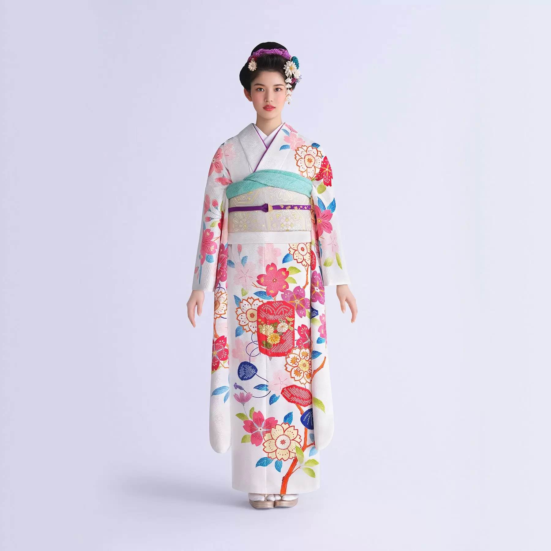 純白の地色が、これから始まる未来を明るく照らしてくれるような振袖です。地色の白が美しく映えるように、挿し色の配色にもこだわりました。