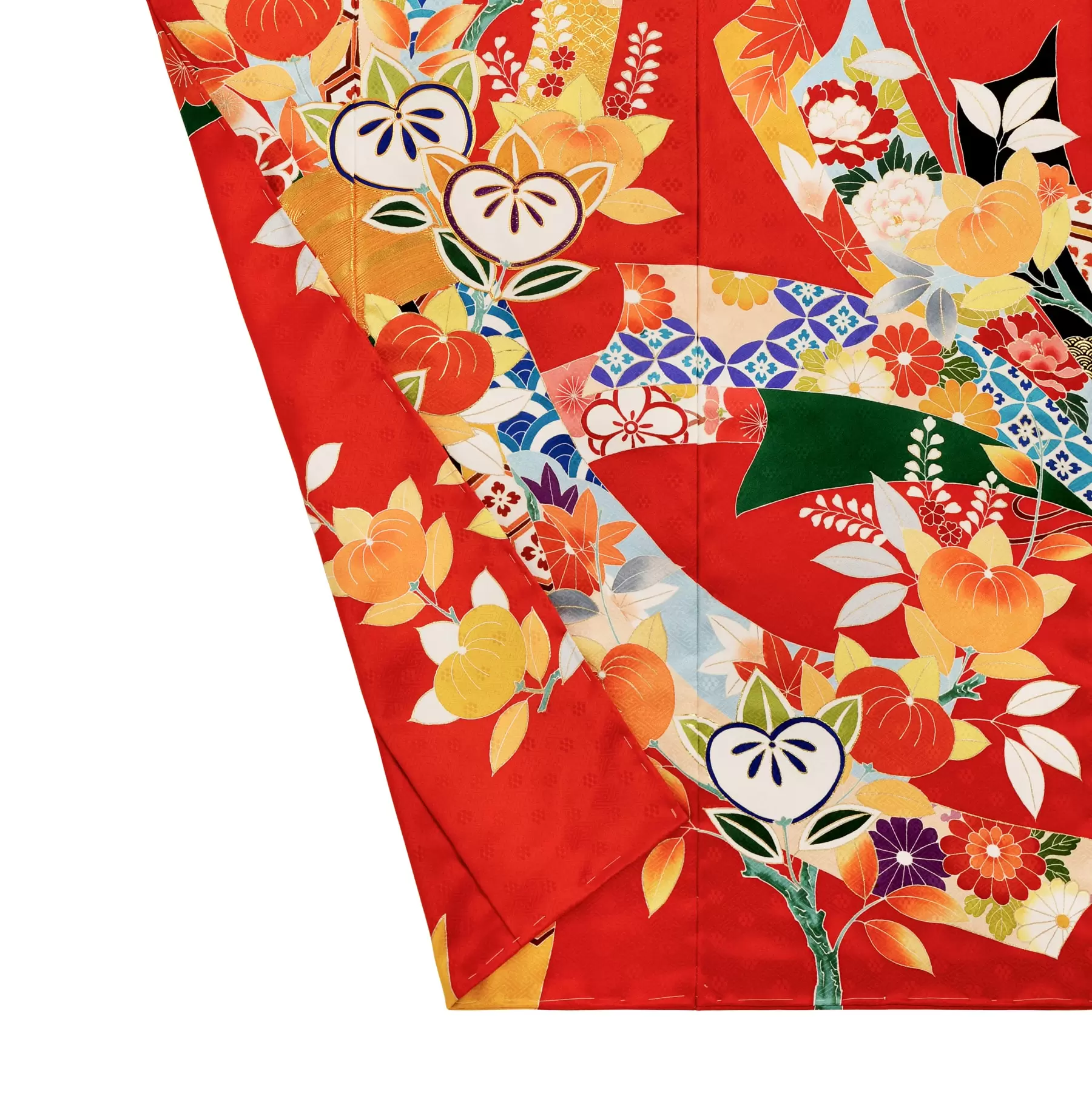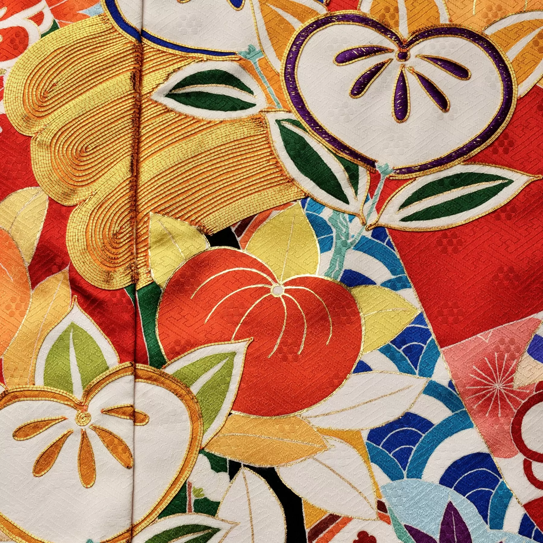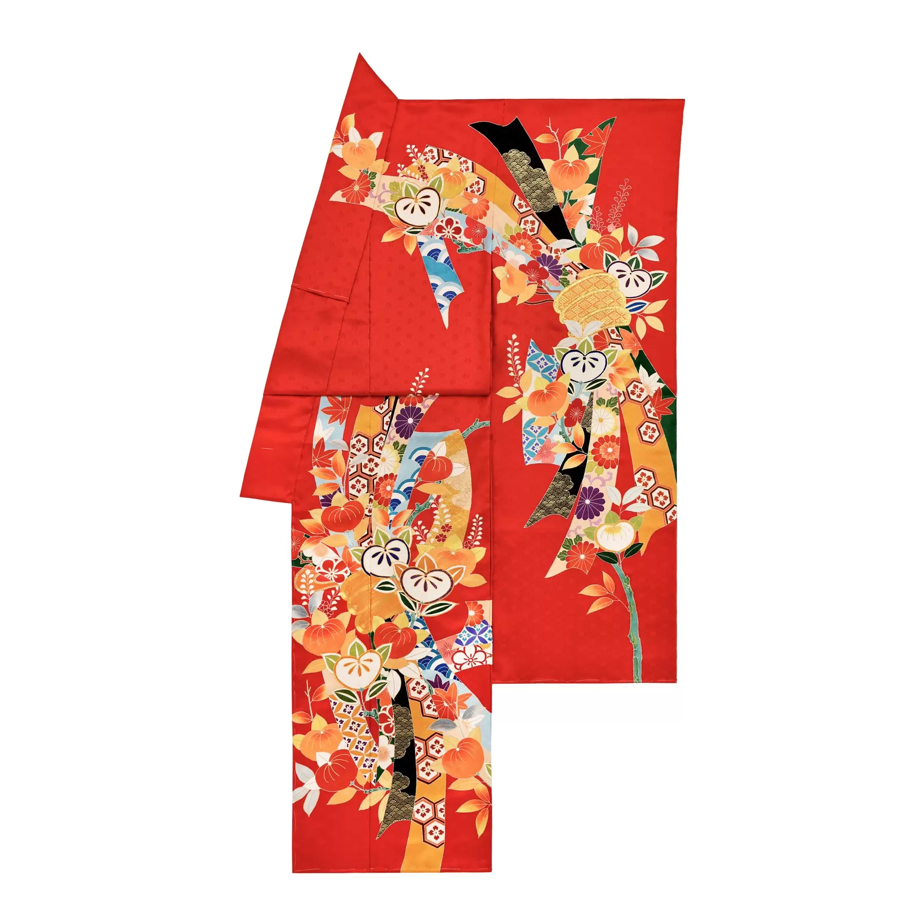 振袖で人気のある赤の地色に、束ね熨斗と橘を組み合わせた千總らしい一枚です。デザインや配色にも題材にした小袖のイメージを踏襲し、伝統の美しさを感じられる仕上がりを目指しました。