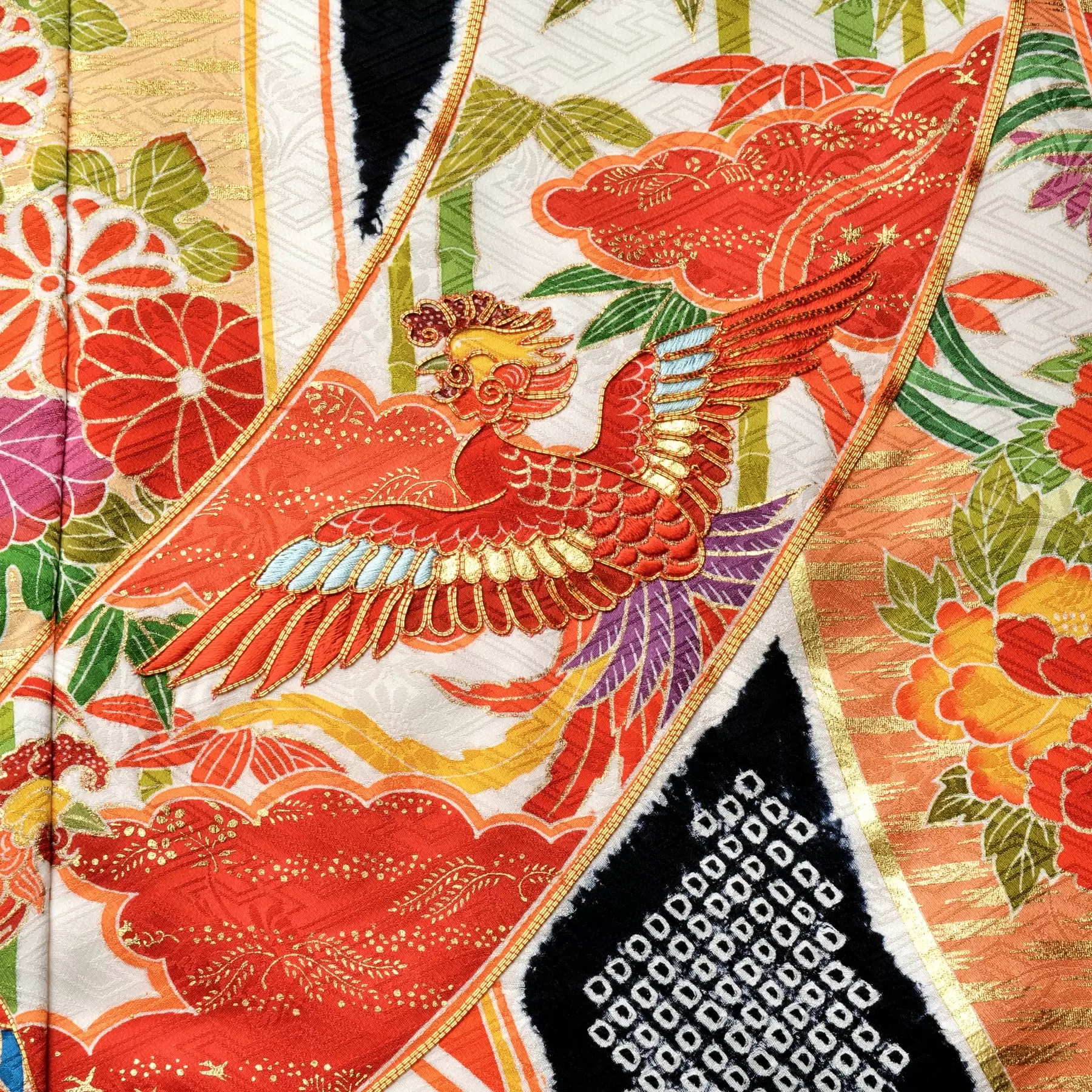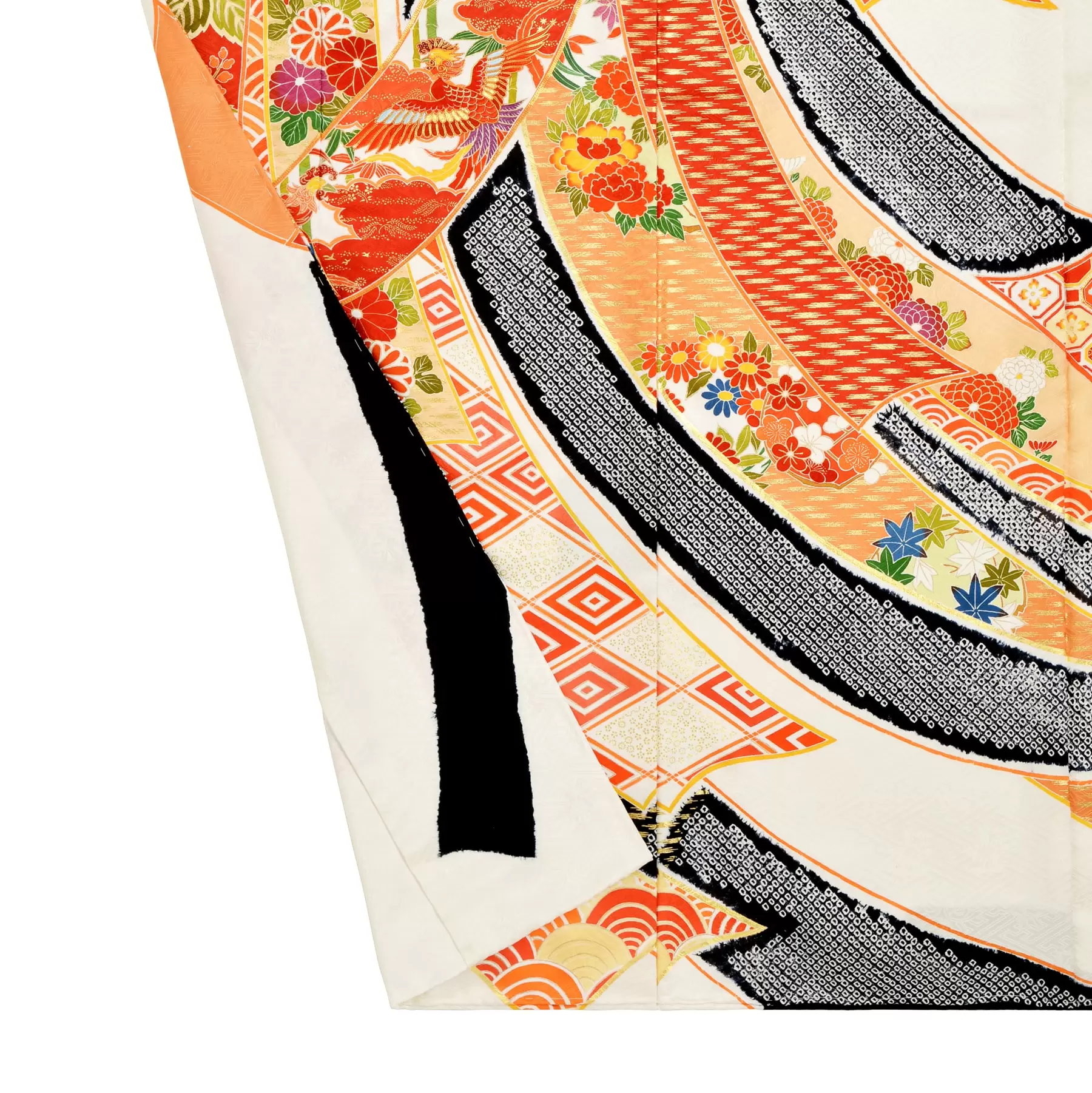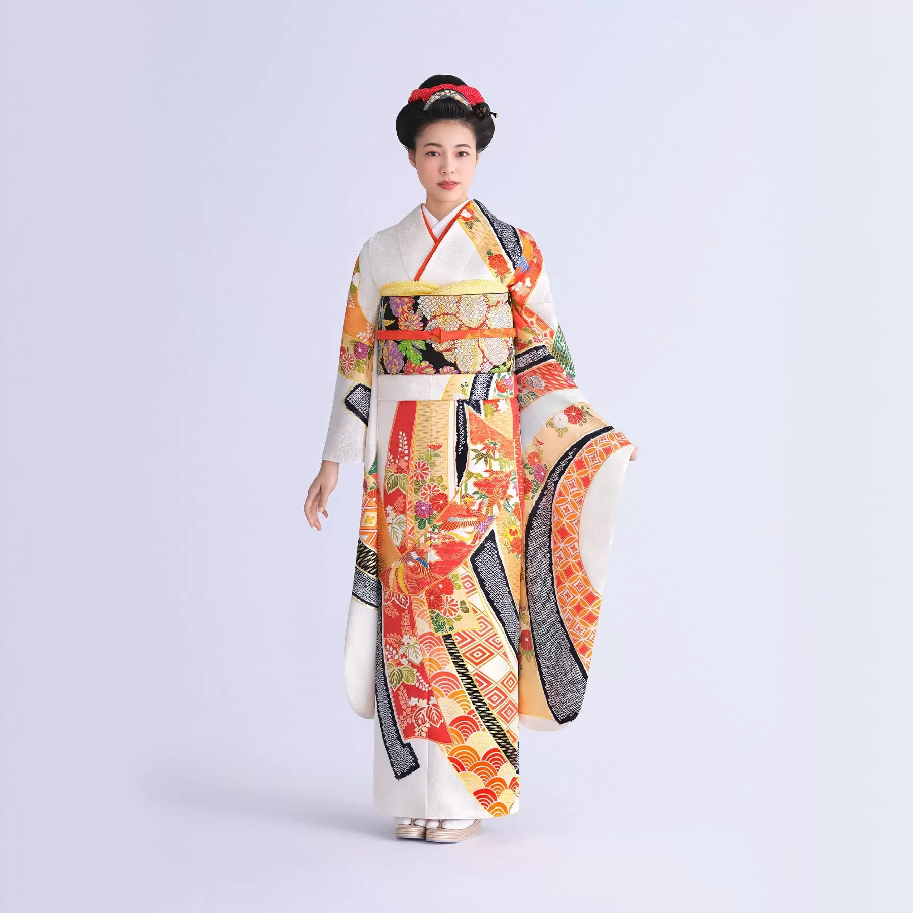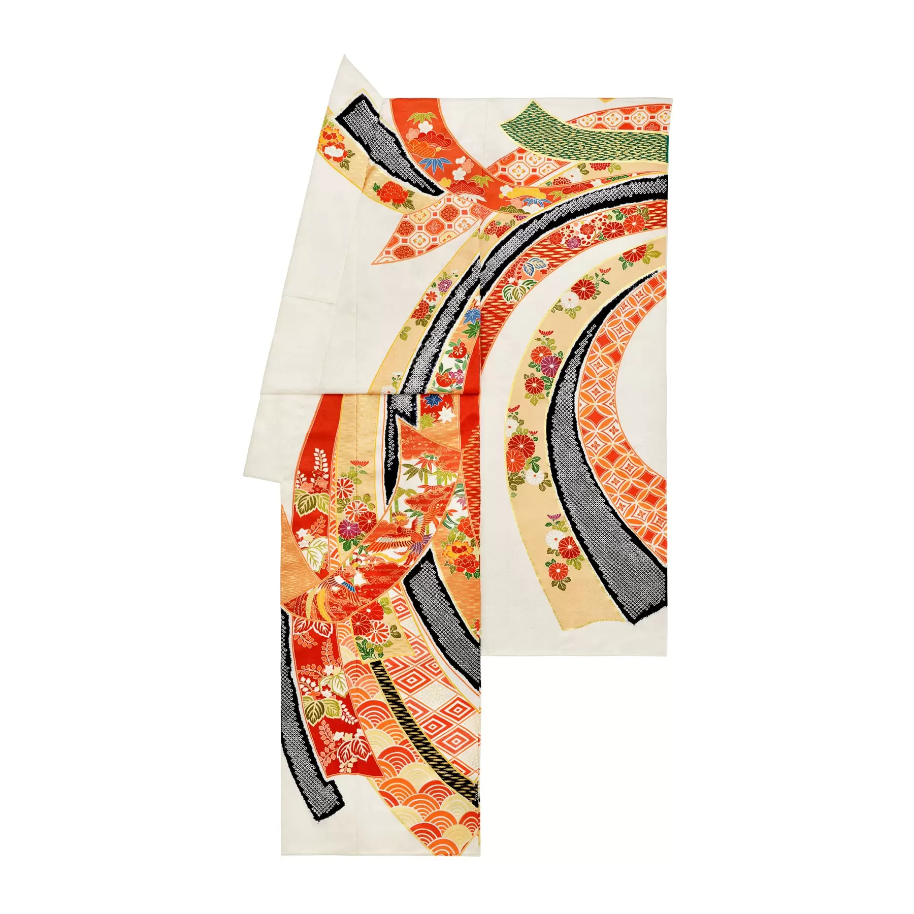 たくさんの祝福を受けて、幸せがどこまでも永く続くようにとの願いが込められた吉祥文様の束ね熨斗を大胆に構成し、振袖いっぱいに描き出しました。配色には、日本において最初に生まれた色の概念である「しろ」「あか」「くろ」「あお」の色彩を使い、古典の趣を楽しんでもらえるように仕上げました。