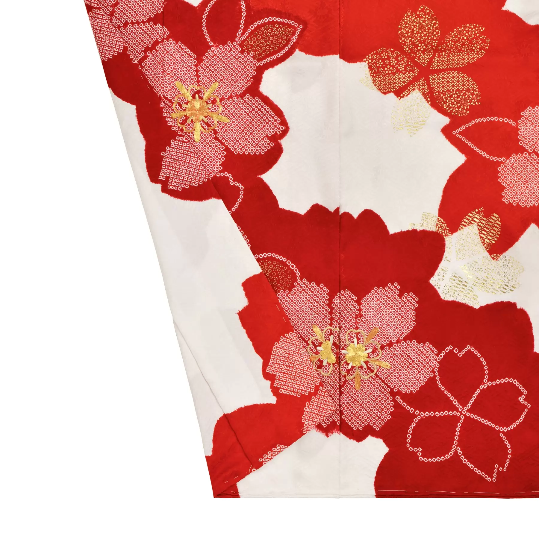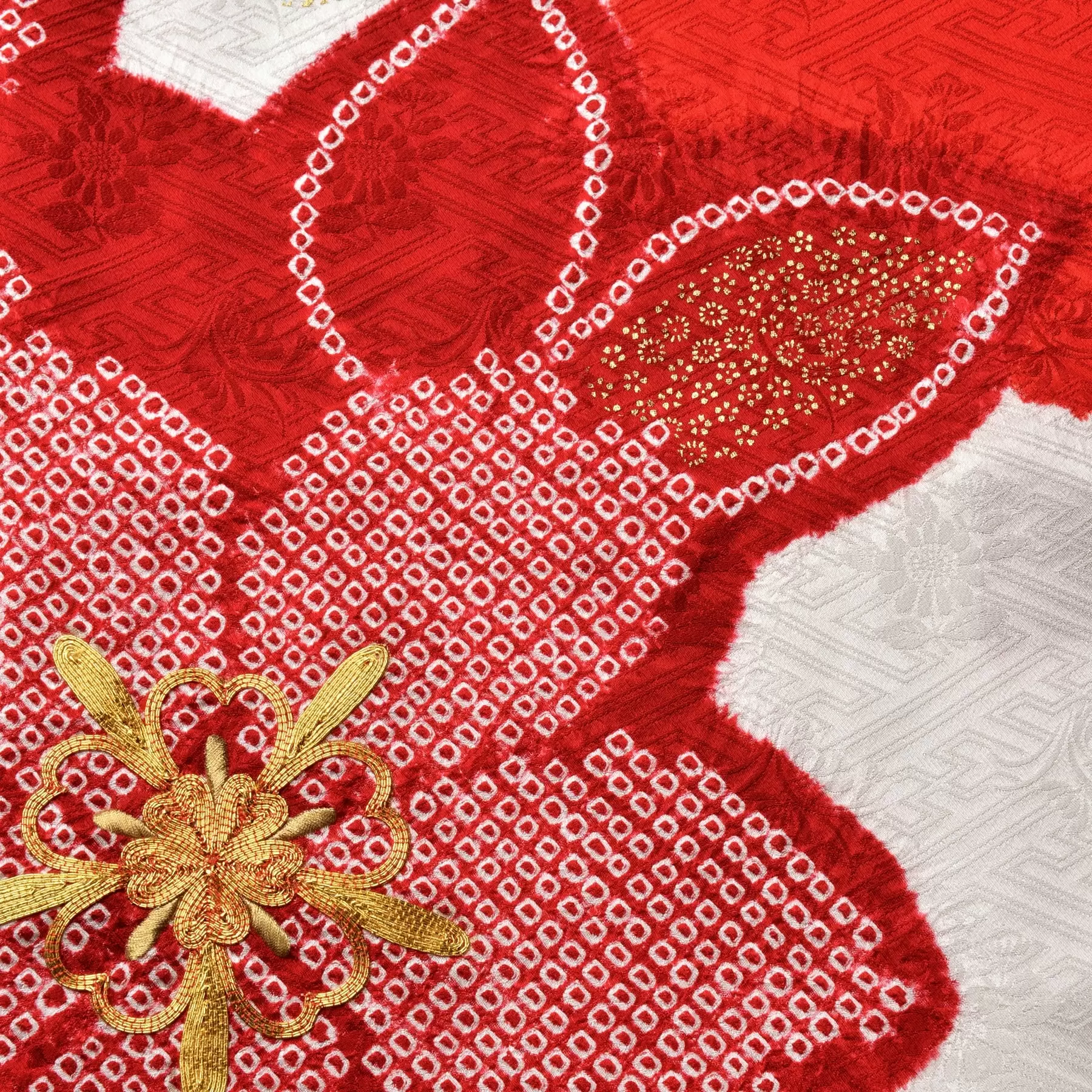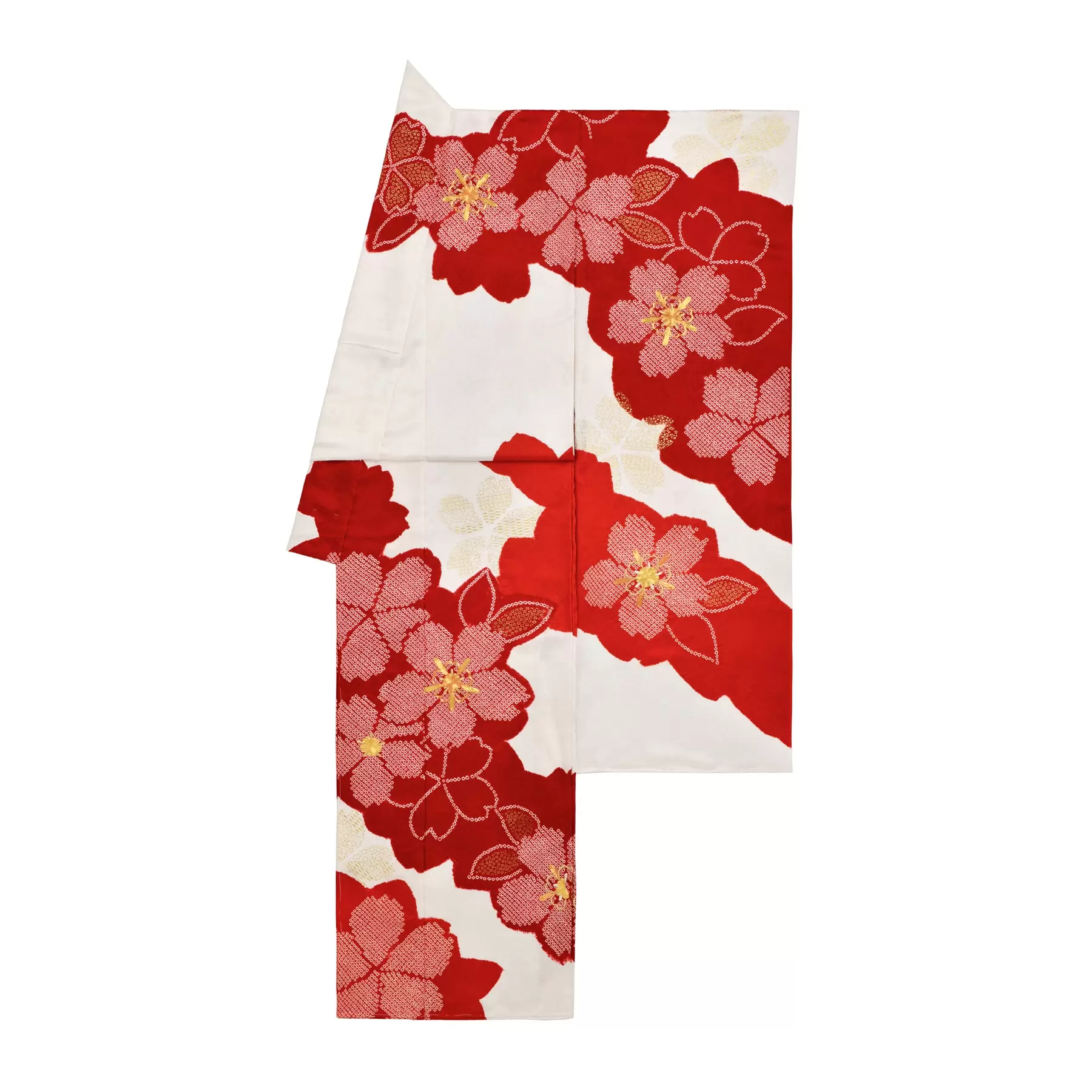 鮮やかな赤の上に浮かび上がる疋田絞りの華やかさと、地色の白と赤の鮮烈なコントラストが生み出す洗練された美が魅力の振袖です。