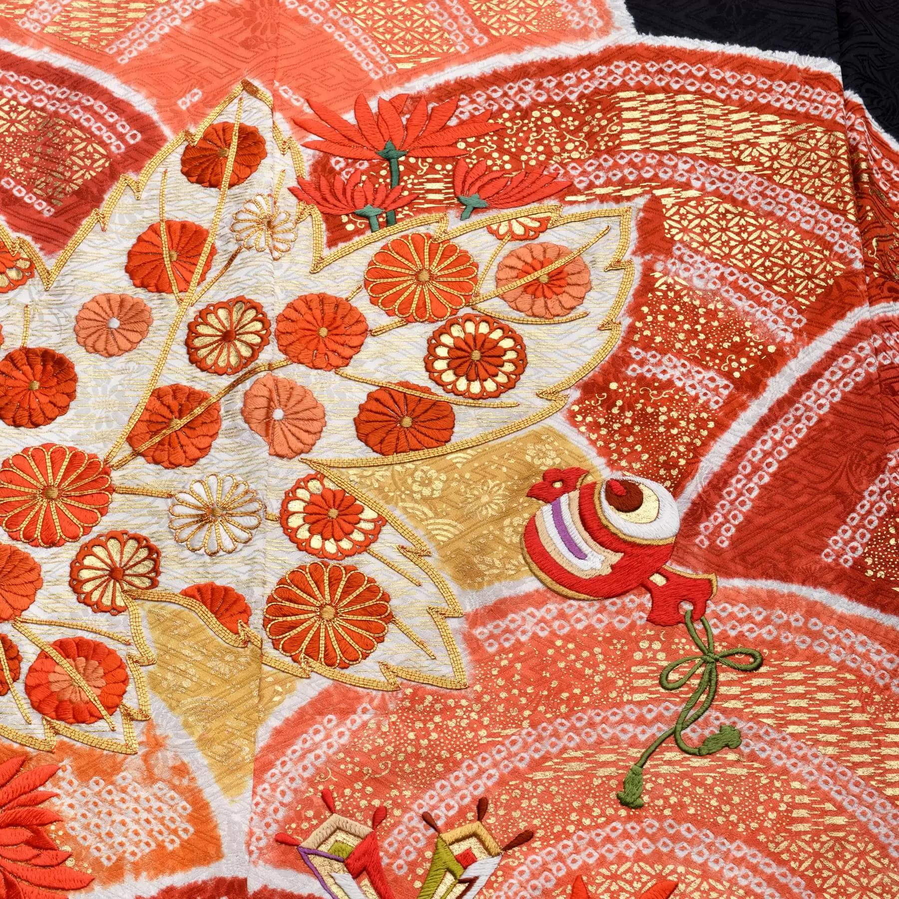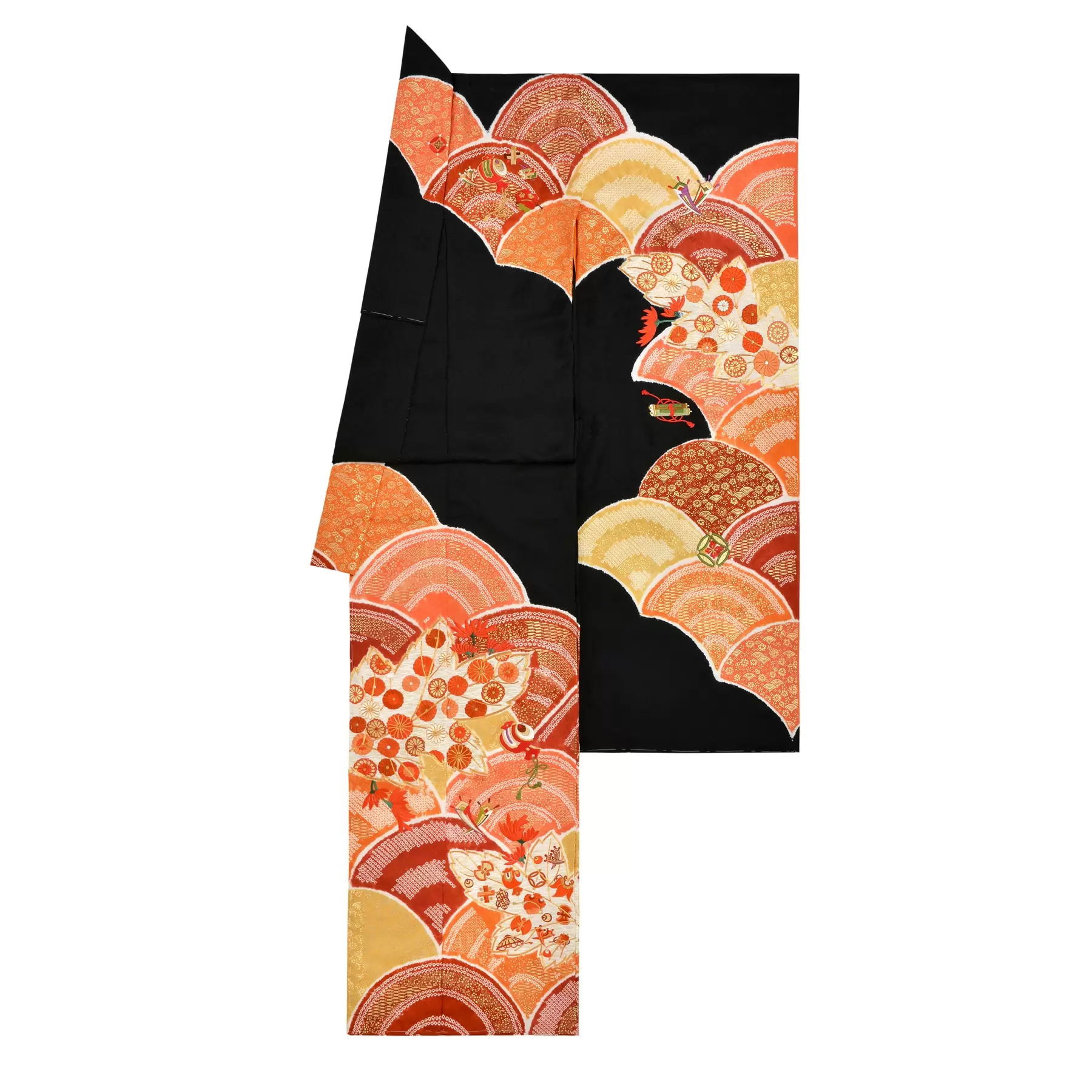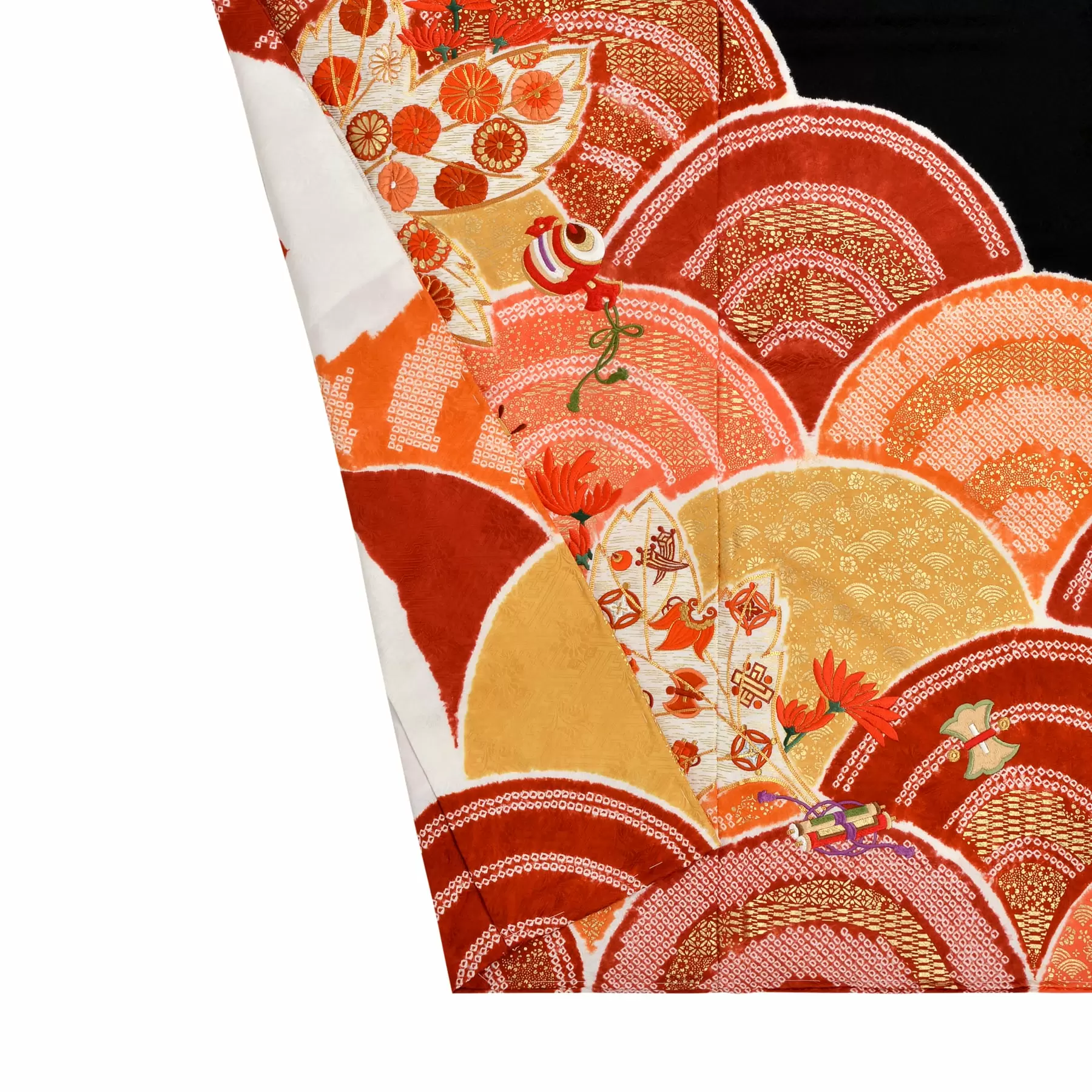 未来永劫幸せが続きます様に、という意味を持つ吉祥文様の青海波をモチーフにしています。絞りで表現された連なる青海波と、刺繍で表現した大ぶりな菊葉を大胆に組み合わせた華やかなデザイン。黒の地色が綺麗に見えるよう朱を効果的に用い、重厚でクラッシックな振袖に仕上げました。