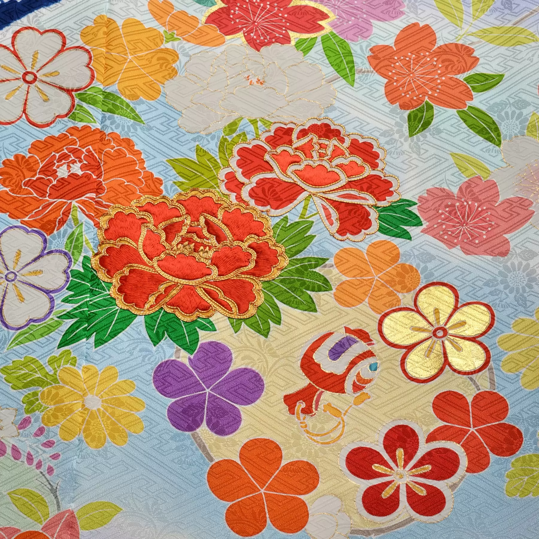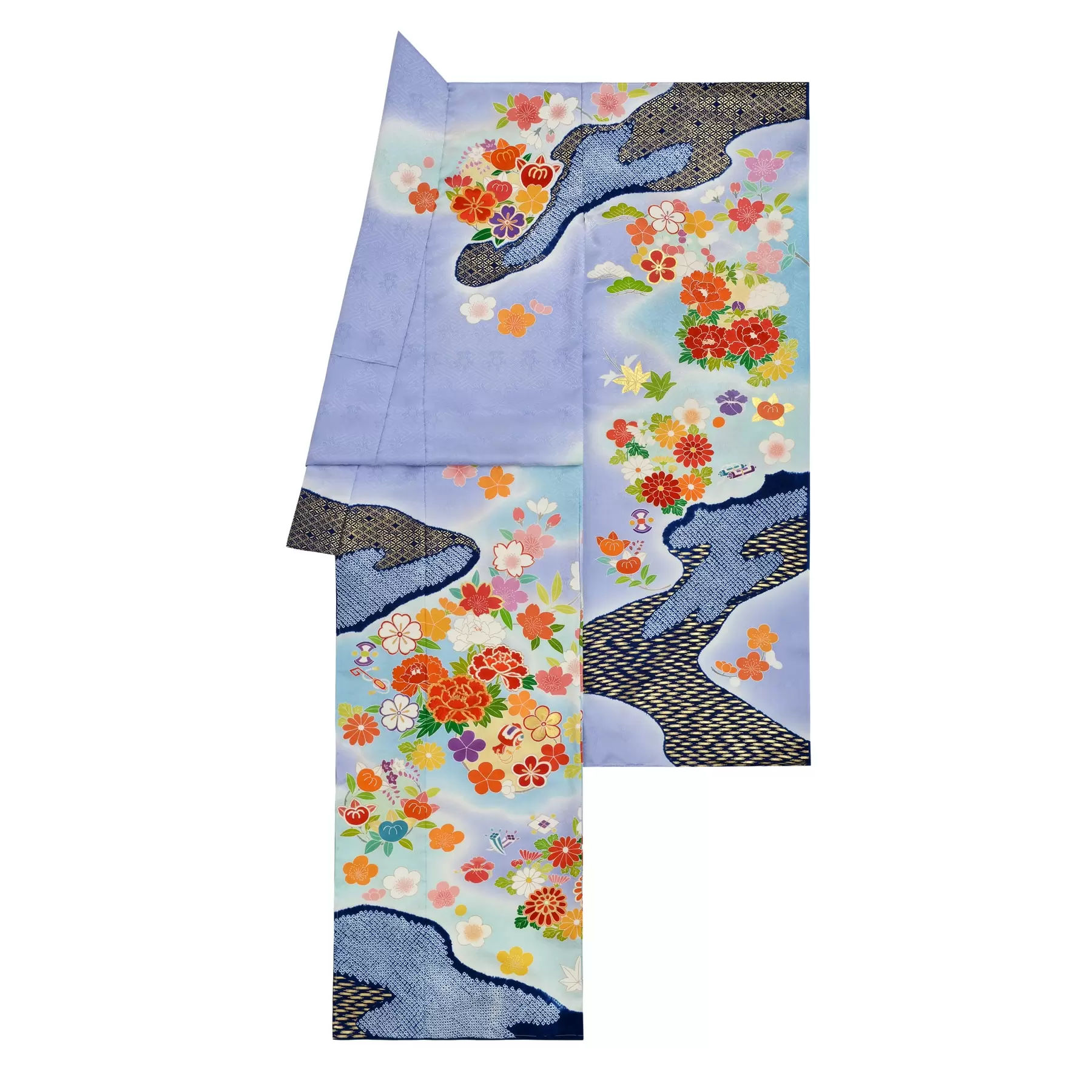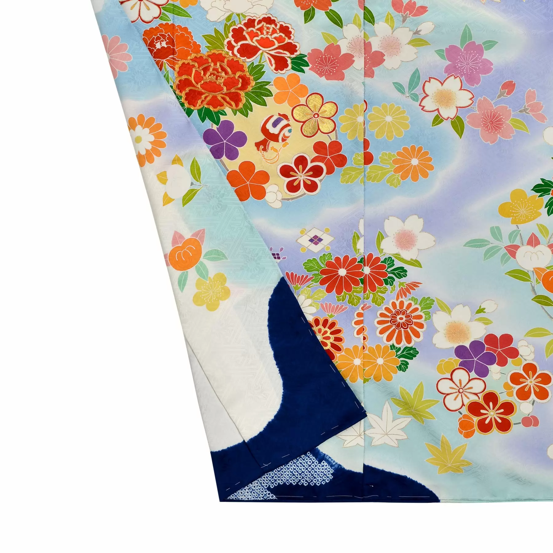 青空に浮かぶ雲、自然の花々の瑞々しい風景をイメージしてデザインしました。ブルーの濃淡で染分けた地色はコントラストが美しく、描かれた花の丸の華麗さを引き立たせてくれています。すっきりとした振袖をお探しの方におすすめの一枚です。