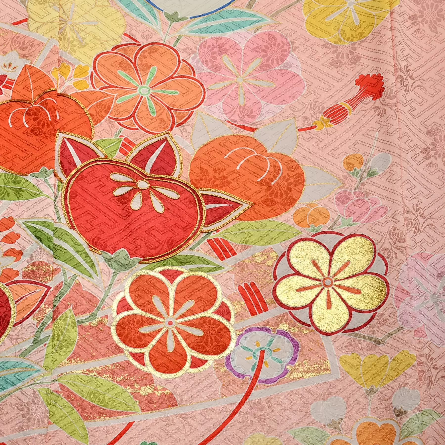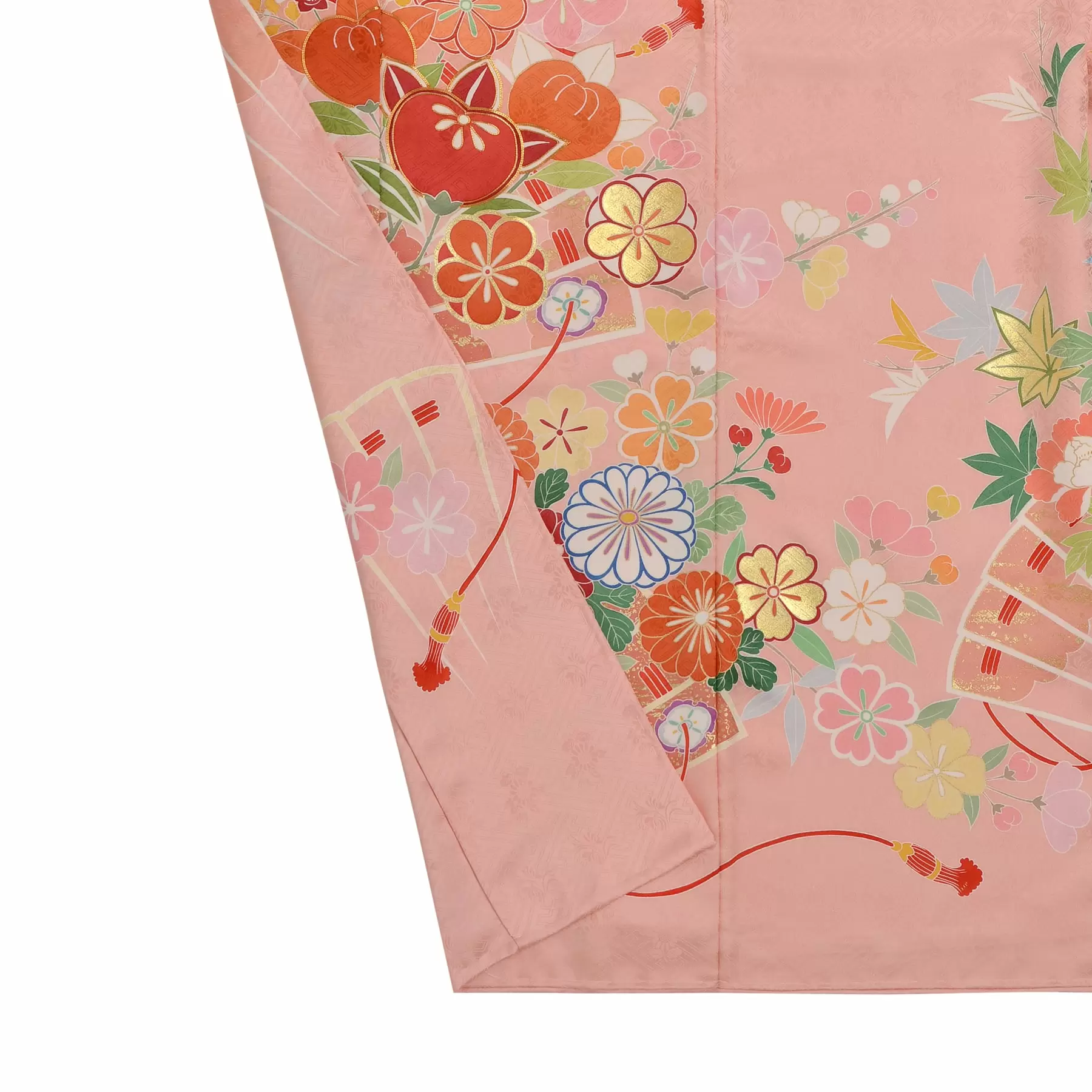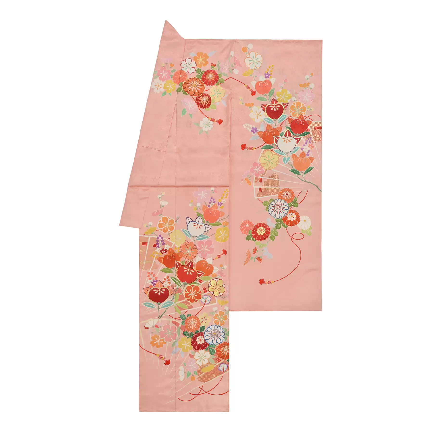 末広がりを意味する雅やかな桧扇と自然の花々を組み合わせてデザインしました。桧扇は色を押さえた線描きで控えめに表現し、上に載せた花の色が浮き上がるように工夫しています。地色の優しいピンクに花々の赤や朱が映える可愛らしい振袖です。