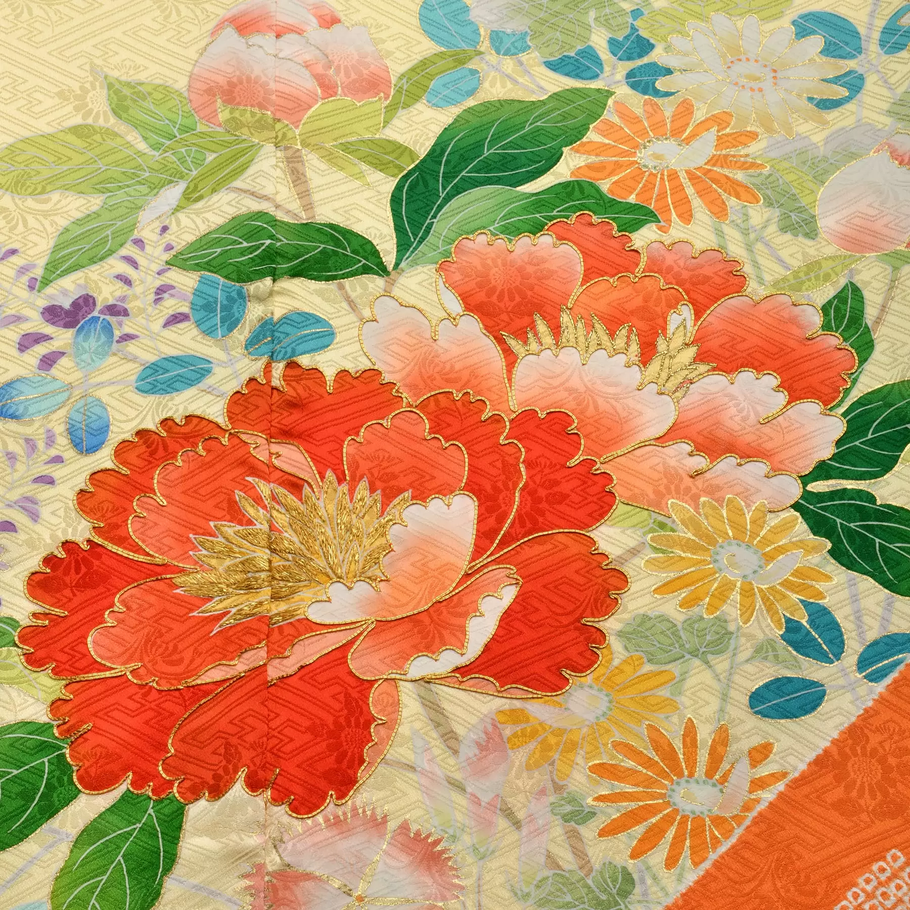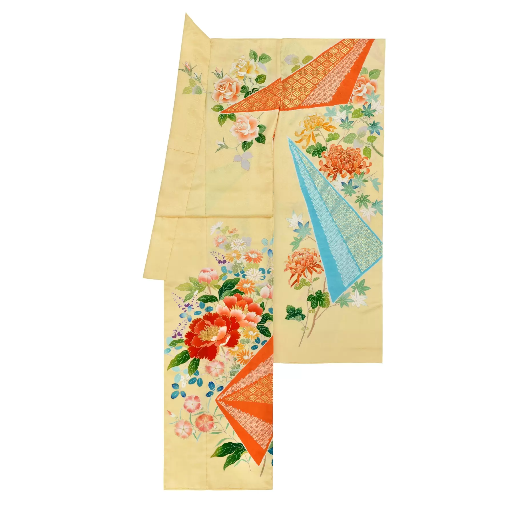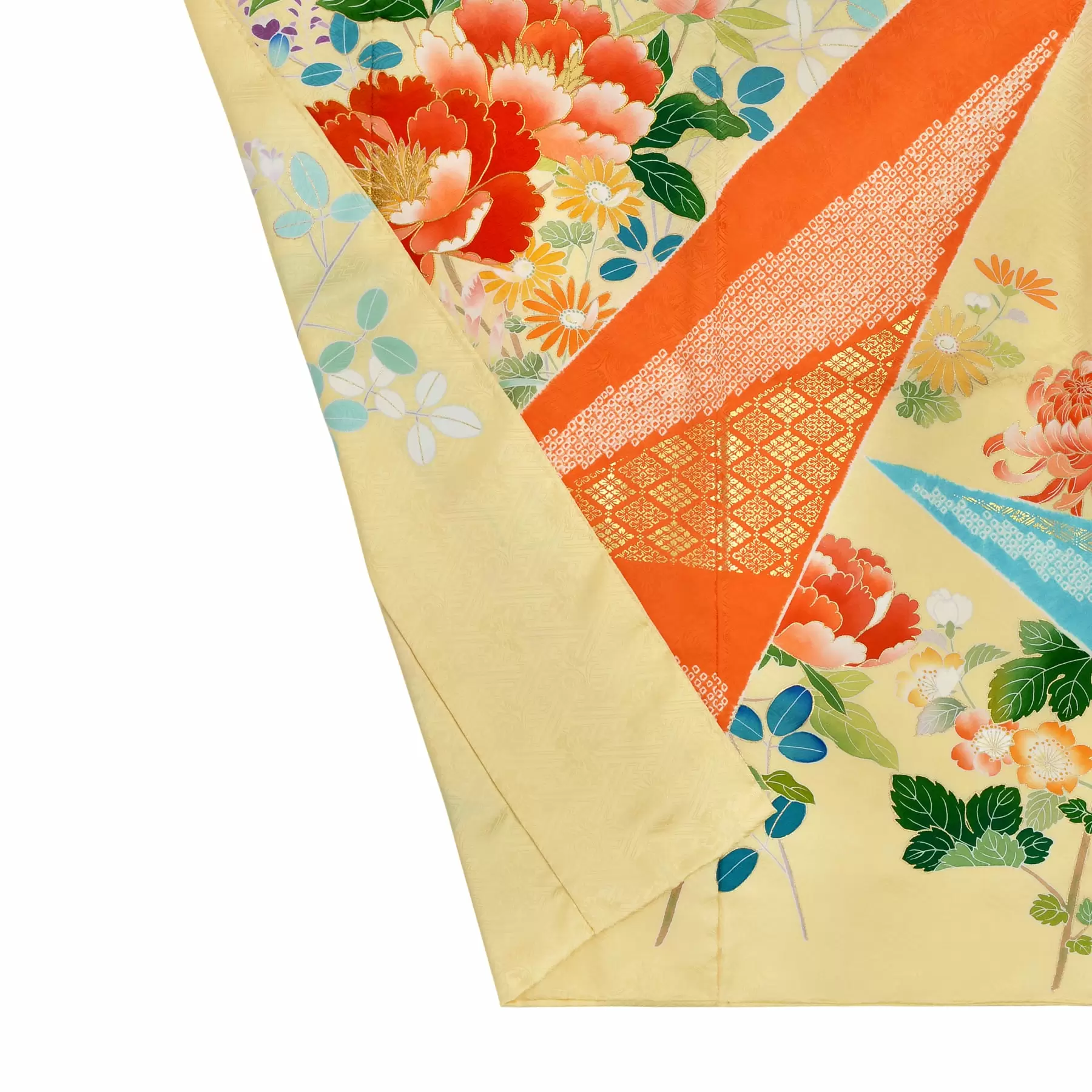 光が差し込み自然の花々が煌く様子をデザインしました。身に纏うと、光のプリズムをイメージした三角形が効果的に現れ、着姿に色彩をもたらしてくれます。三角形のシャープなラインにより、写実的に描き出される植物の有機性が引き出され、女性らしいたおやかな強さが表現された優美な振袖です。
