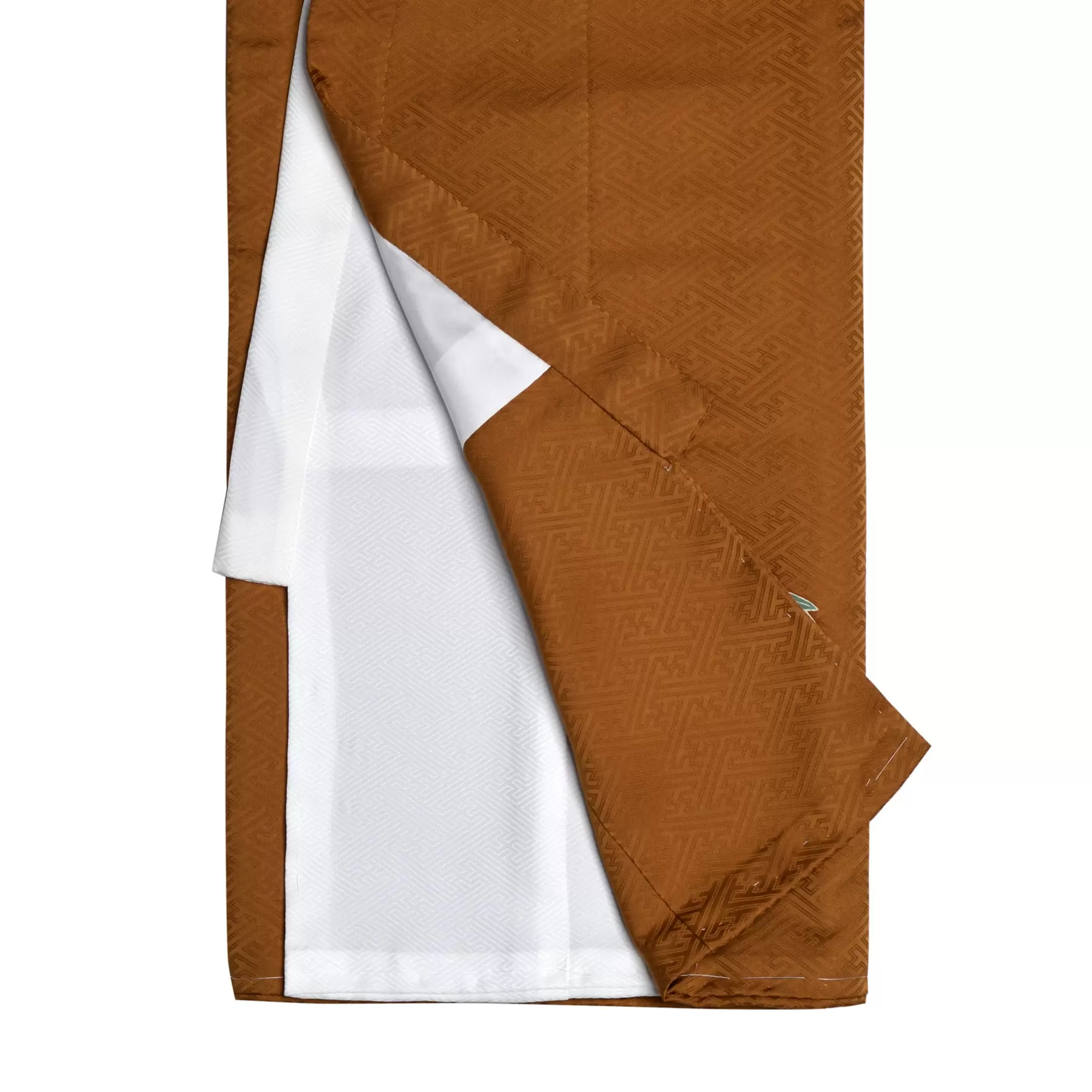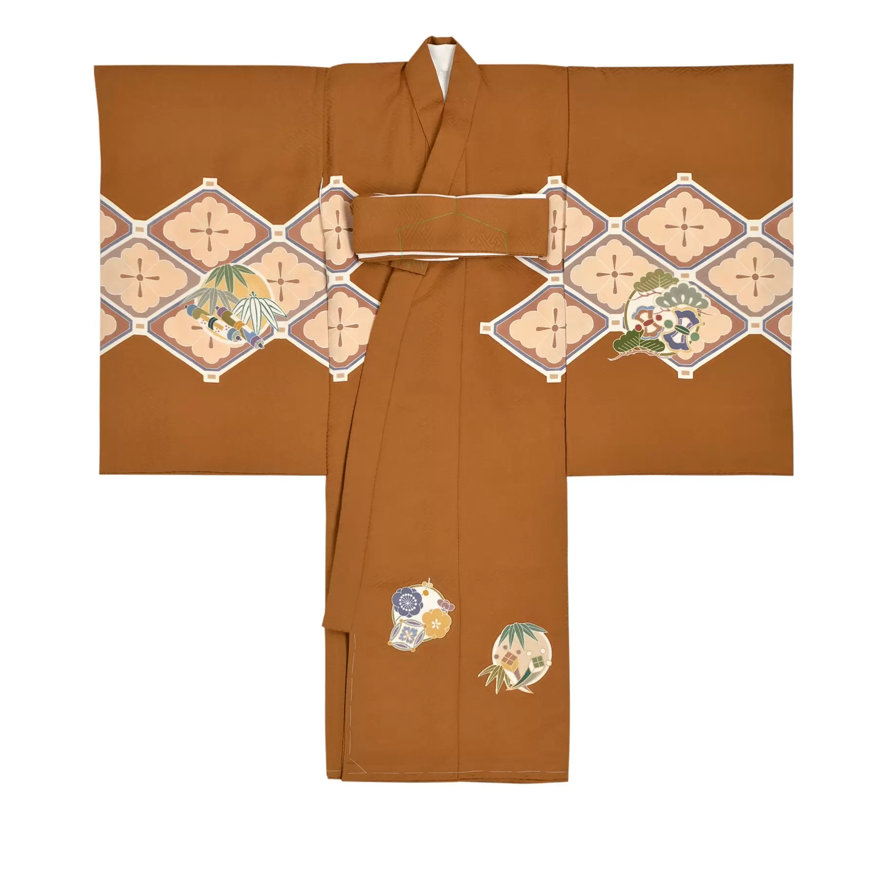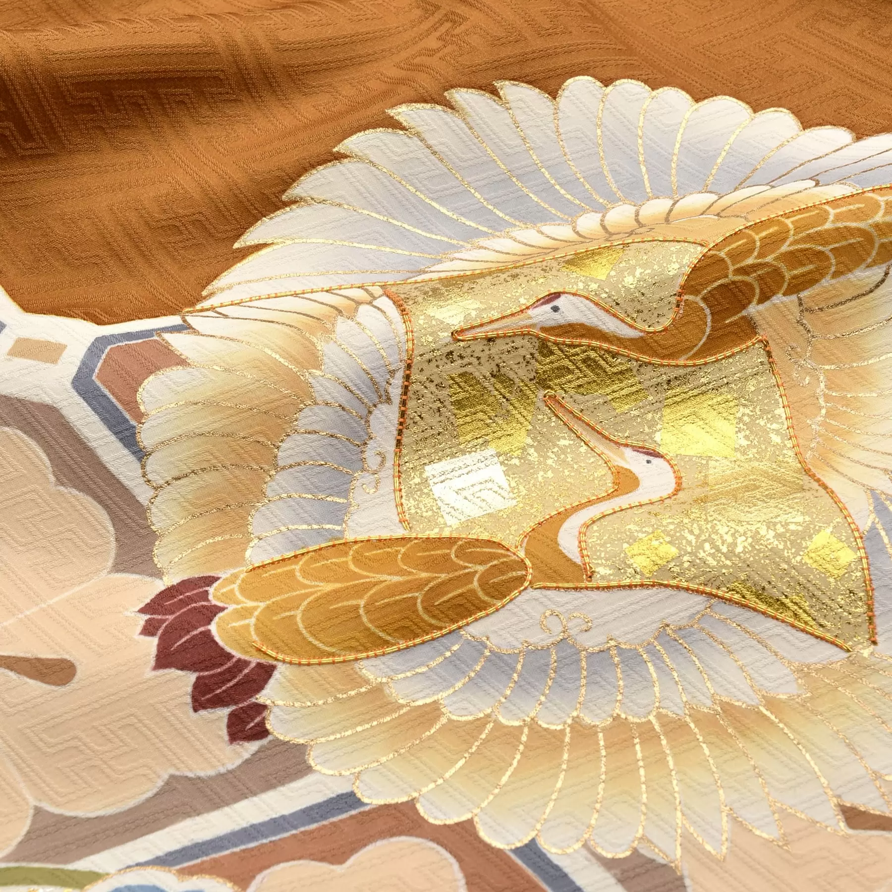 明るい金茶色で光沢のある綸子の生地を染めた個性的な地色に、名物裂として重宝される格高い蜀江文様と、丸でデザインされた鶴や宝のコントラストが鮮やかです。延命長寿のシンボルである鶴と縁起物の松の組み合わせで、健やかな成長を願うおめでたさとともに品格を感じさせる一枚です。