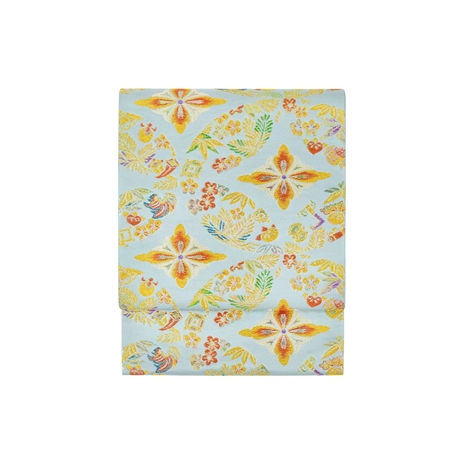光沢のあるグレーの地色がやわらかい印象を作ってくれる付下と、七宝と宝尽くしのおめでたい袋帯を合わせました。