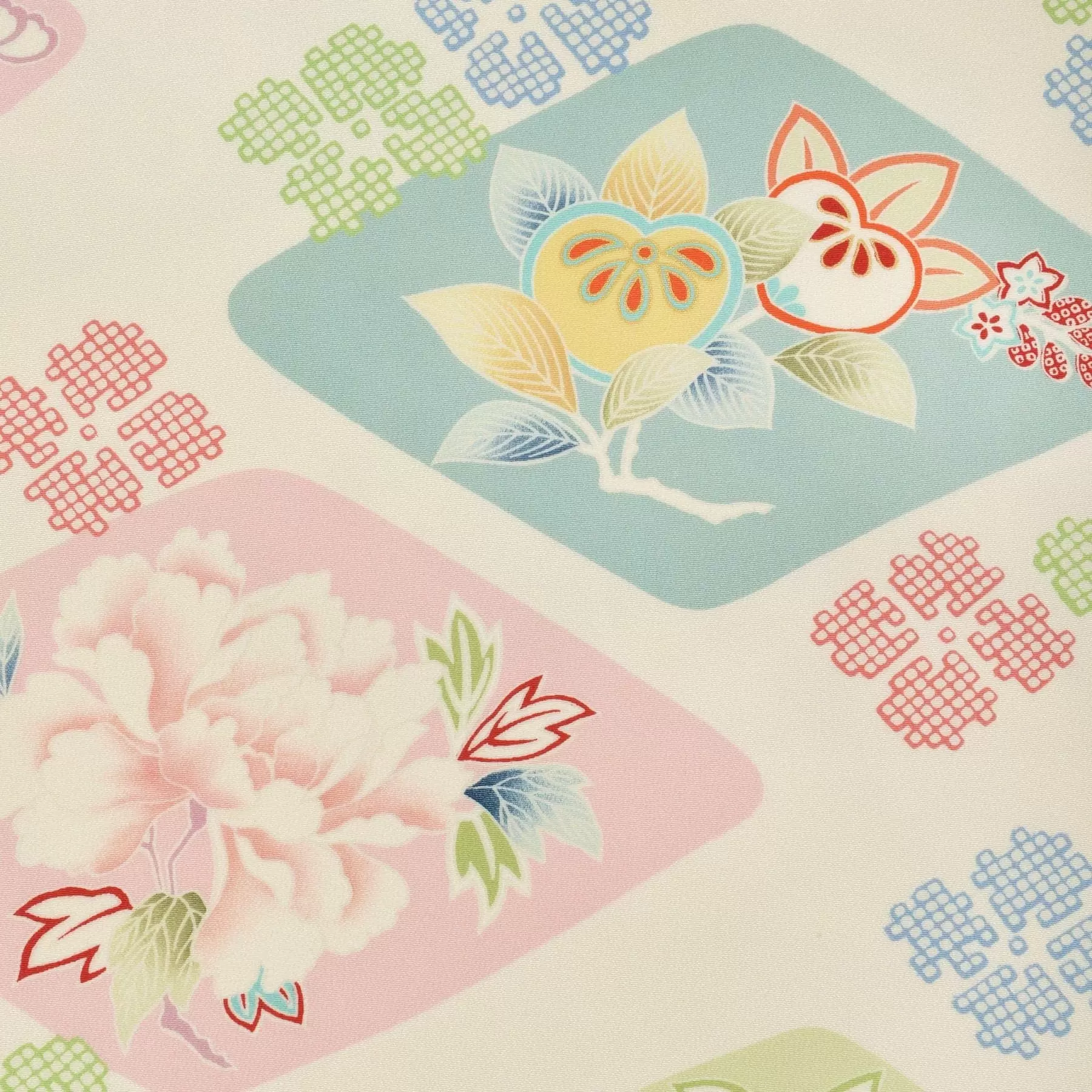 天から舞い落ちる光のプリズムの中に、美しい草花が浮かび上がる可憐な文様です。清楚な印象を与えるのパールホワイトの地色が、上品な可愛らしさを演出してくれる一枚です。