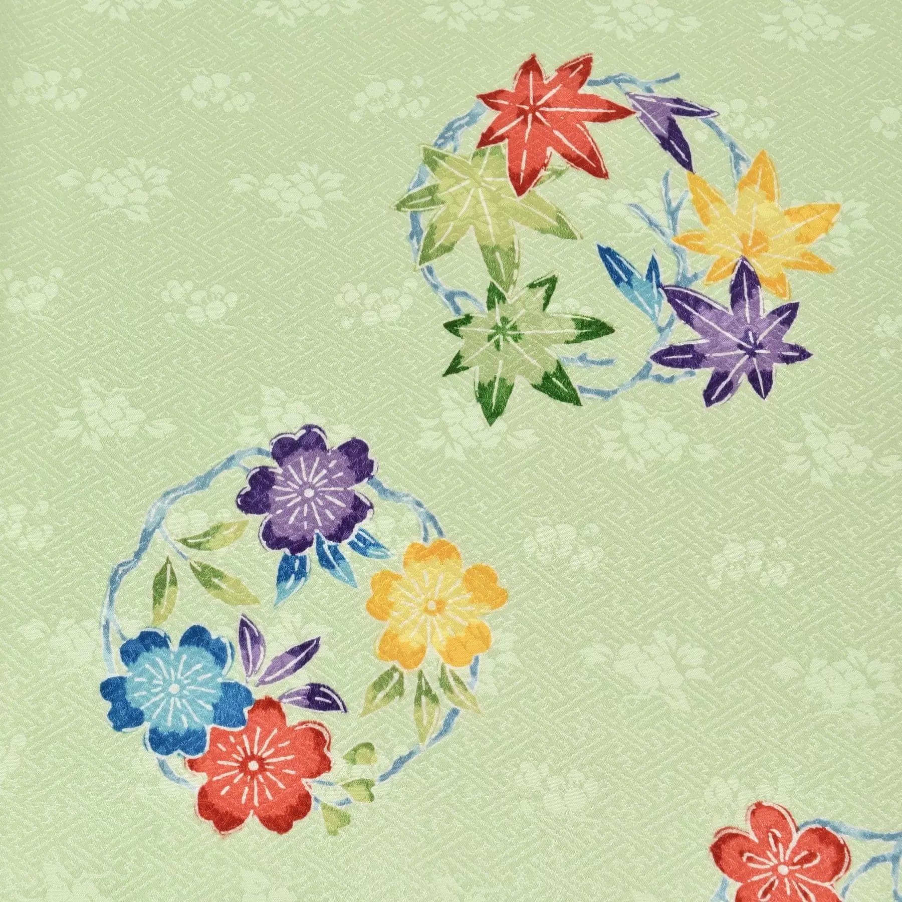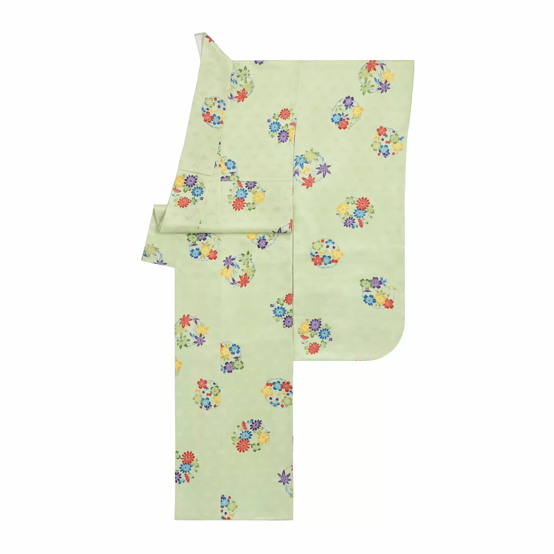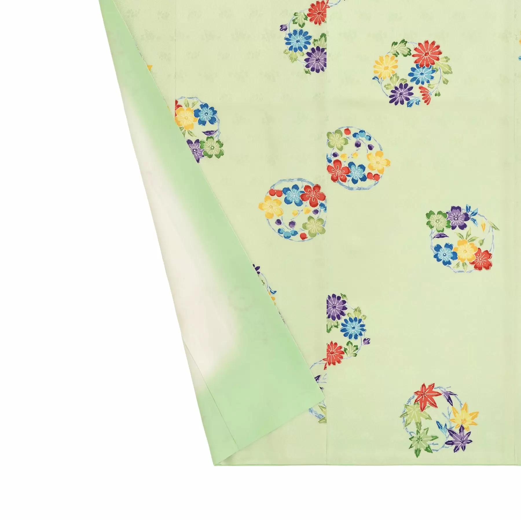 小袖の文様として古くから人気のある花の丸の文様。縁を繋ぐという縁起の良い文様として、また可憐な草花の花の冠のような愛らしい文様として、愛され続けています。若々しい印象を与えるミントグリーンの地色は、爽やかな可愛らしさを演出してくれる一枚です。