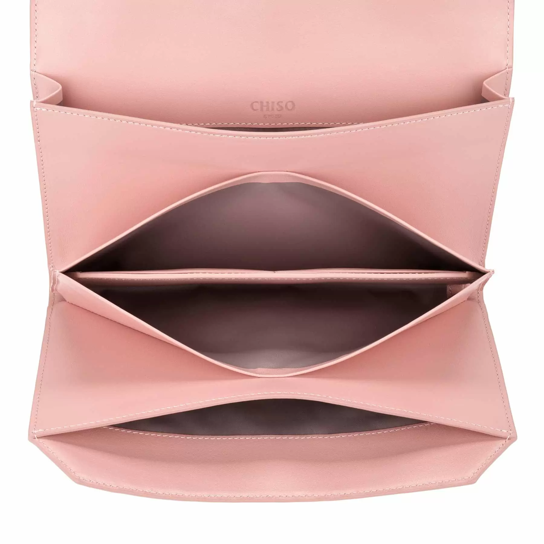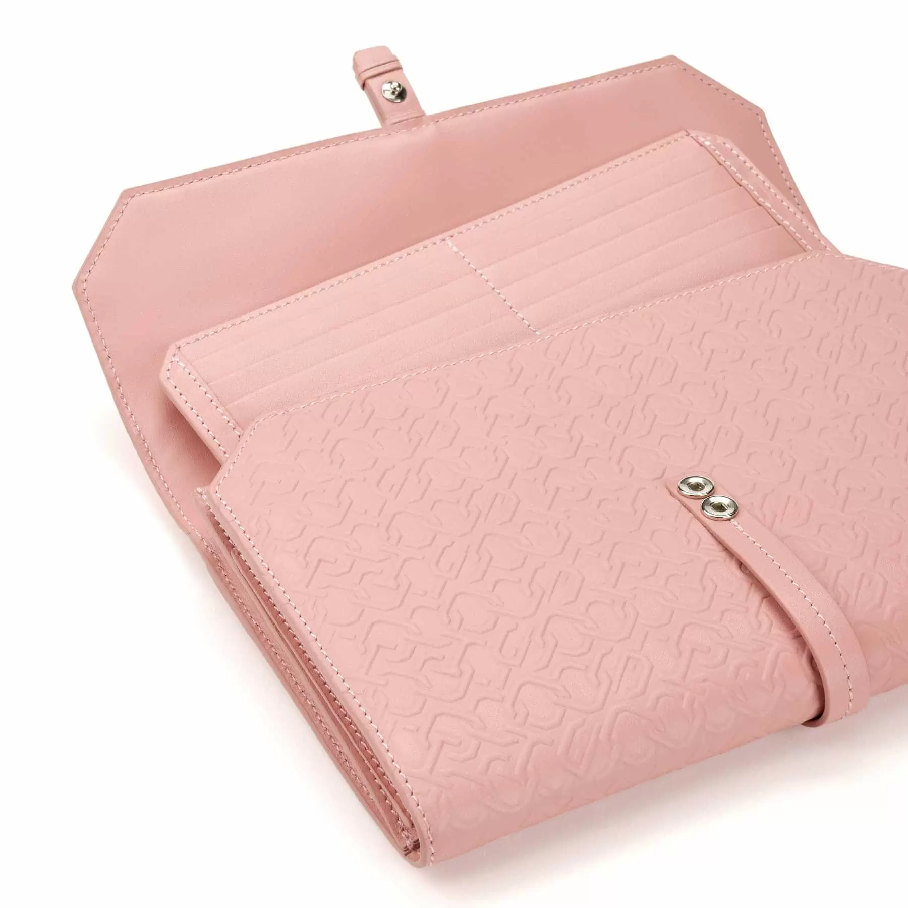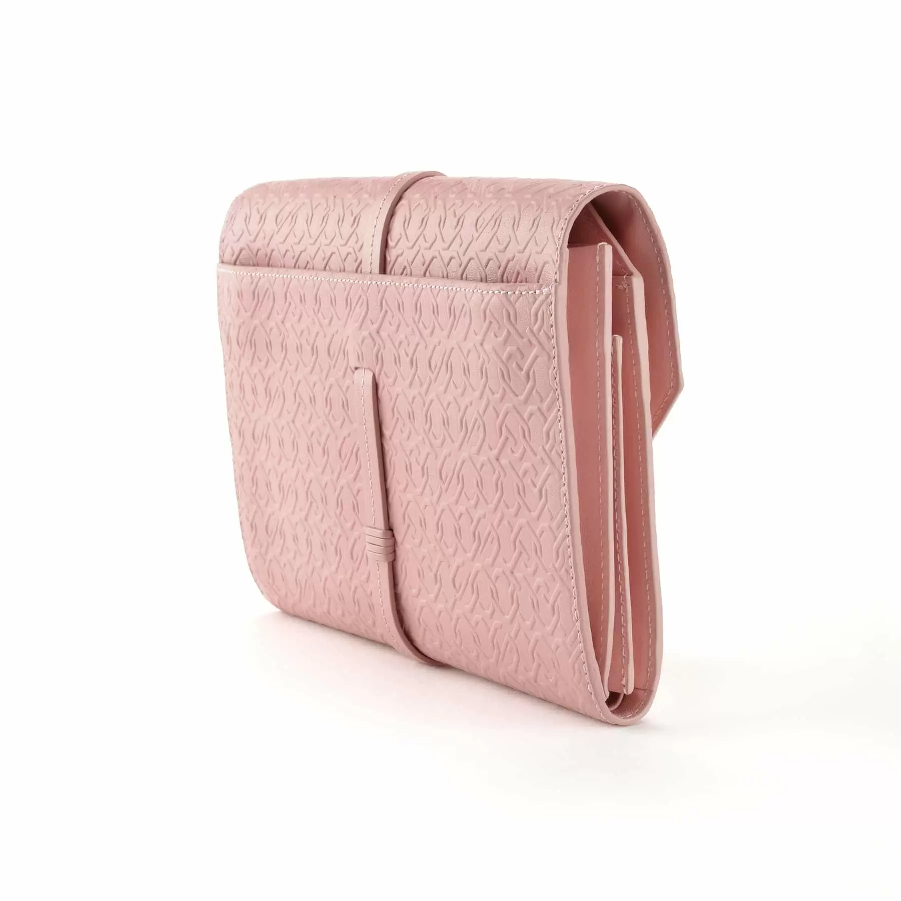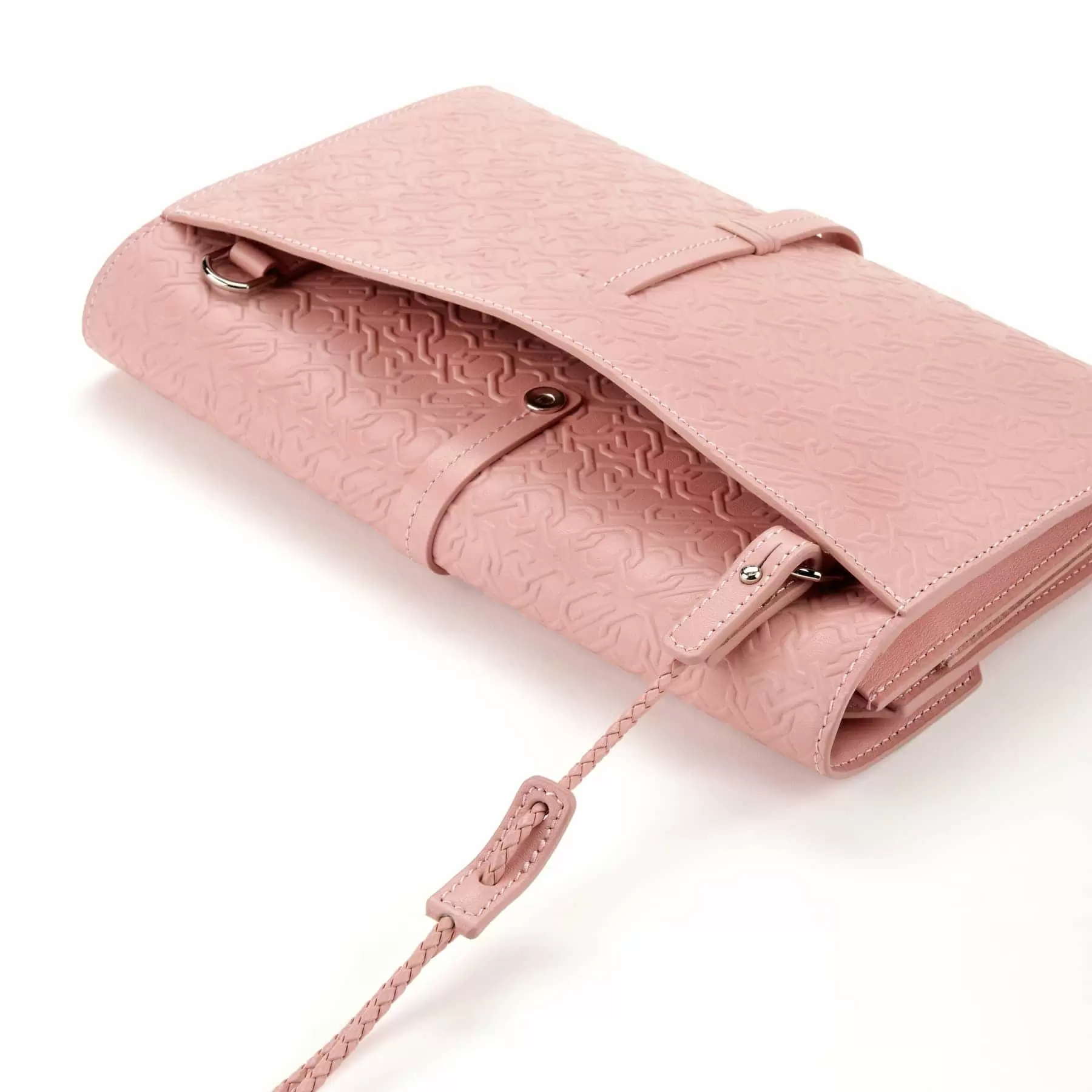 千總の紋にも使われている隅切り四角形のモノグラムデザインの型押しや、竹籠バッグを思わせるハンドルの編み方、幾重にも重ねられたコバ塗りなど、日本の職人の美しい手仕事が随所に生かされた、バッグと同じデザインのクラッチです。