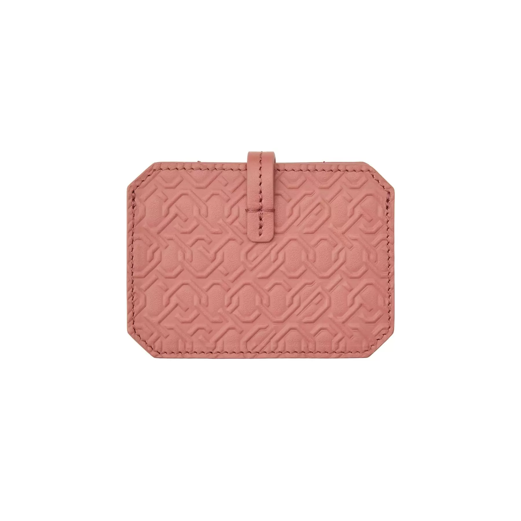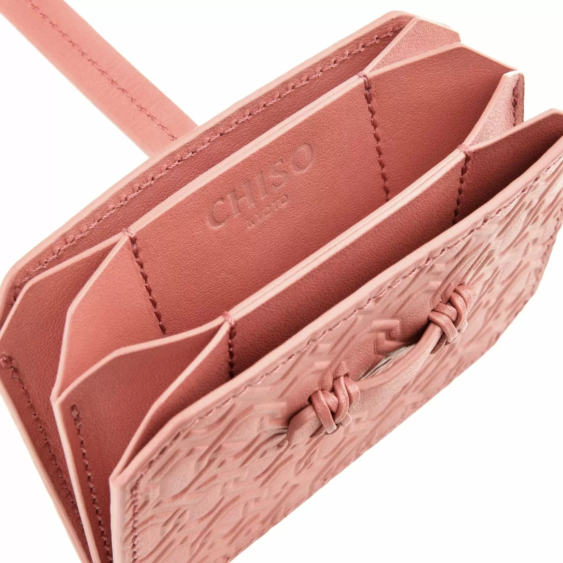 千總の紋にも使われている隅切り四角形のモノグラムデザインの型押しや、竹籠バッグを思わせるハンドルの編み方、幾重にも重ねられたコバ塗りなど、日本の職人の美しい手仕事が随所に生かされた、バッグと同じデザインのカードケースです。