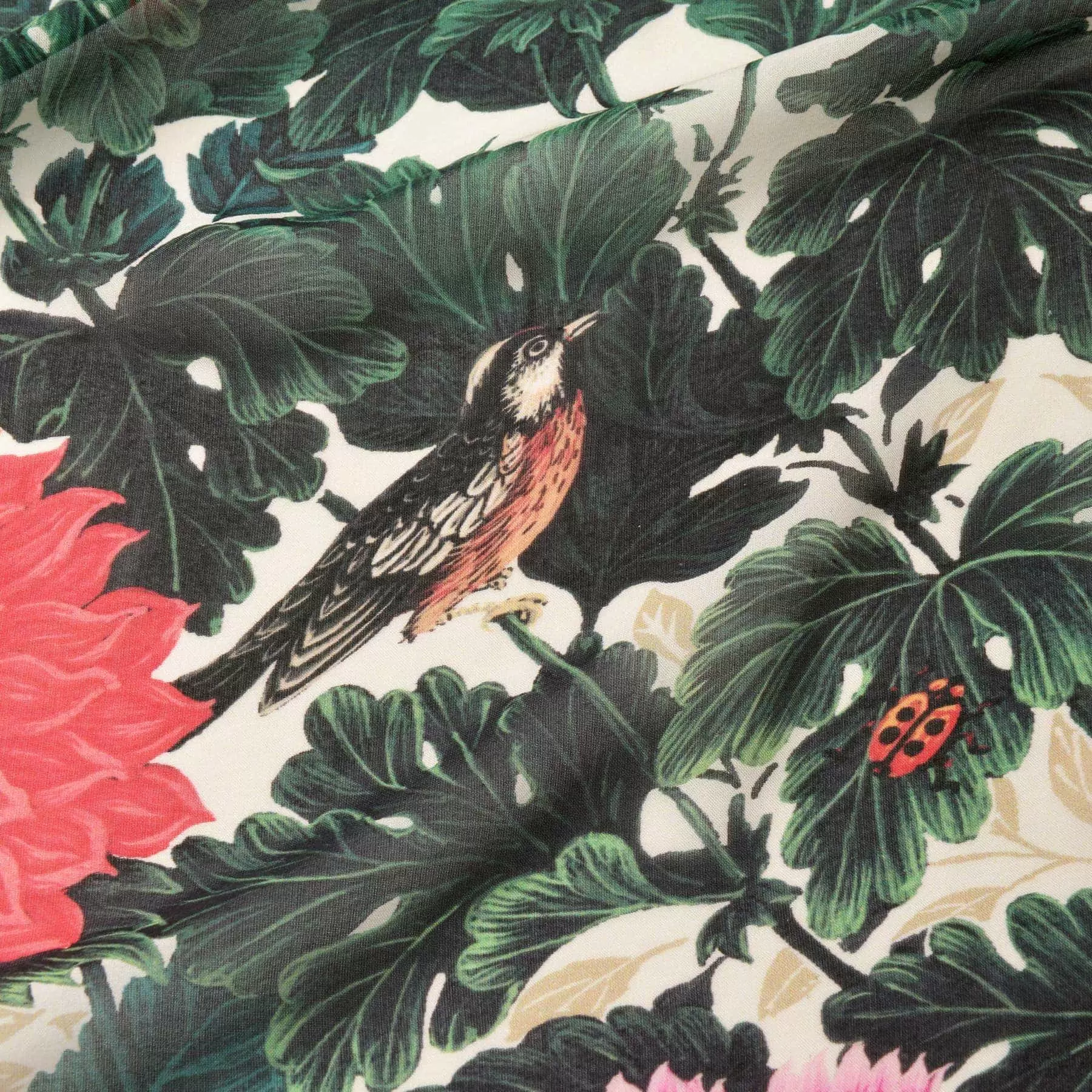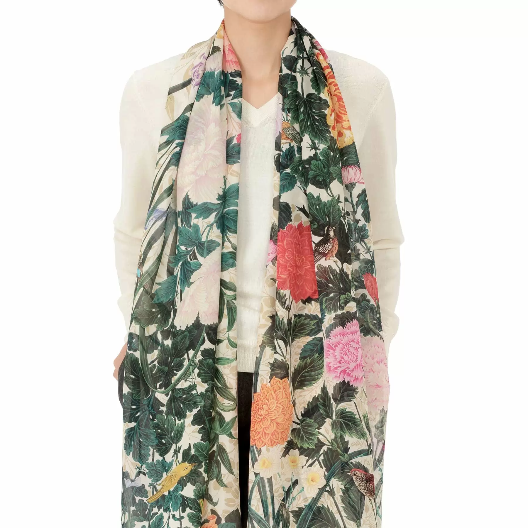 自然の生命力の力強さや、瑞々しい花の色彩、多彩な顔を見せてくれる光、そして鳥たちの可愛らしさ。「花と鳥と」の第一弾となる今回のコレクションのコンセプトを表現した図案を、ストールとしてデザインしました。