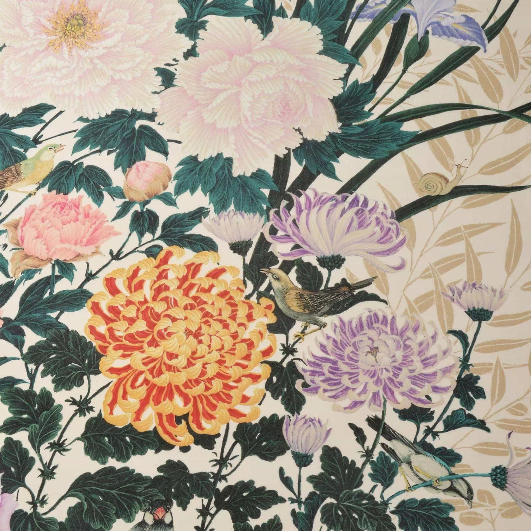 上へ上へと伸びる花の構図からは、自然の伸びやかさと壮大さが感じられ、花々と戯れるてんとう虫やカタツムリなどの小さな動物たちの姿を探していただくのも楽しい一枚です。
