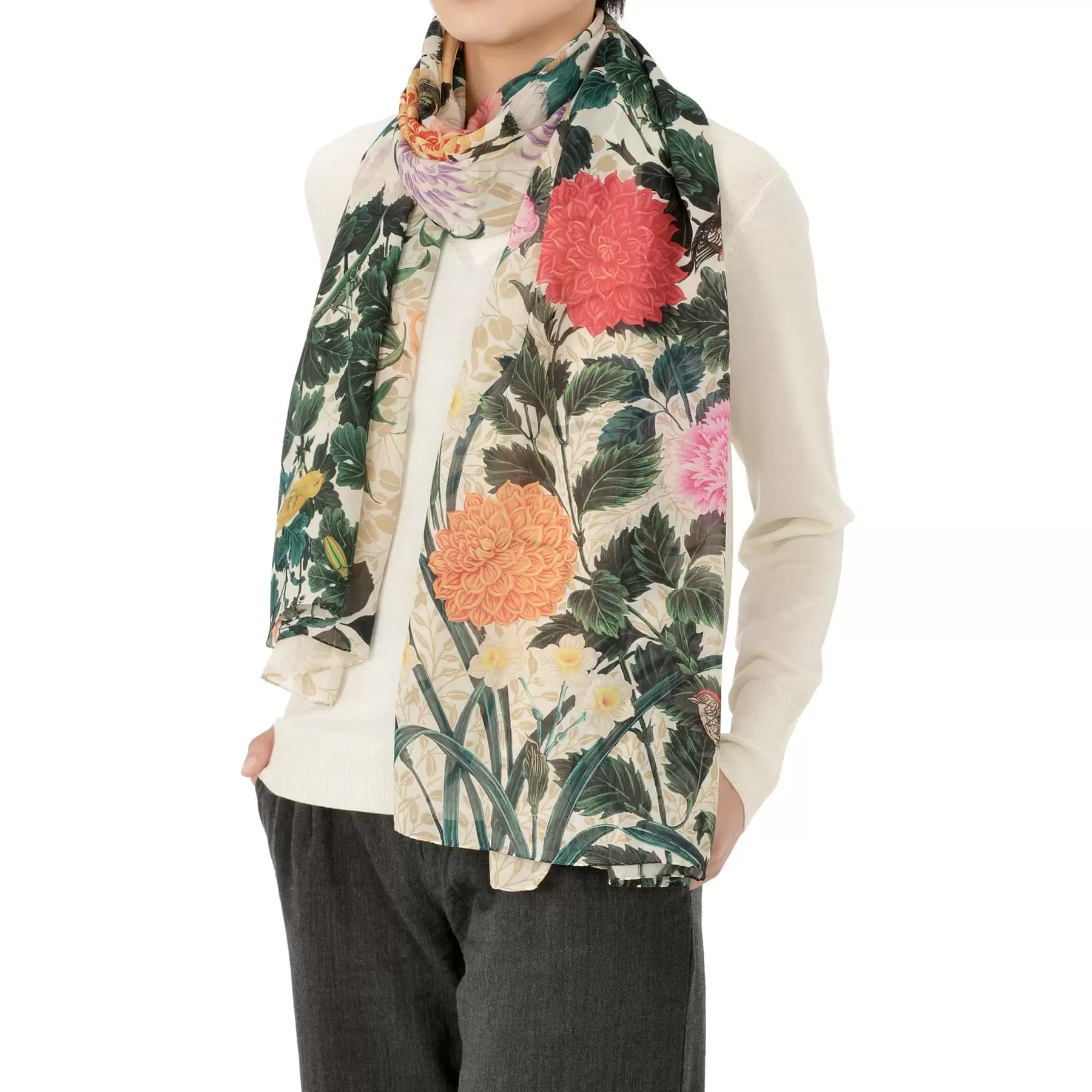 薄く肌触りのよいローンシフォンは首に巻いてもコンパクトにまとまり、所々にのぞく花々の色彩が美しいアクセントを生み出します。まるで一枚の絵画を身に纏うような豪華なストールです。