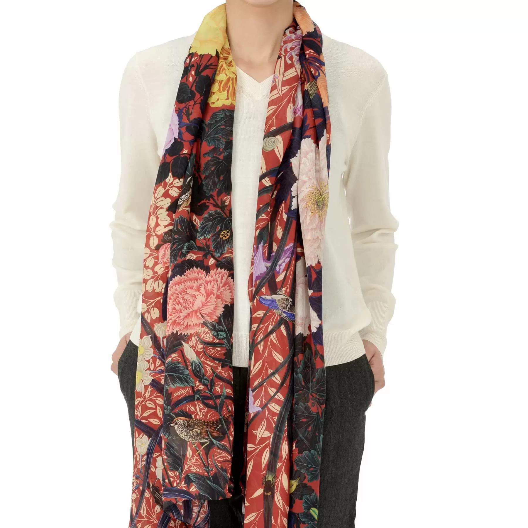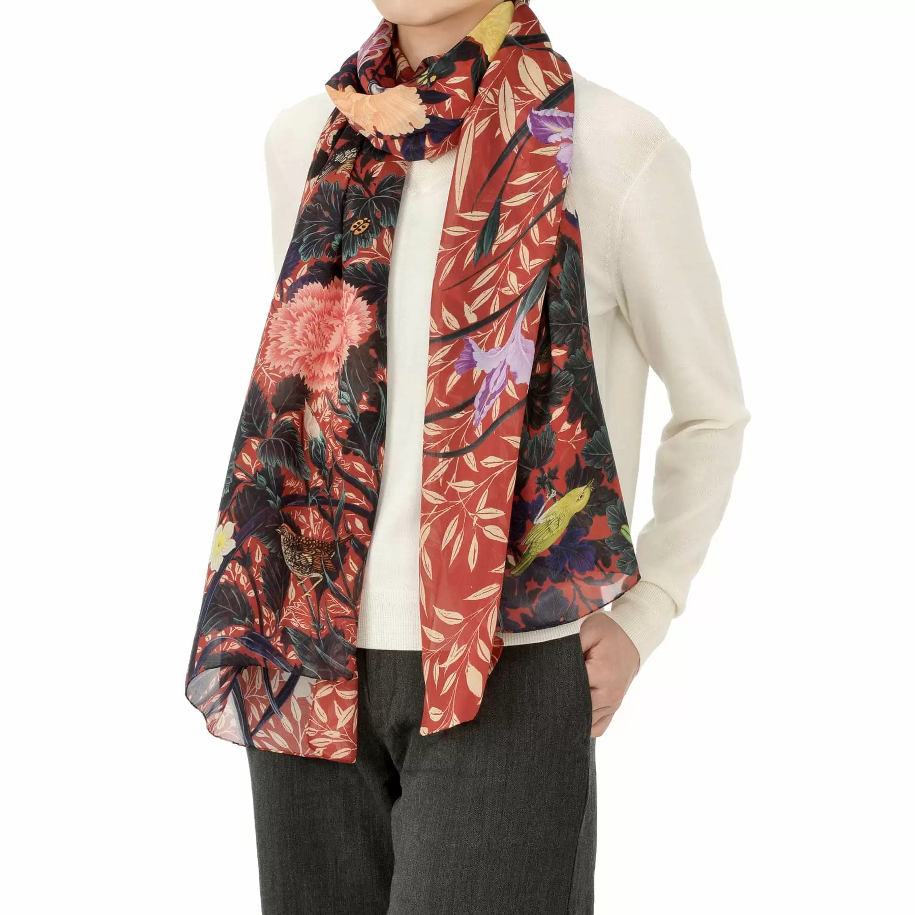 薄く肌触りのよいローンシフォンは首に巻いてもコンパクトにまとまり、所々にのぞく花々の色彩が美しいアクセントを生み出します。まるで一枚の絵画を身に纏うような豪華なストールです。