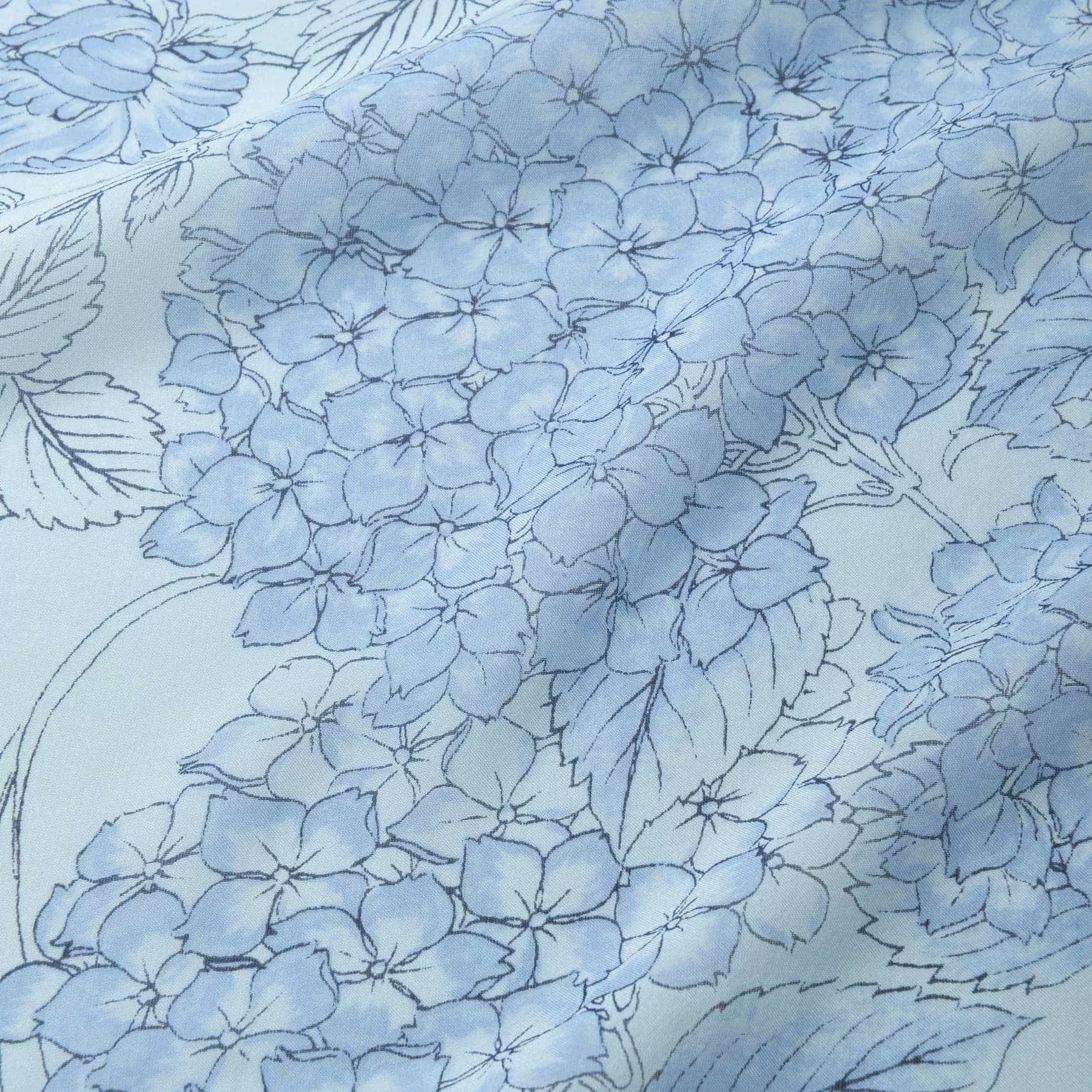 正方形のキャンバスの中に、四季の巡りを繊細な線画で表現したスカーフです。右下の春の牡丹に始まり、時計回りとは反対に、夏の紫陽花、秋の菊、冬の椿が描かれています。