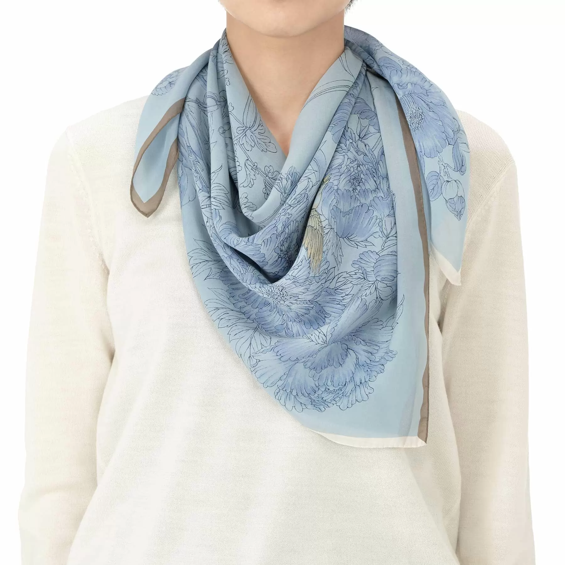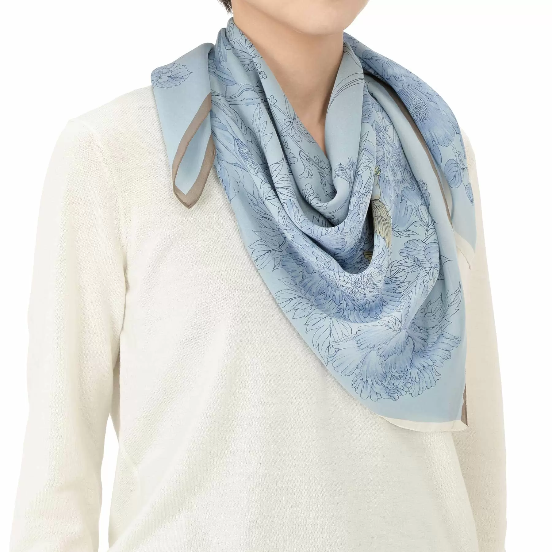 対角で変えた縁取りの色は、スタイリングのポイントになるとともに、このスカーフの持つ楚々とした美しさを際立たせてくれています。