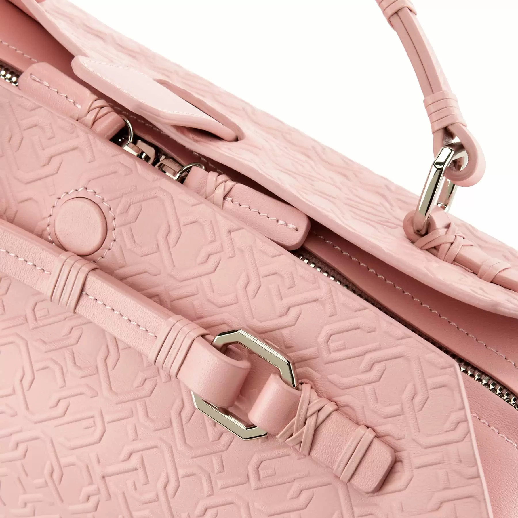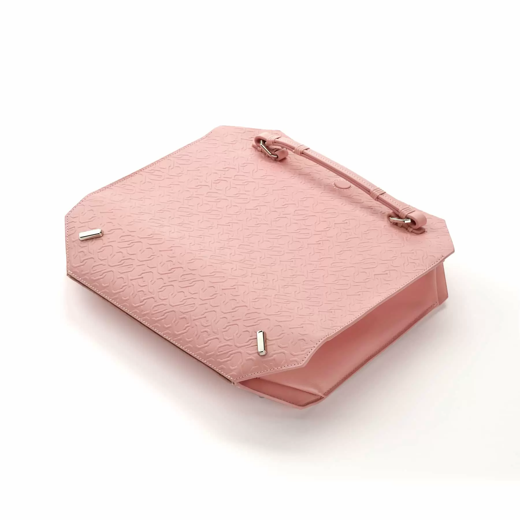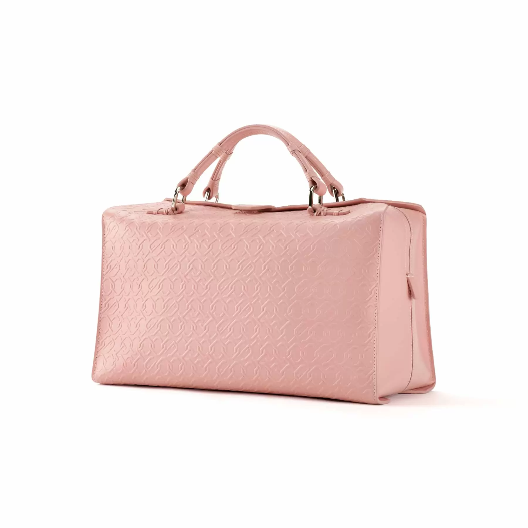 千總の紋にも使われている隅切り四角形をモノグラムデザインに仕上げ、型押しを施したボディー、竹籠バッグを思わせるハンドルの編み方、幾重にも重ねられたコバ塗りなど、日本の職人の美しい手仕事が随所に生かされています。