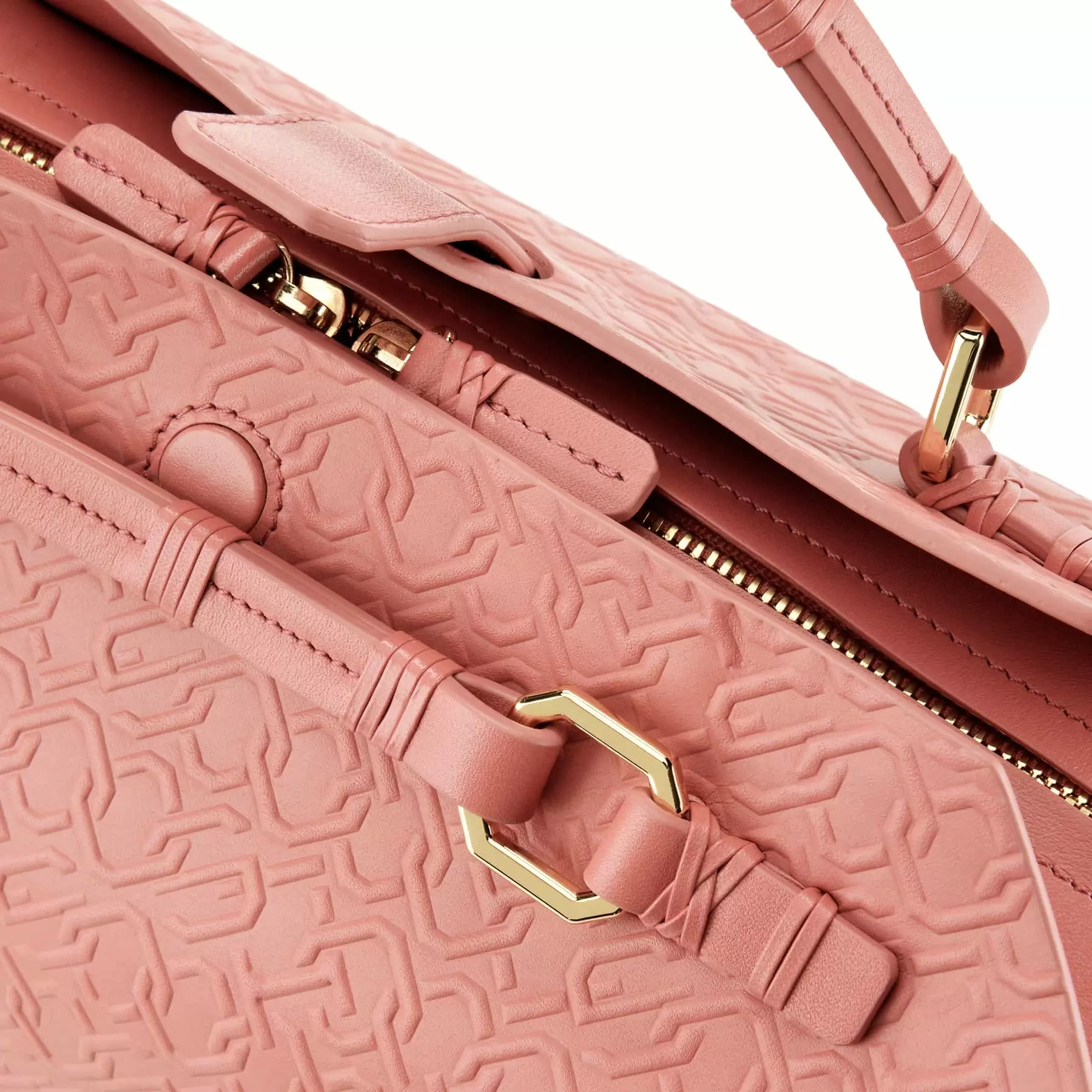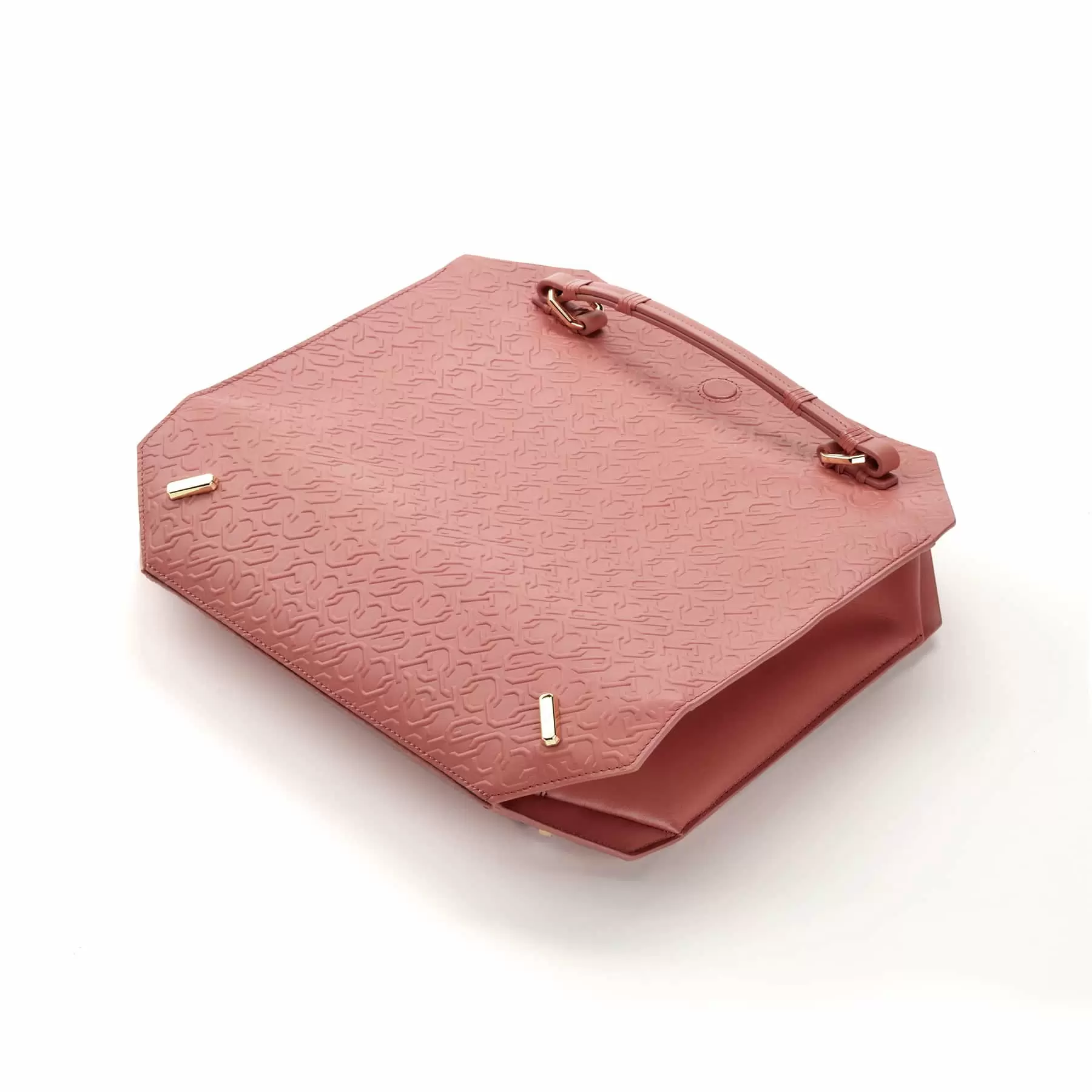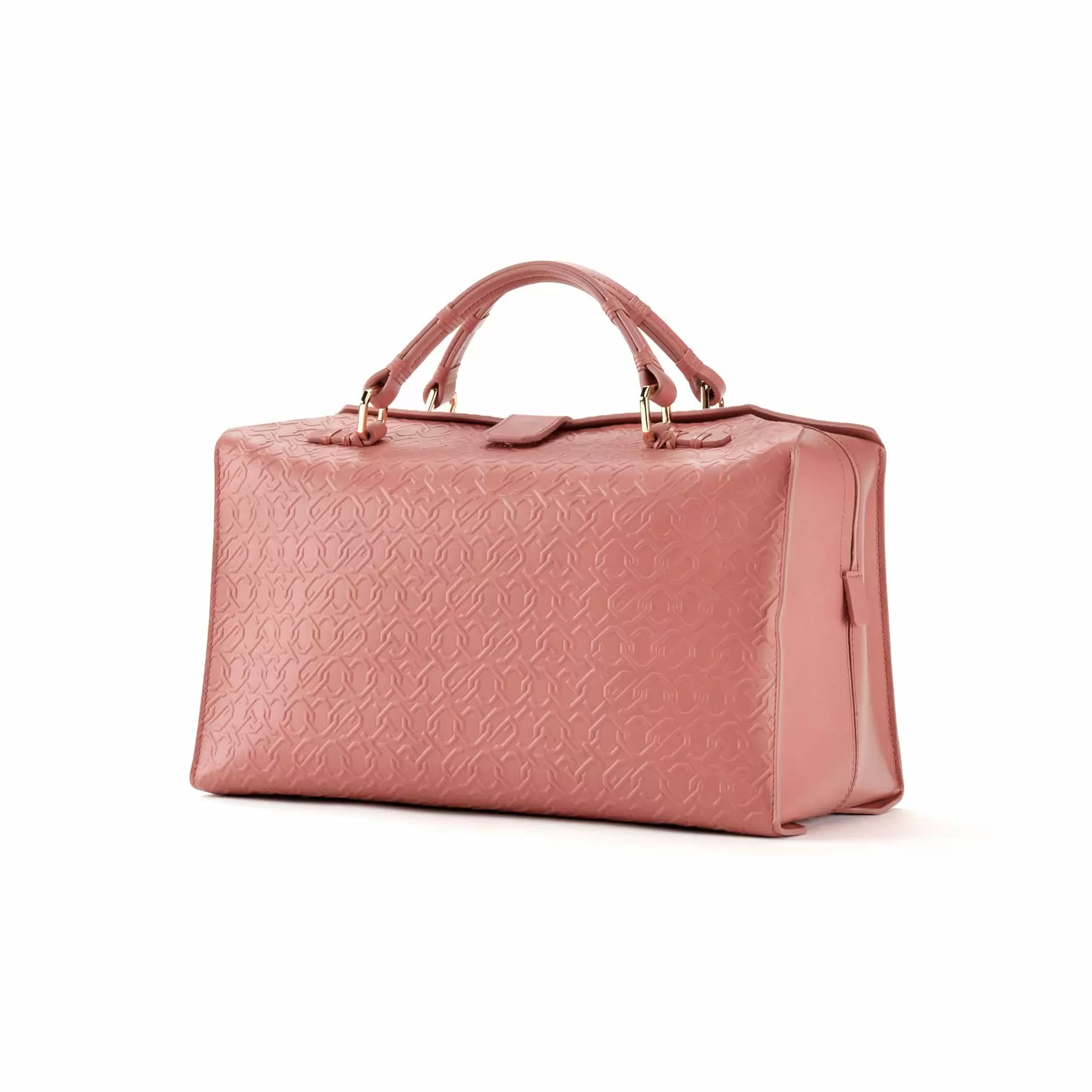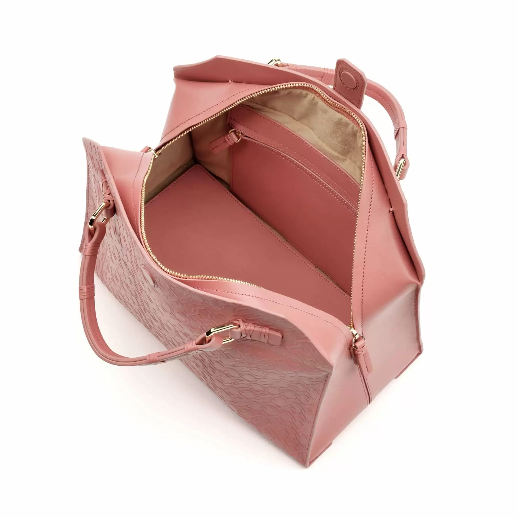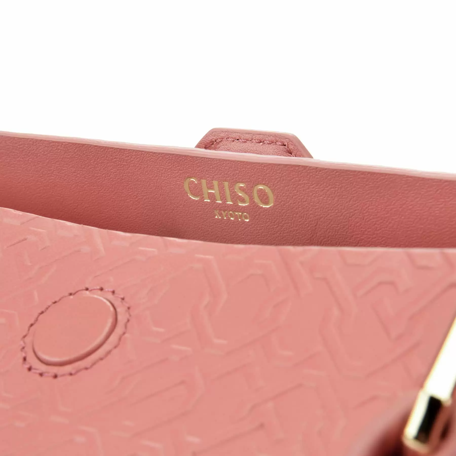 千總の紋にも使われている隅切り四角形をモノグラムデザインに仕上げ、型押しを施したボディー、竹籠バッグを思わせるハンドルの編み方、幾重にも重ねられたコバ塗りなど、日本の職人の美しい手仕事が随所に生かされています。