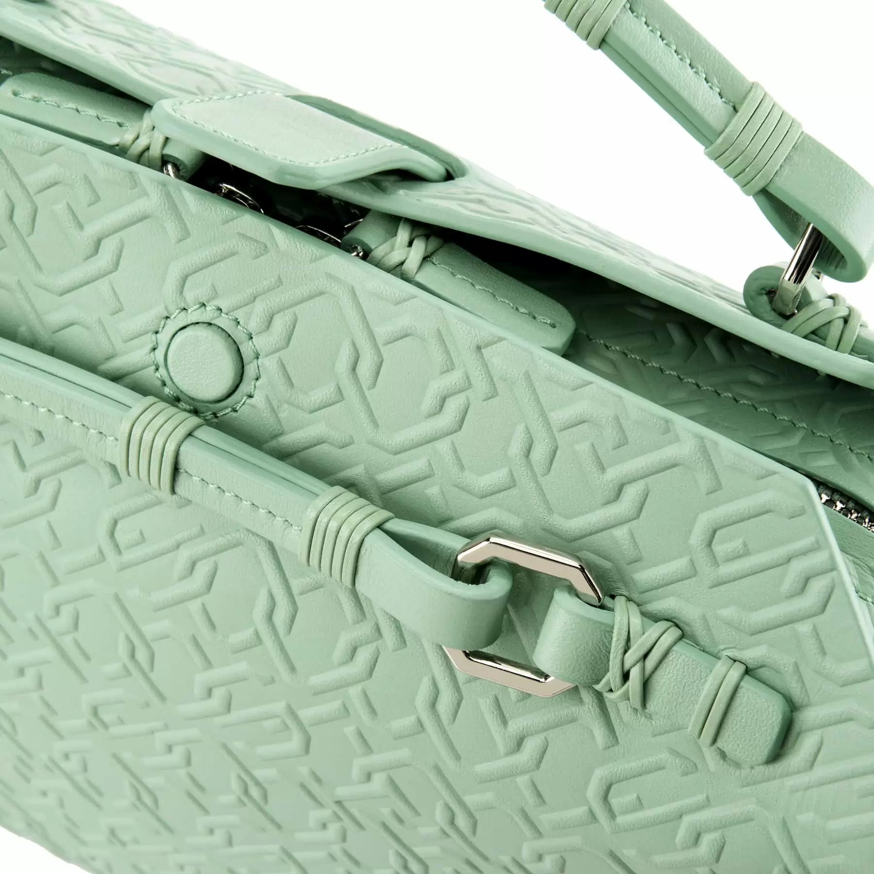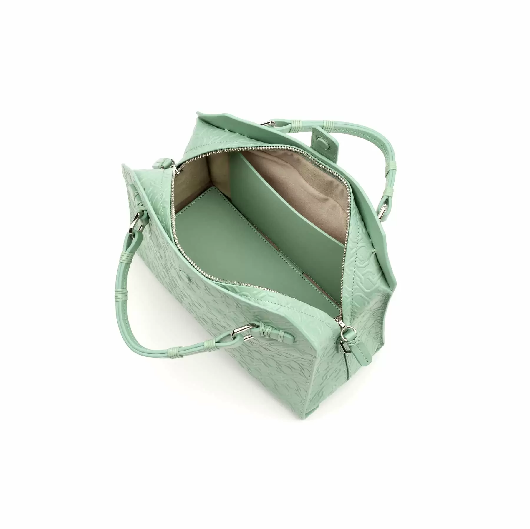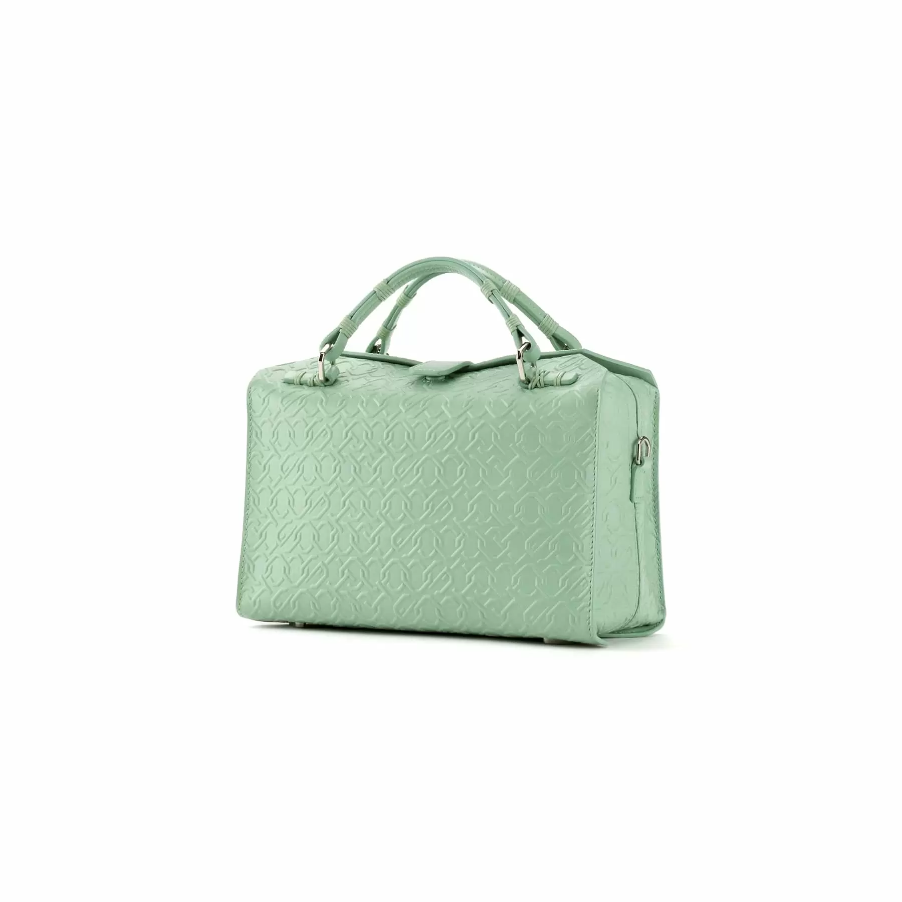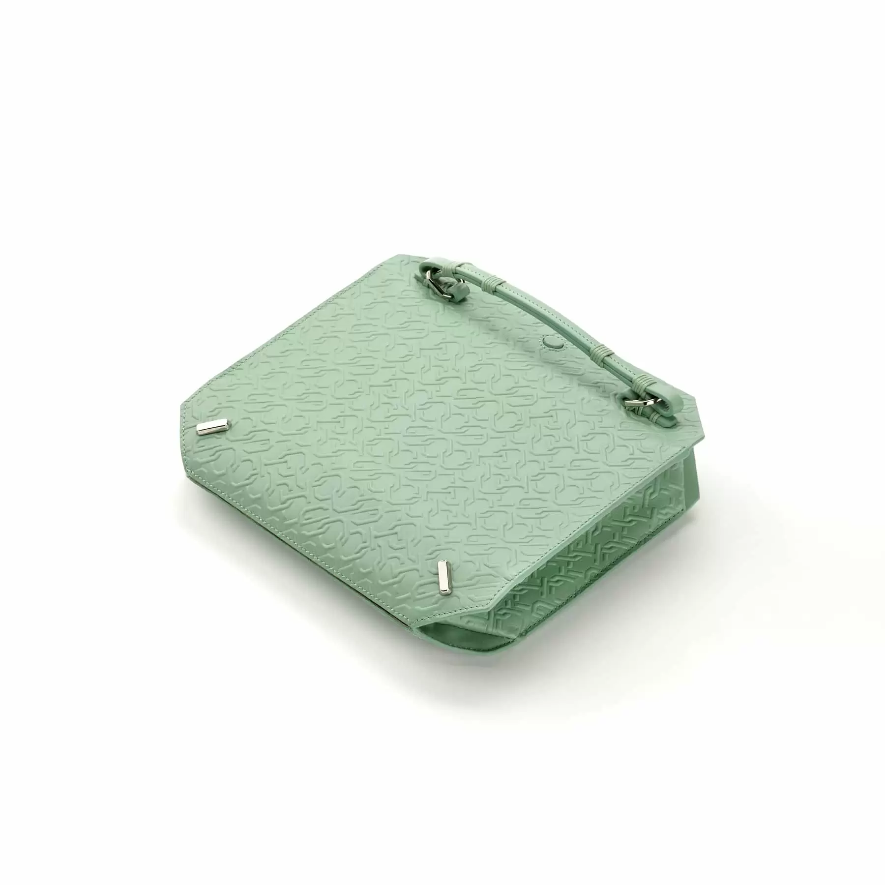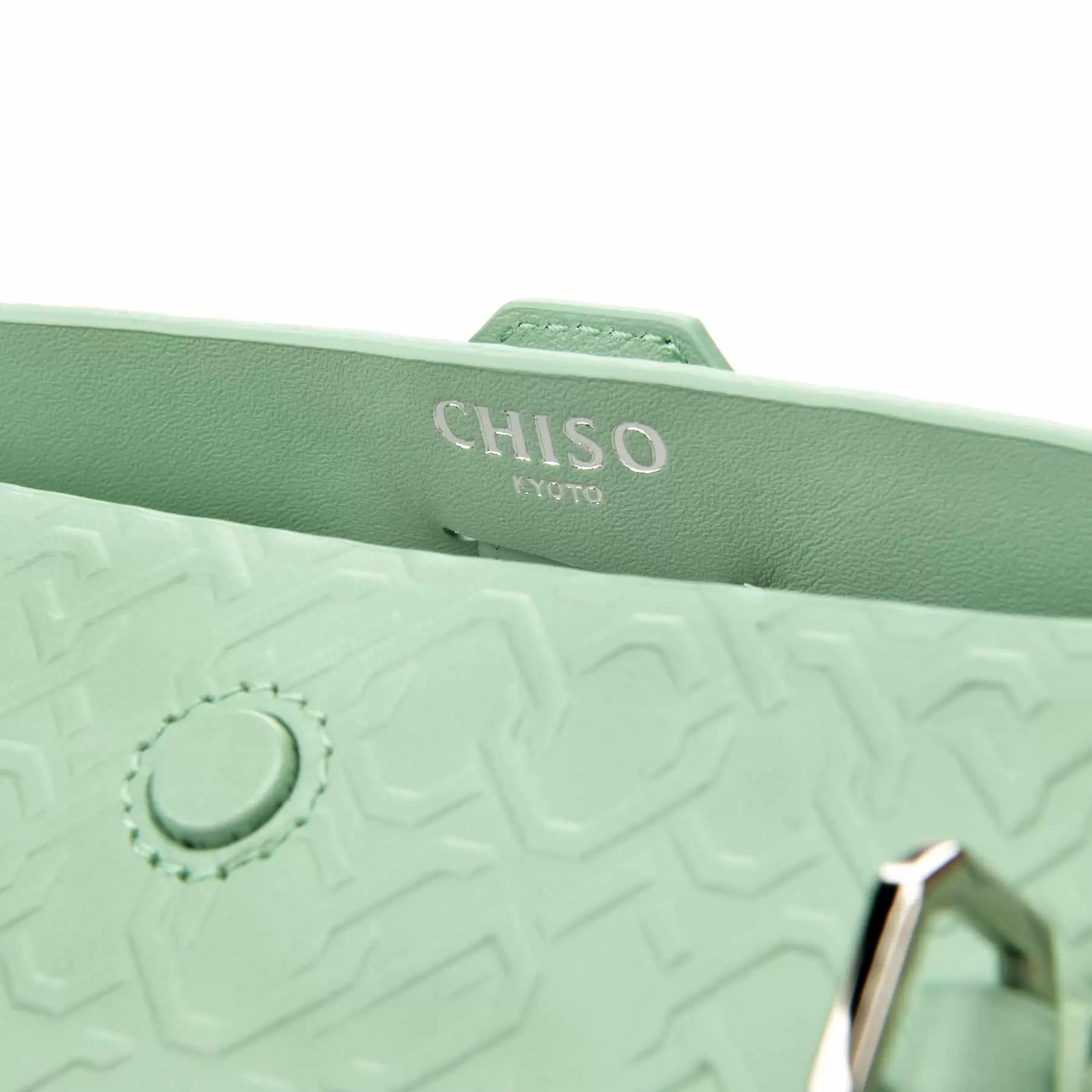 千總の紋にも使われている隅切り四角形をモノグラムデザインに仕上げ、型押しを施したボディー、竹籠バッグを思わせるハンドルの編み方、幾重にも重ねられたコバ塗りなど、日本の職人の美しい手仕事が随所に生かされています。