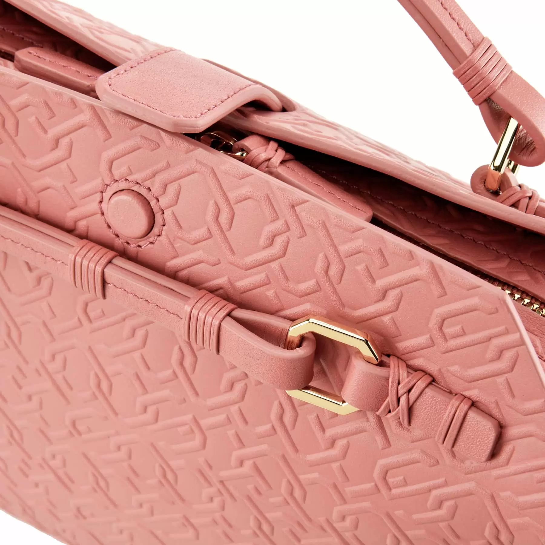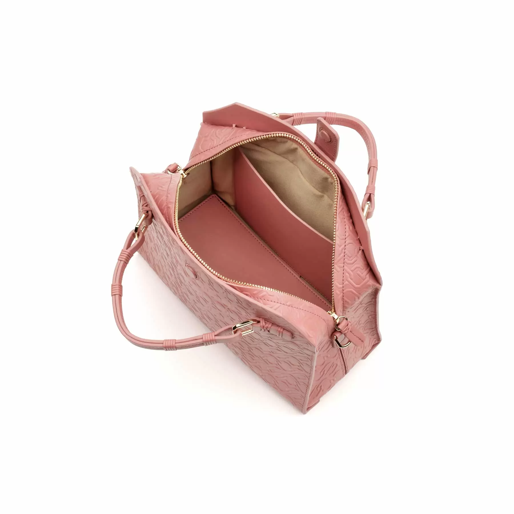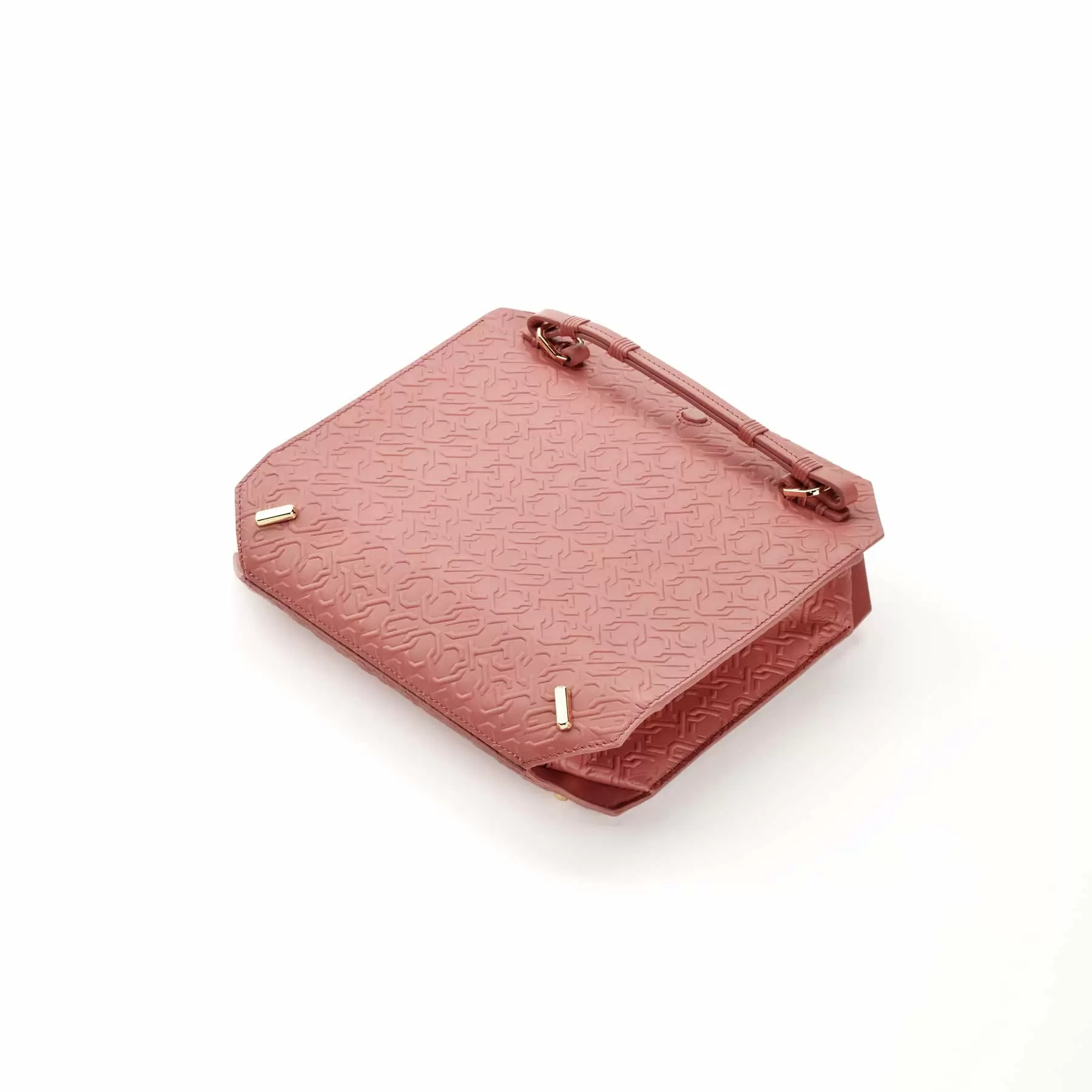千總の紋にも使われている隅切り四角形をモノグラムデザインに仕上げ、型押しを施したボディー、竹籠バッグを思わせるハンドルの編み方、幾重にも重ねられたコバ塗りなど、日本の職人の美しい手仕事が随所に生かされています。
