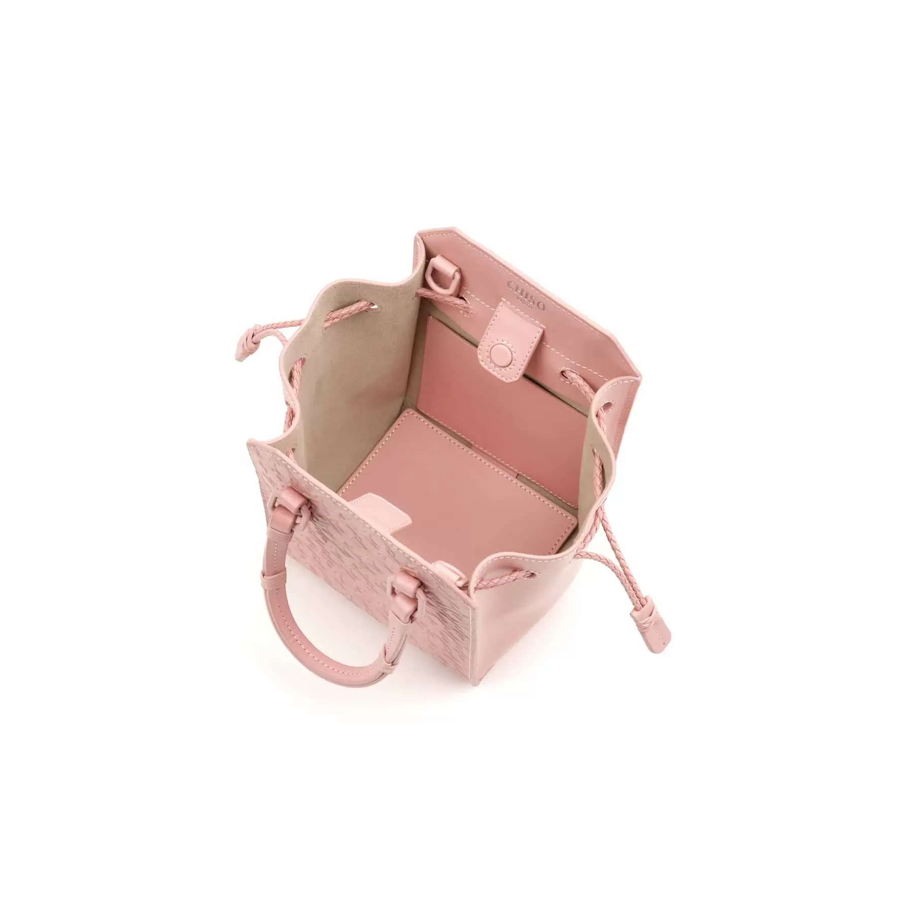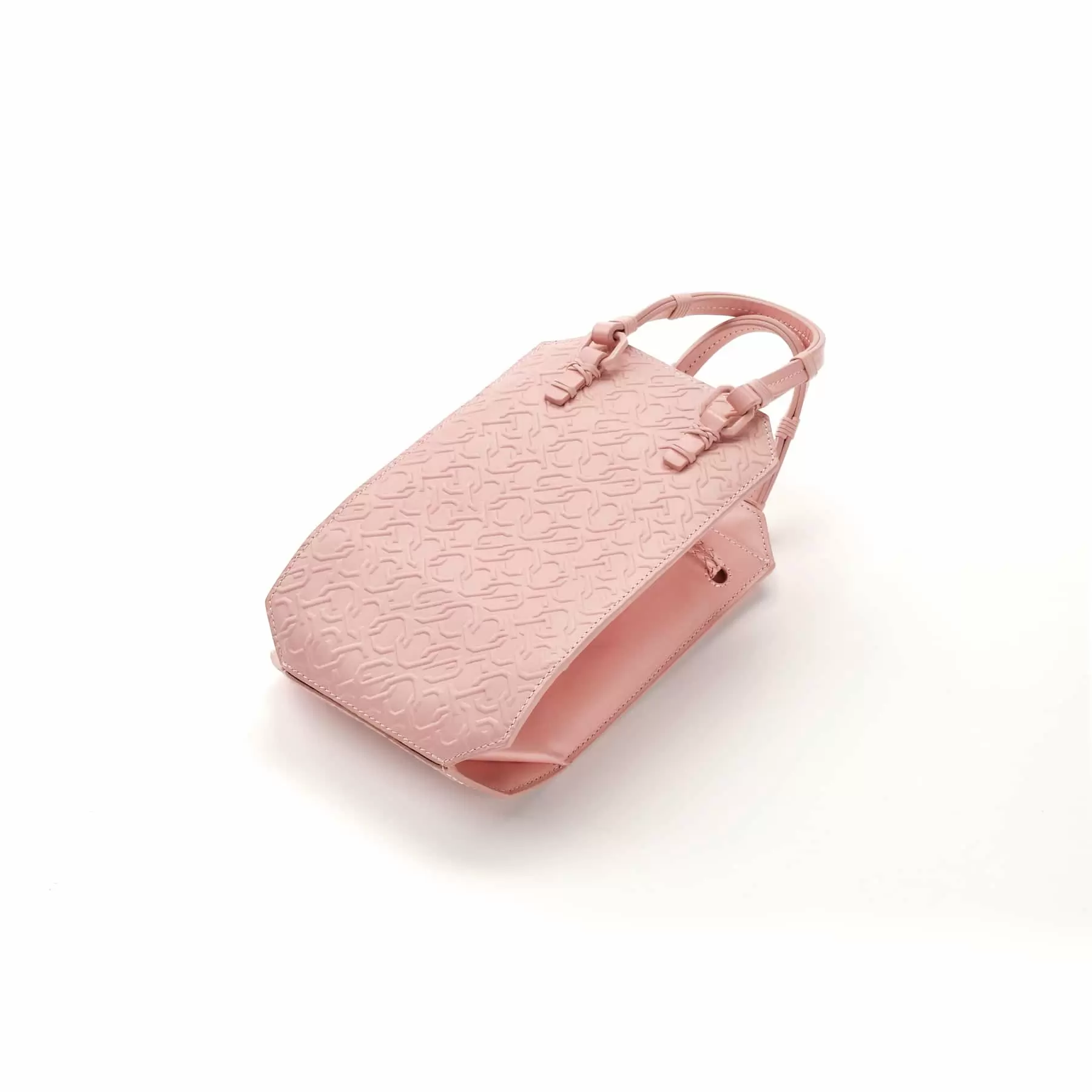 千總の紋にも使われている隅切り四角形をモノグラムデザインに仕上げ、型押しを施したボディー、竹籠バッグを思わせるハンドルの編み方、幾重にも重ねられたコバ塗りなど、日本の職人の美しい手仕事が随所に生かされています。