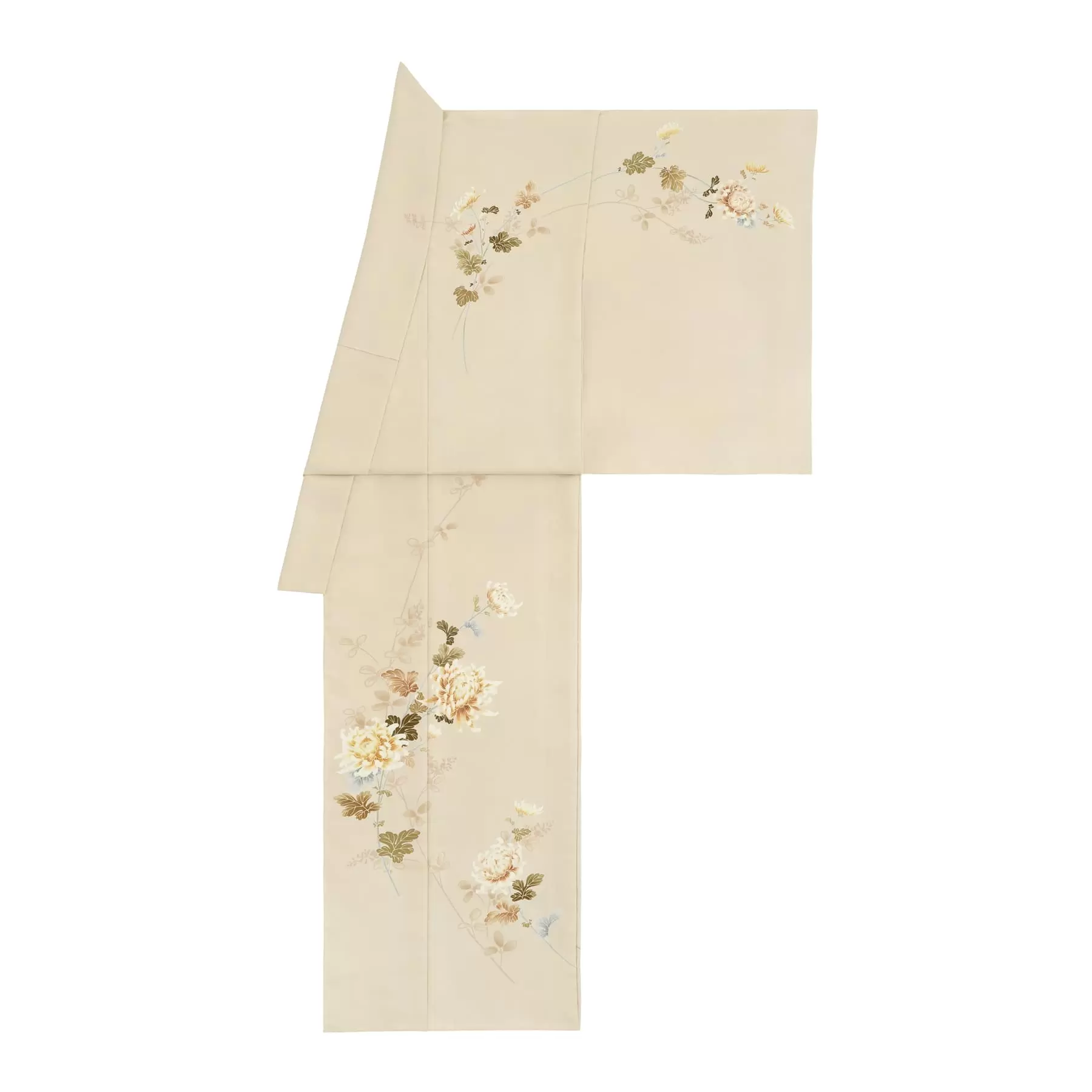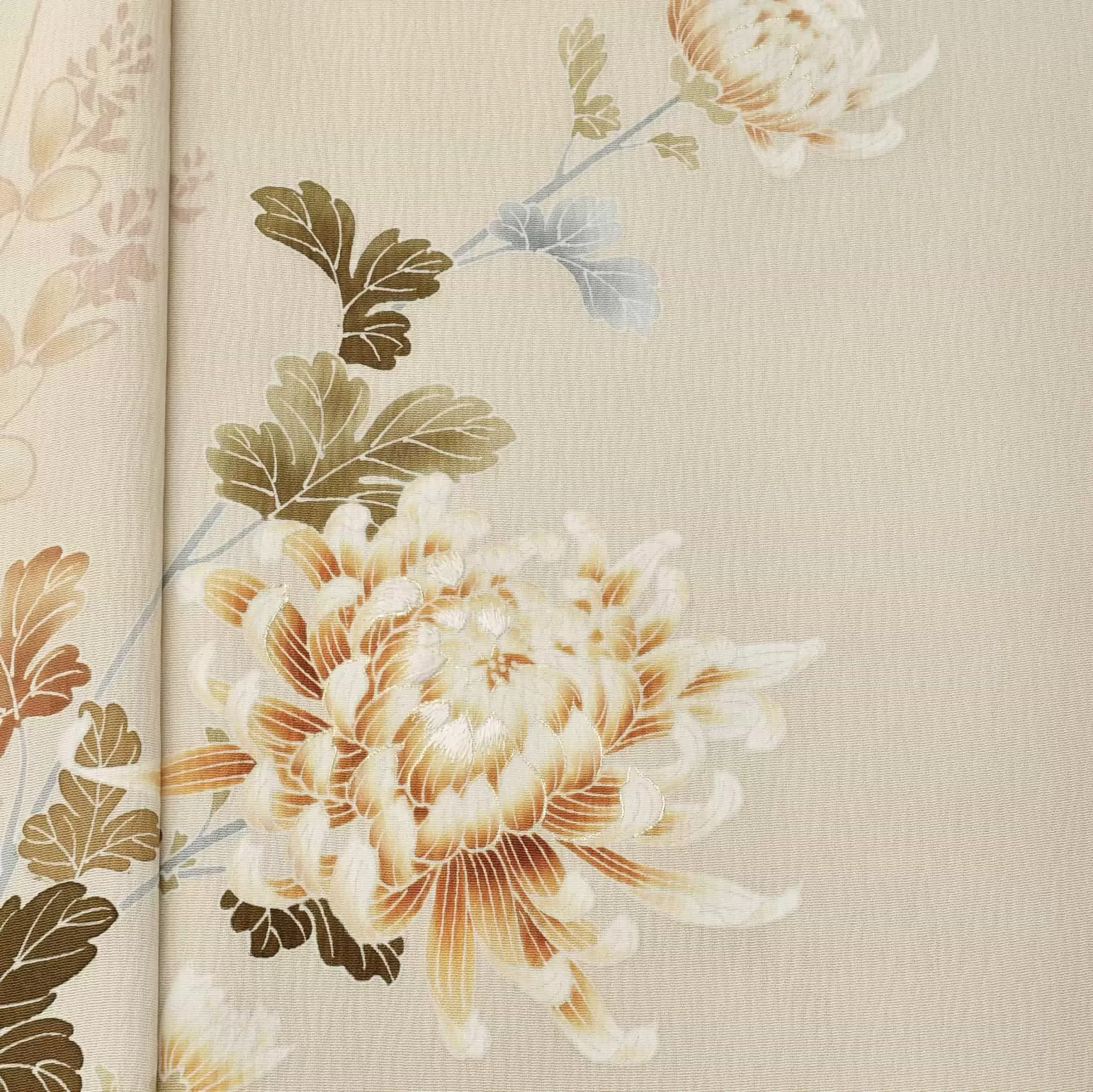 ひぐらしの声が聞こえる森の中、風に優しく揺れる花々を描き出しました。自然が生み出すやわらかな曲線が重なり合い、ハーモニーを奏でているような優雅な訪問着です。