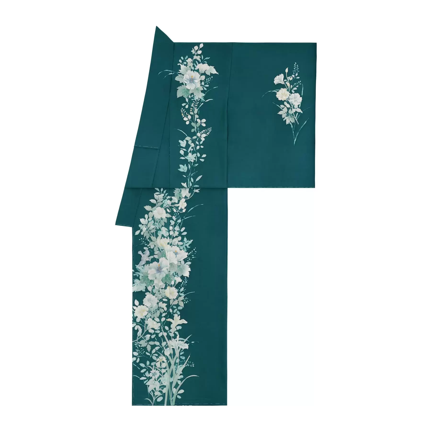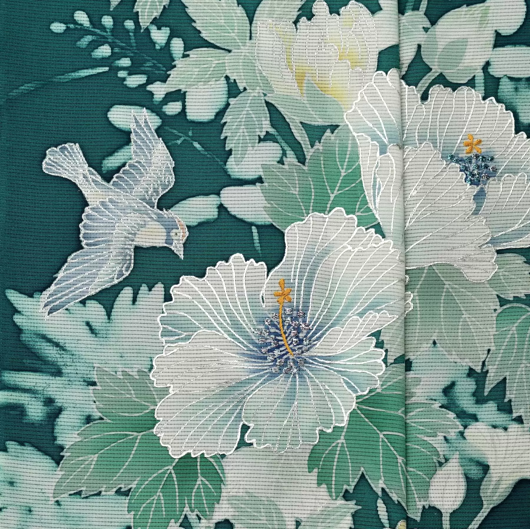 夏の眩い日差しの中で、生き生きと咲き誇る花々の生命力を瑞々しく描き出しました。深い森の中を思わせる濃い緑の地色に浮かび上がる白の花々が、爽やかさとともに、幻想の世界へ誘ってくれる美しい訪問着です。