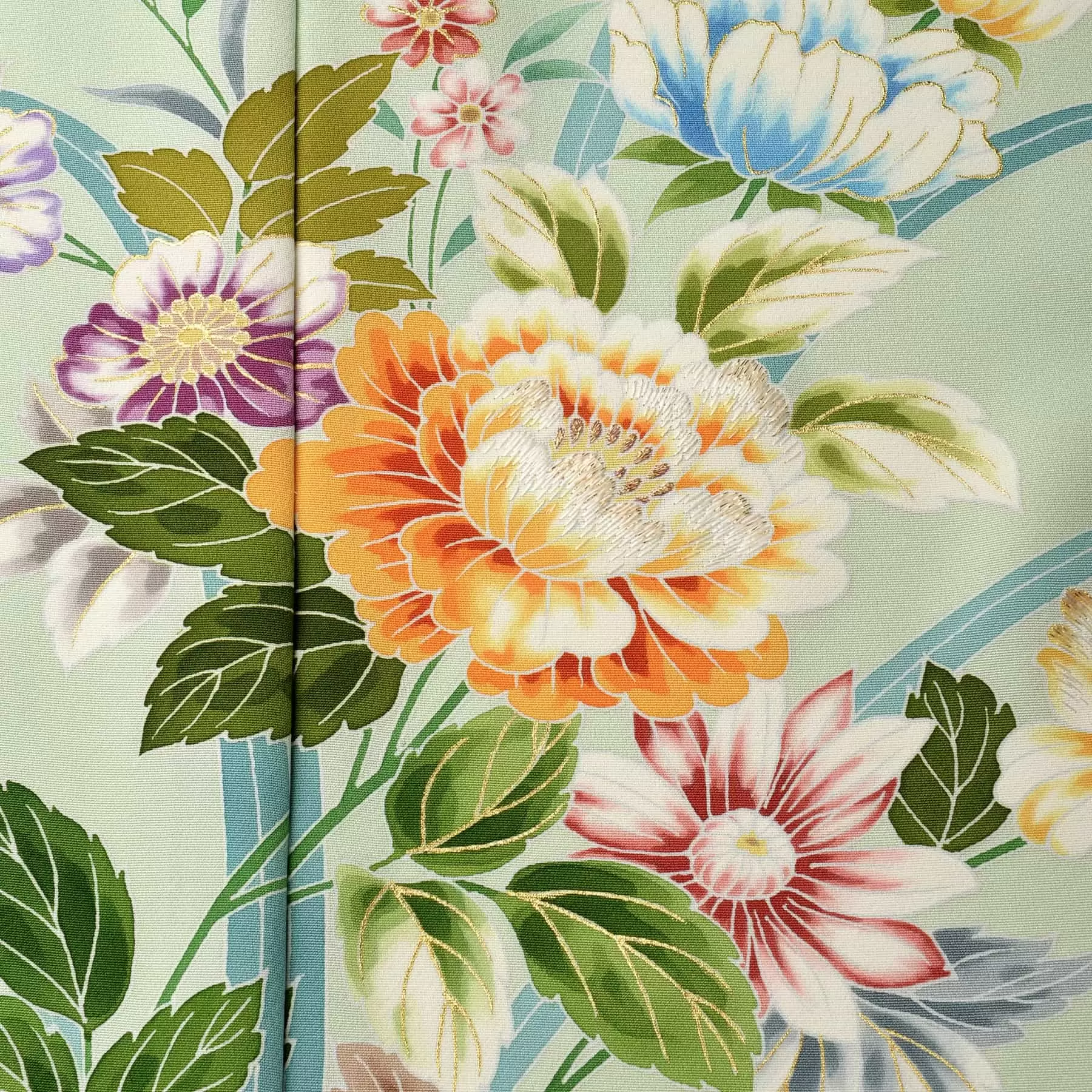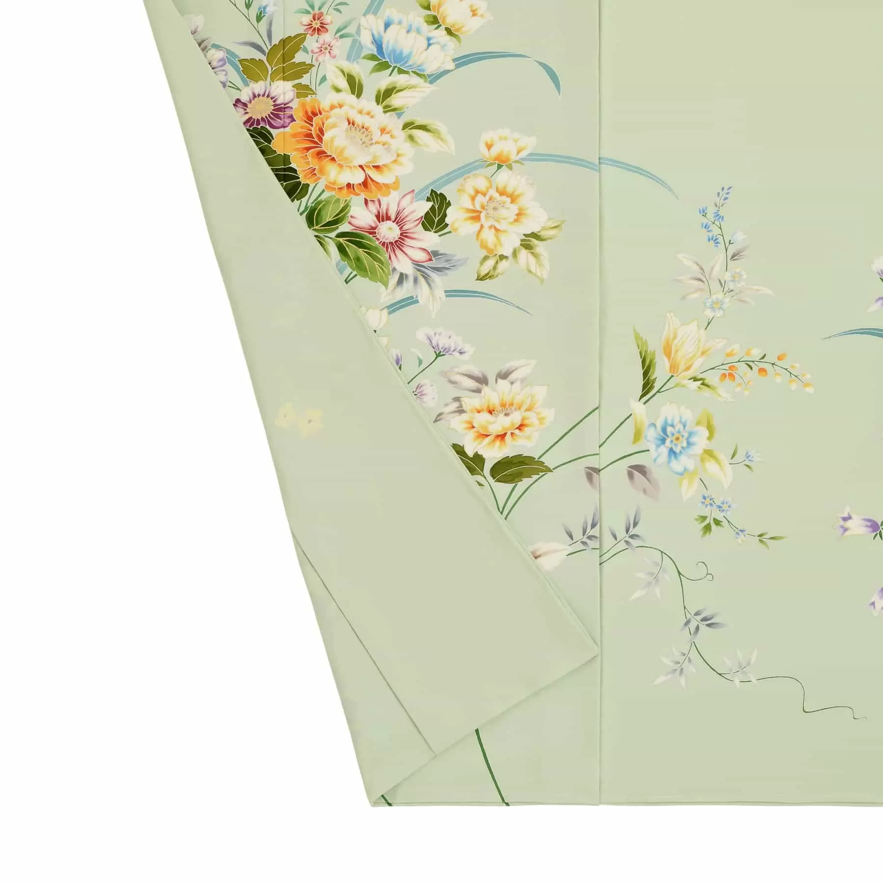 透き通るようなミントグリーンの地色に、エレガントな雰囲気が漂う唐花文様を組み合わせた華やかな訪問着です。花々や葉を繋ぐように伸びる茎の曲線が、着姿を美しく演出してくれます。