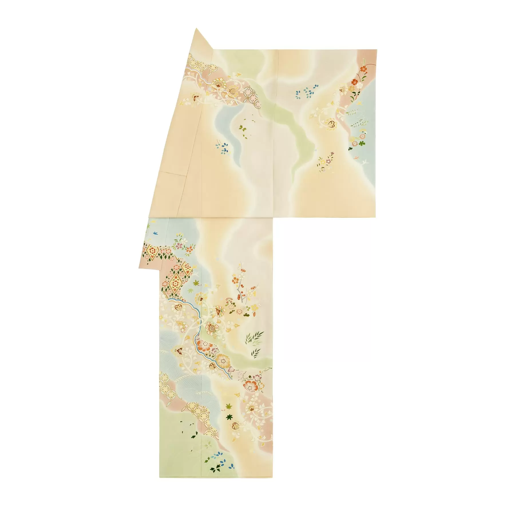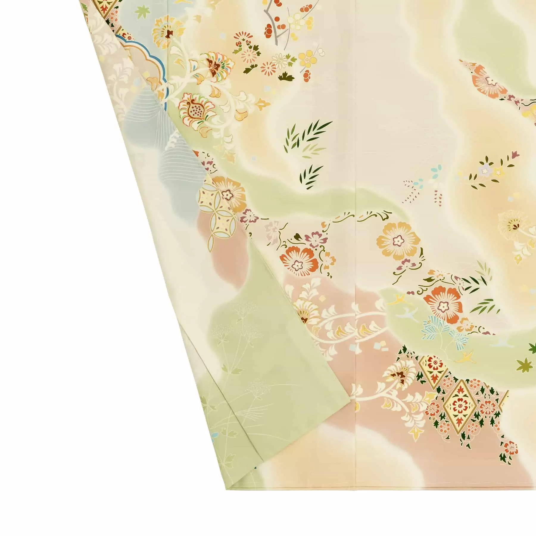 平安の典雅な雰囲気を伝えてくれる料紙紋様の訪問着です。当時は貴重であった和紙を貼り合わせた料紙の、うっとりするような美しさを、きものの上に写し取ったような古典文様の定番のデザインです。やわらかいグラデーションと流れるようなラインが、体型を問わず着姿を美しく見せてくれます。