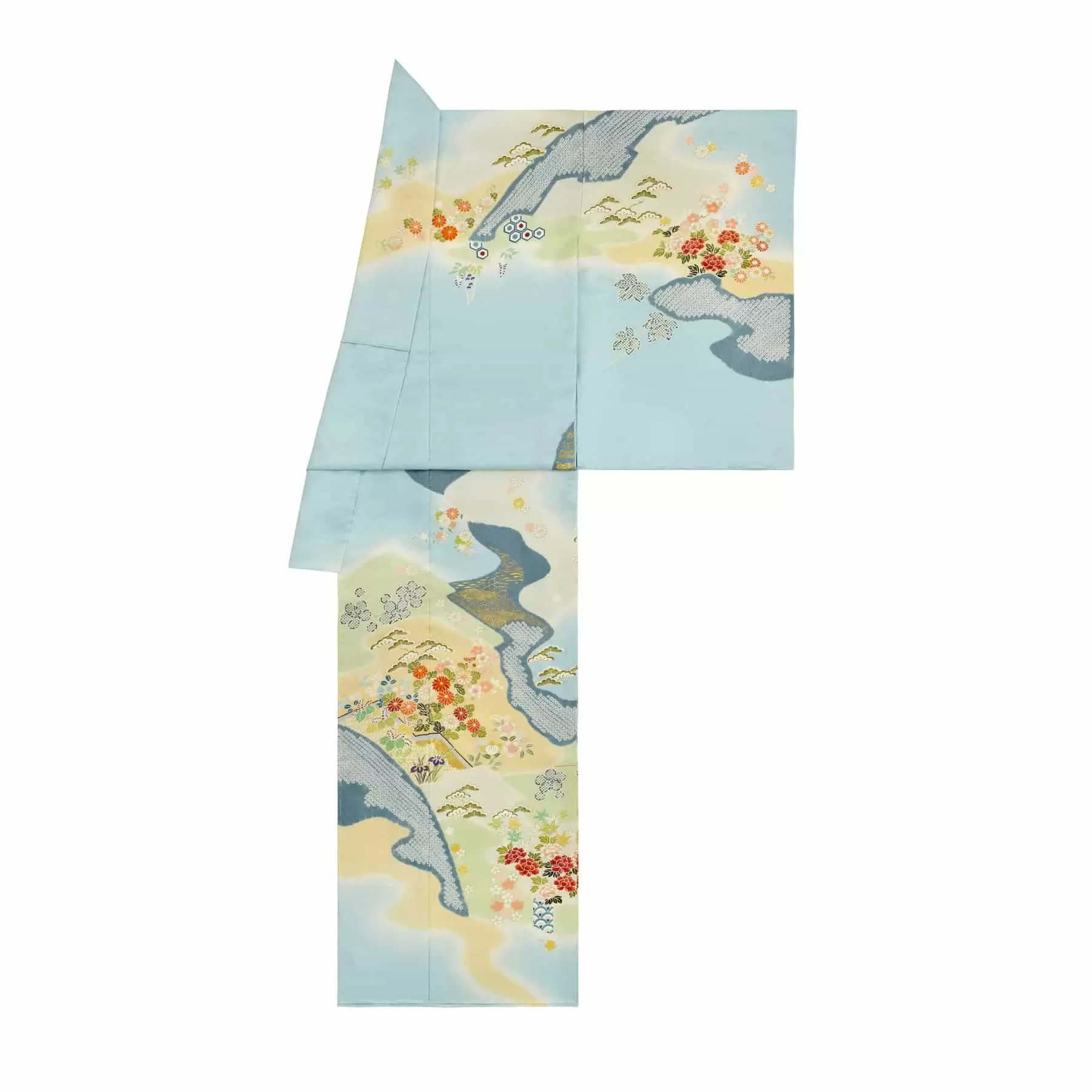 光沢のある空色の爽やかな訪問着です。山の稜線、川の流れ、雲のたなびく様などの自然の風景を抽象的に描き出した慶長小袖をベースに、自然から生み出される曲線と草花文様を組み合わせて、上品な色使いの友禅染と絞り染で表現しました。江戸期の衣裳にみられる伝統的なデザインですので、安心して末永くお召しいただけます。