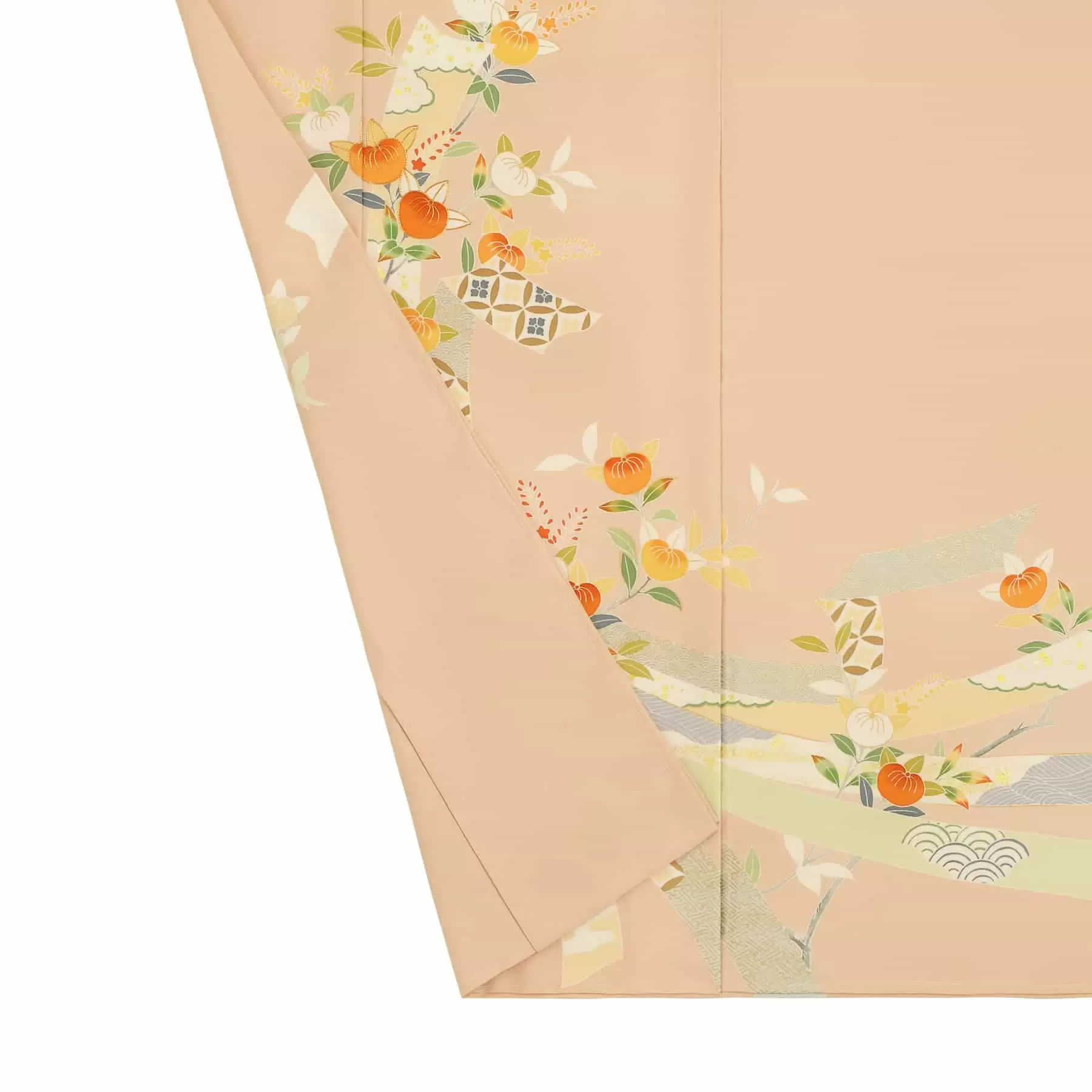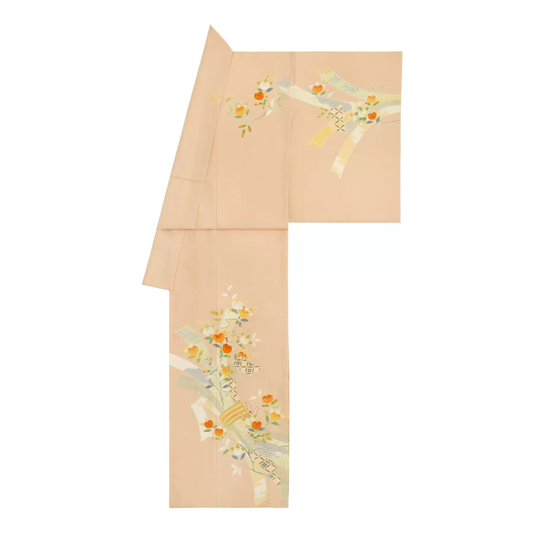深みのある華やかさを兼ね備えたサーモンピンクの地色に、代表的な古典文様の束ね熨斗と、伸びやかで枝ぶりの良い橘を合わせてデザインしました。多くの幸せを集めてくるといわれている束ね熨斗文様の流麗な雰囲気に、可愛らしい橘を合わせることで女性らしい品格と美しさを表現しています。