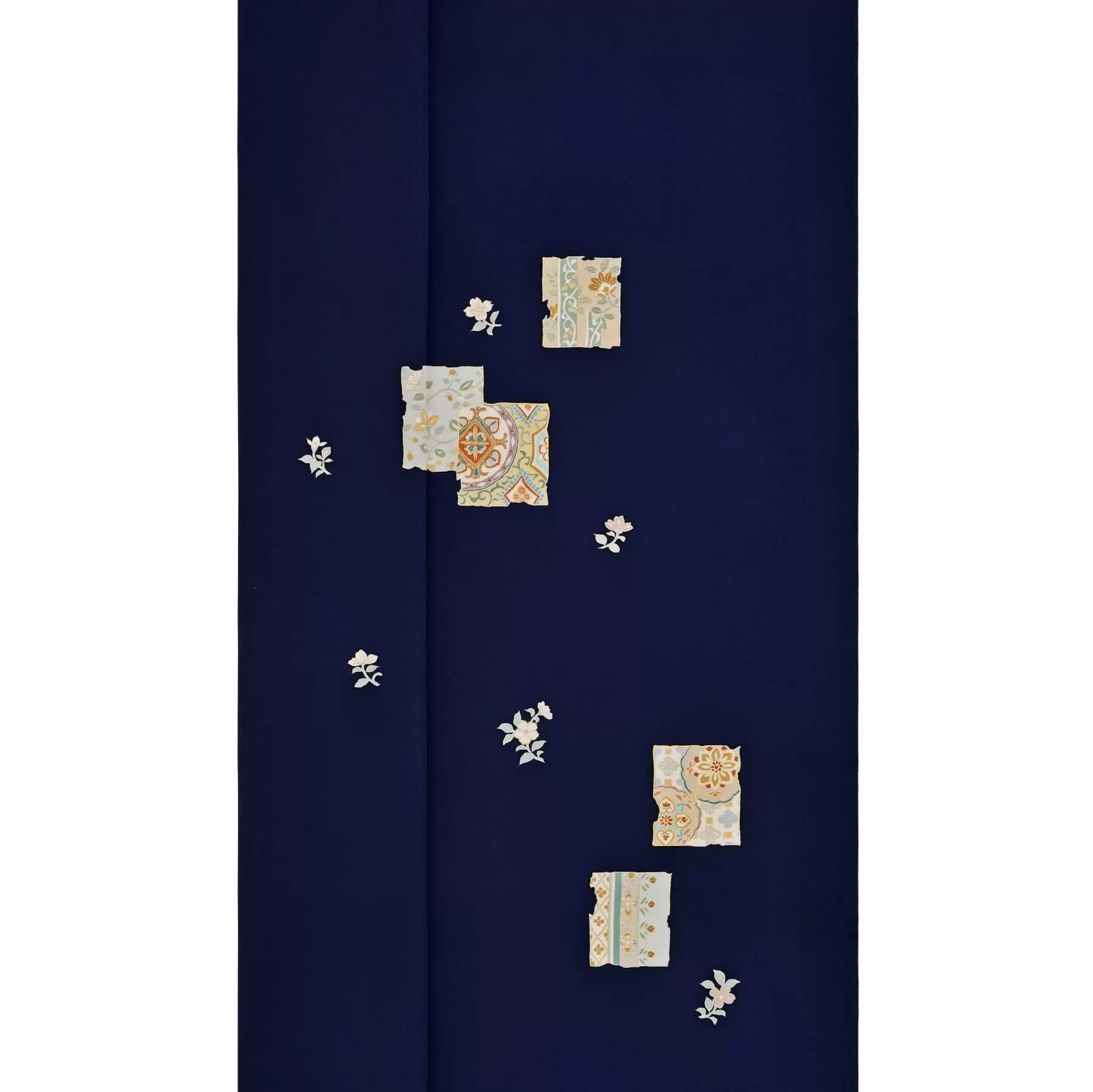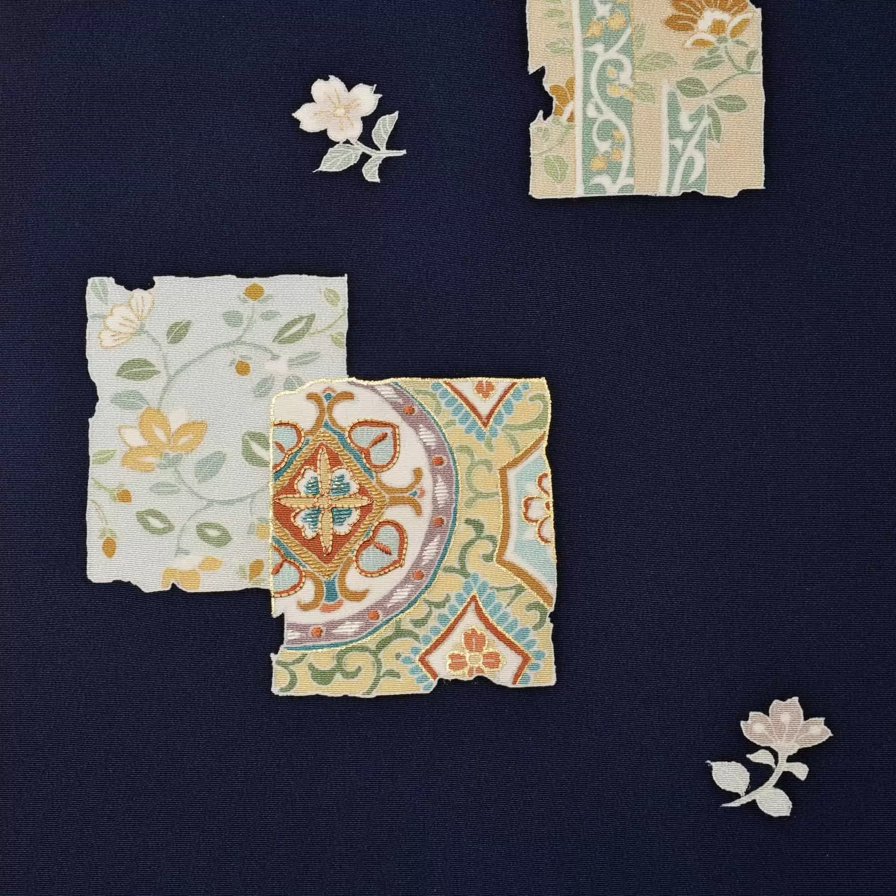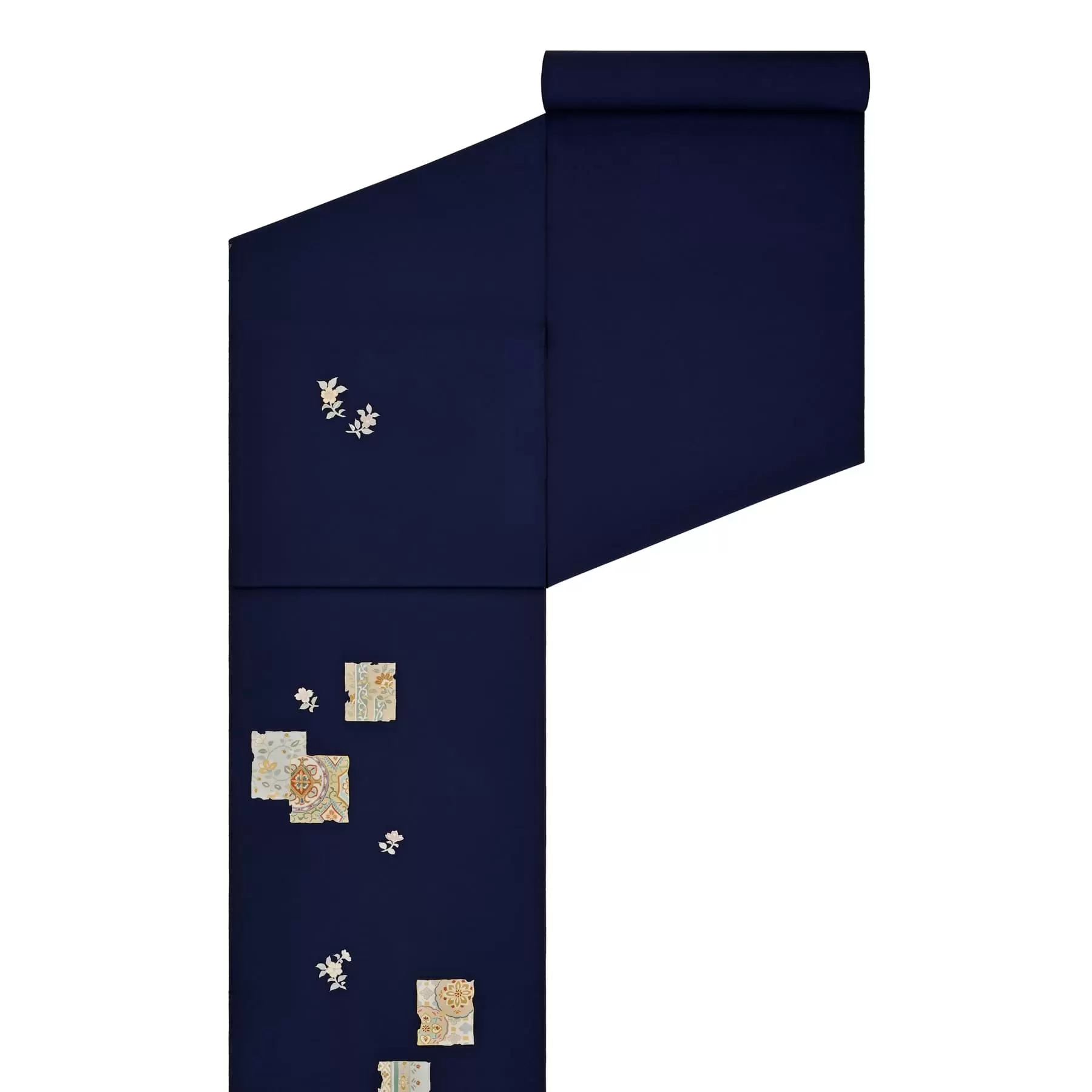 根強い人気の濃紺のすっきりとした付下です。大小の名物裂文様を飛び柄風に配することで、地色との対比で文様が美しく浮かび上がります。畏まり過ぎず、奥ゆかしいデザインは、着やすさをご提案できる一枚です。