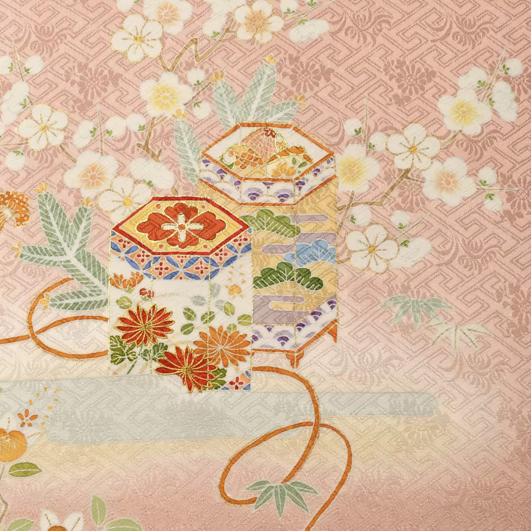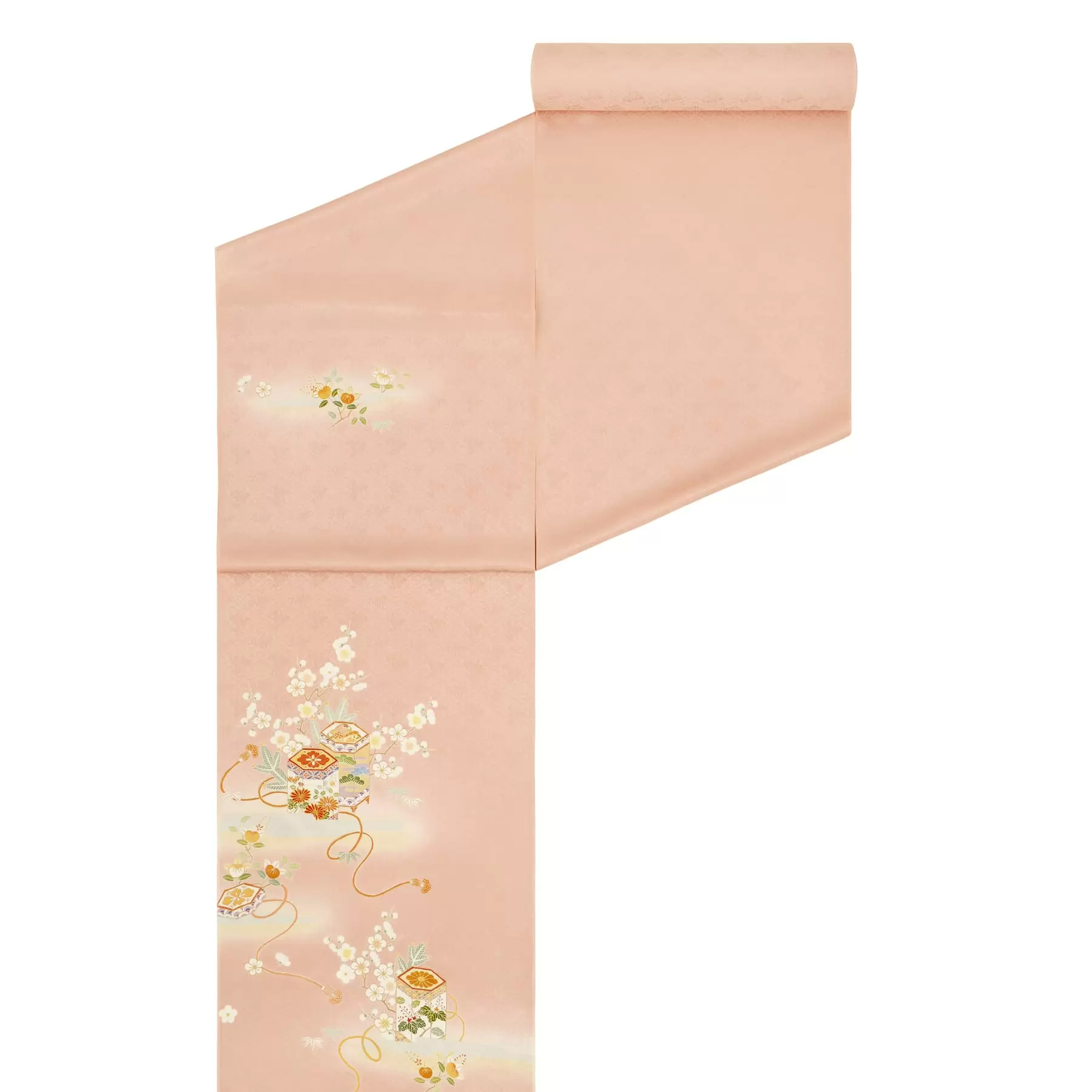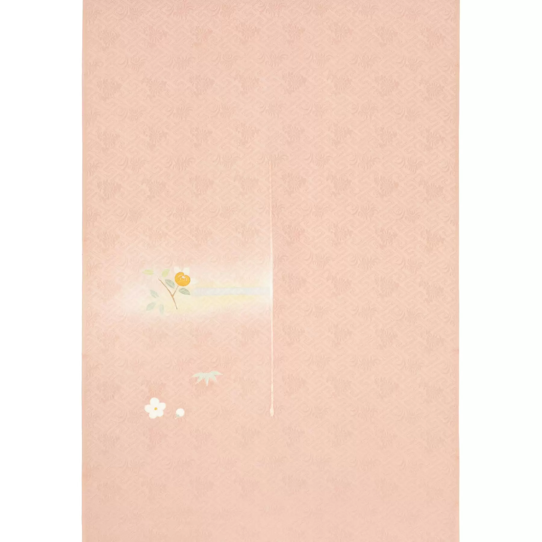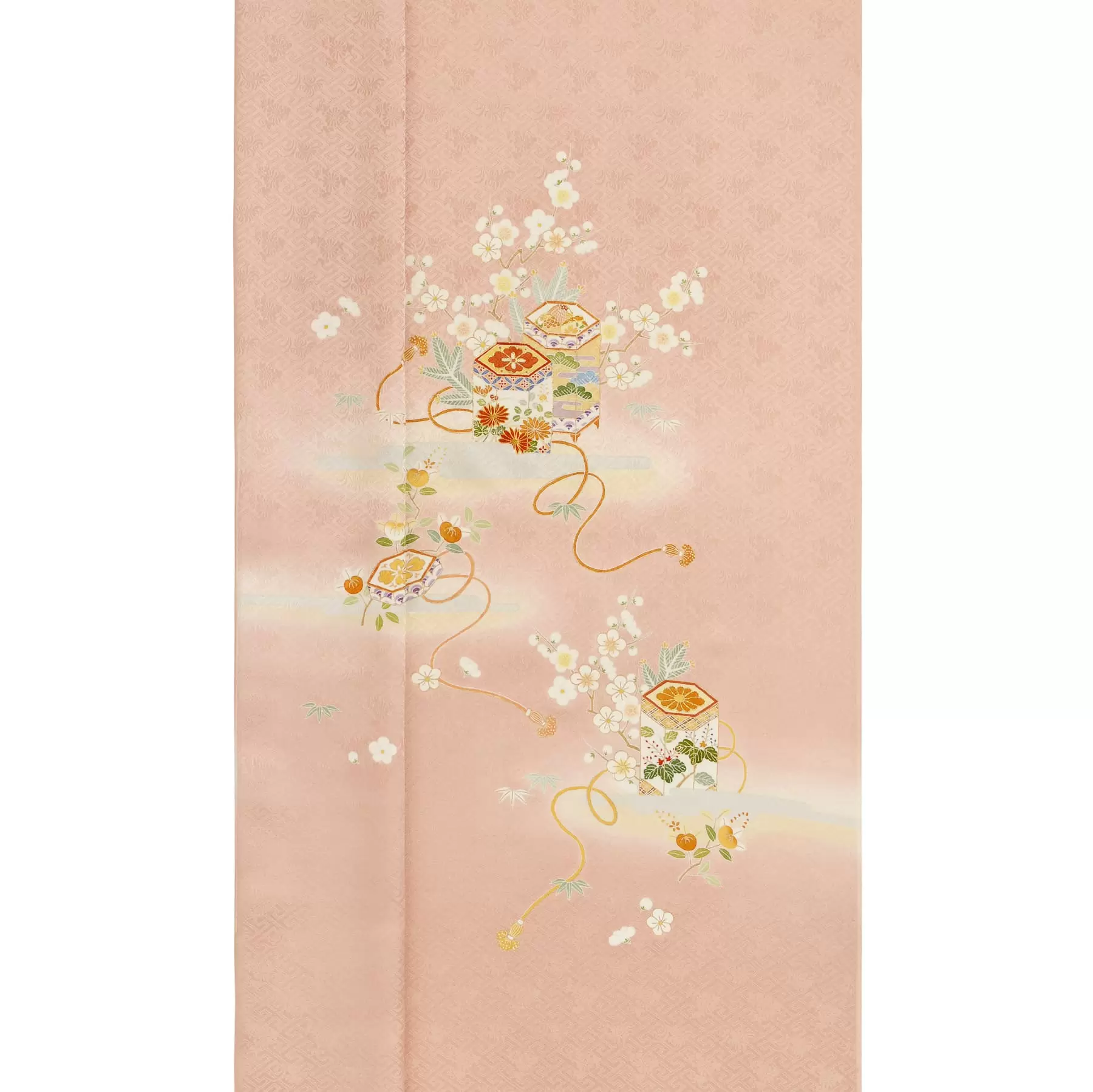 お顔が明るく映えるピンクの地色にクリーム色の暈しを組み合わせて、柔らかい雰囲気に染め上げました。はんなりとした地色に合わせて、雅やかな貝桶文様を付下らしい、すっきりとした小ぶりな構図で描いています。