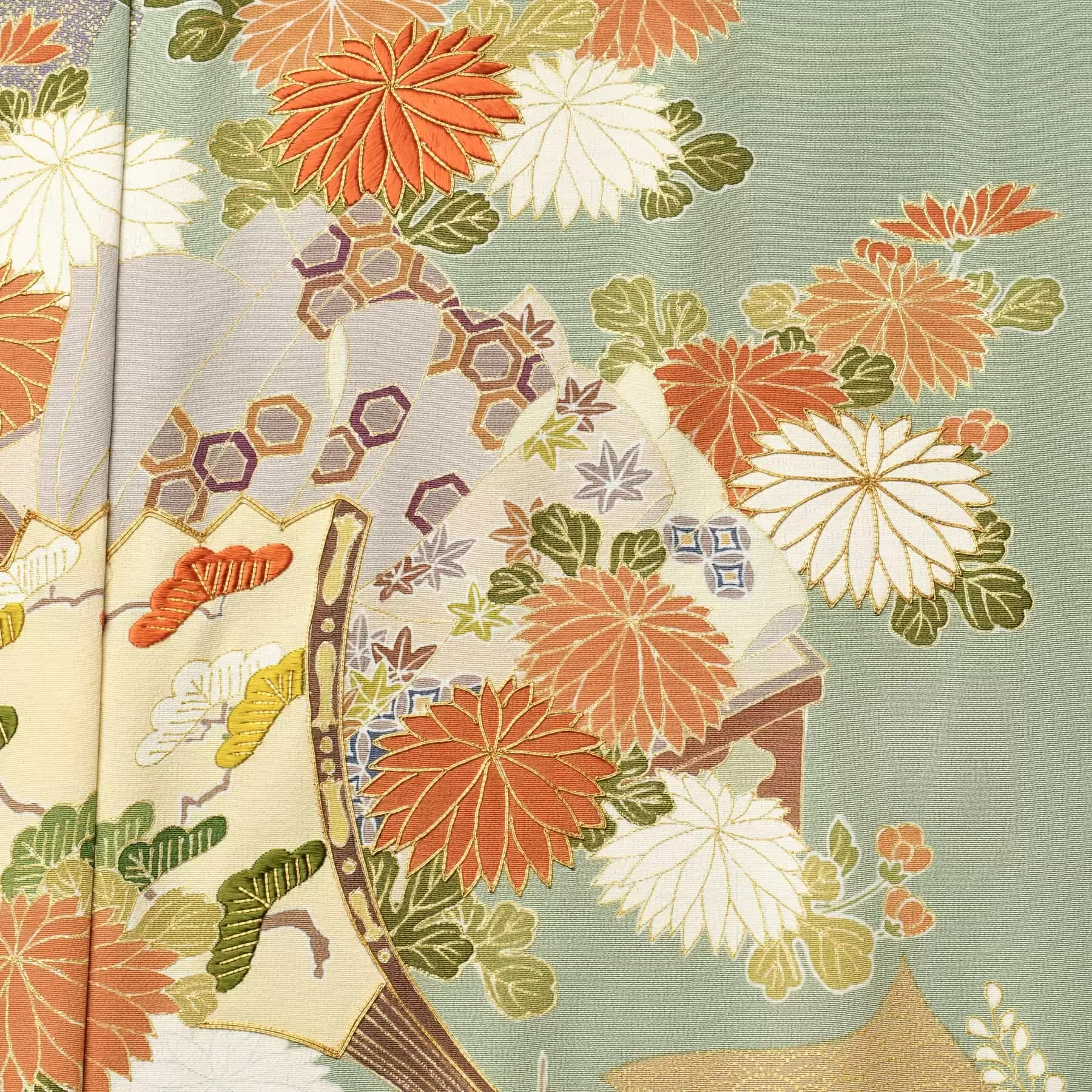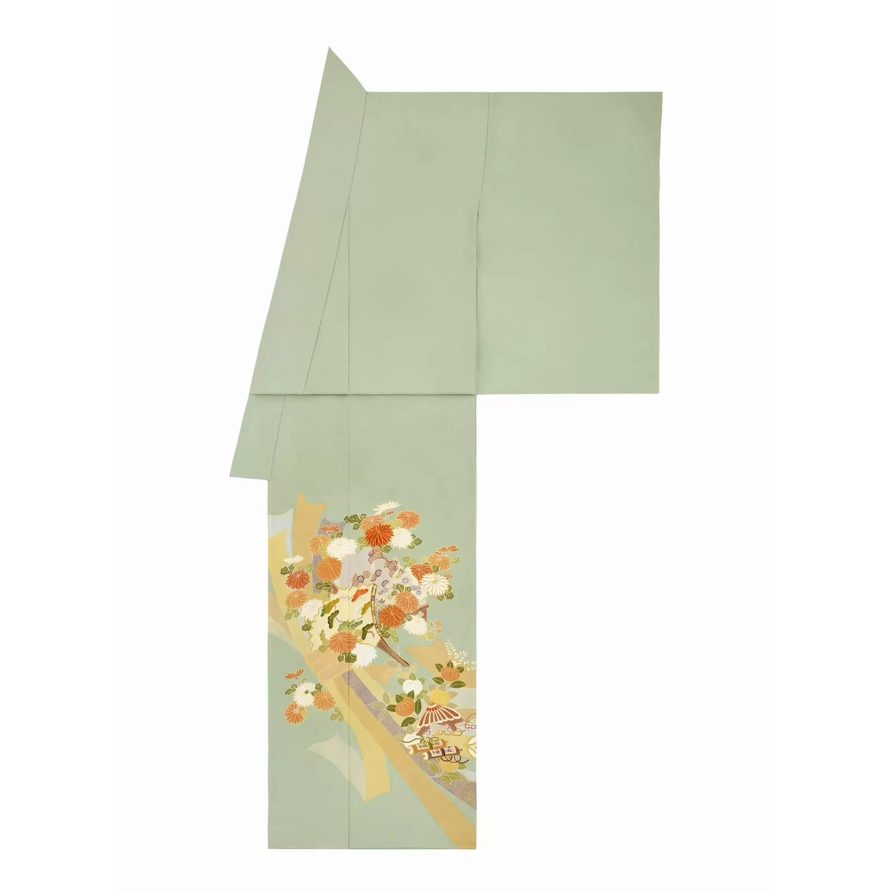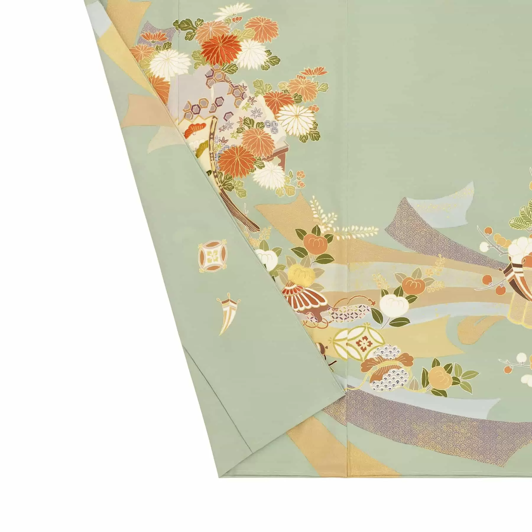 代表的な古典文様である束ね熨斗に、松竹梅や菊、宝尽くしや檜扇などのおめでたい文様を組み合わせた、定番の一枚です。