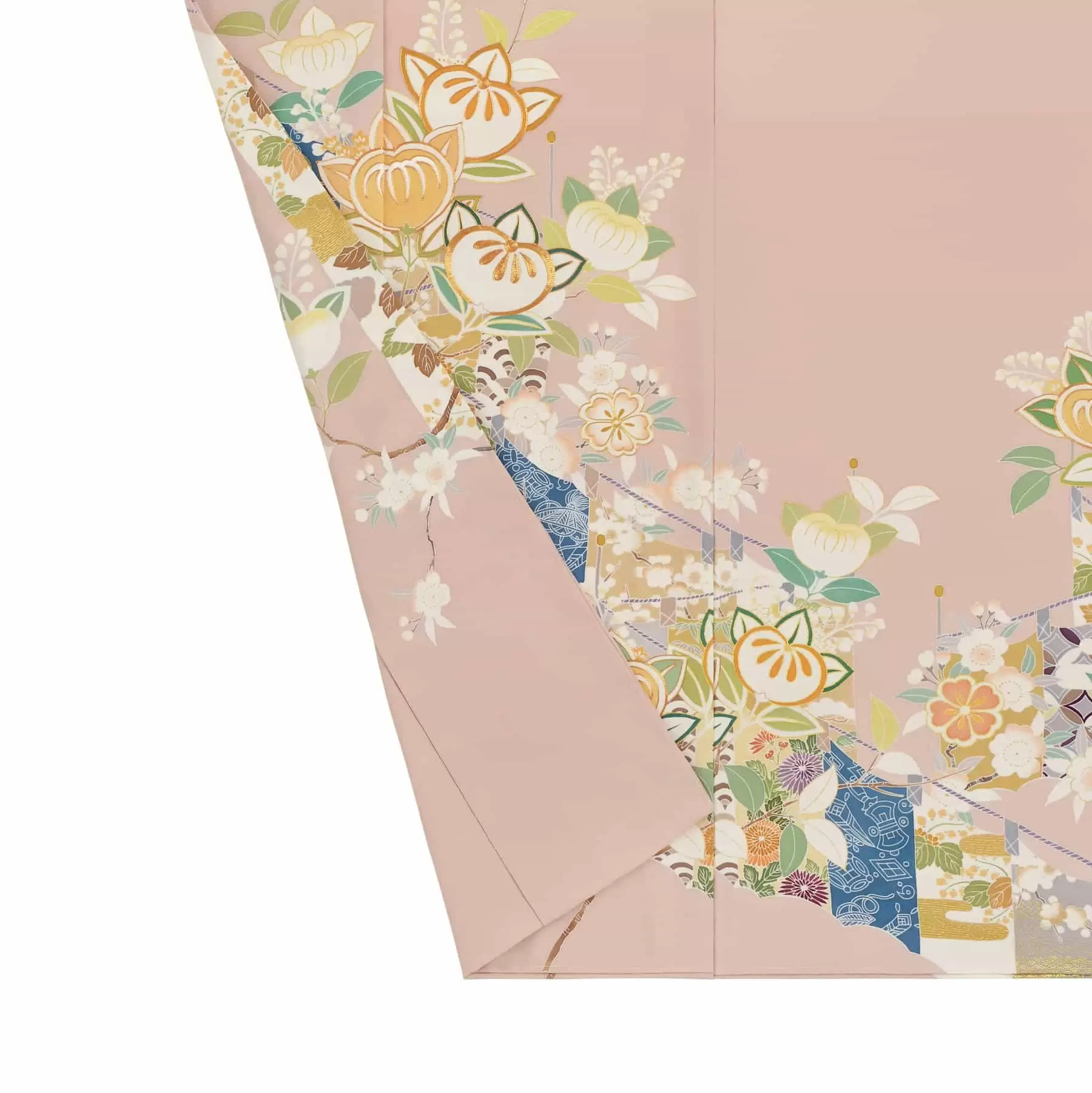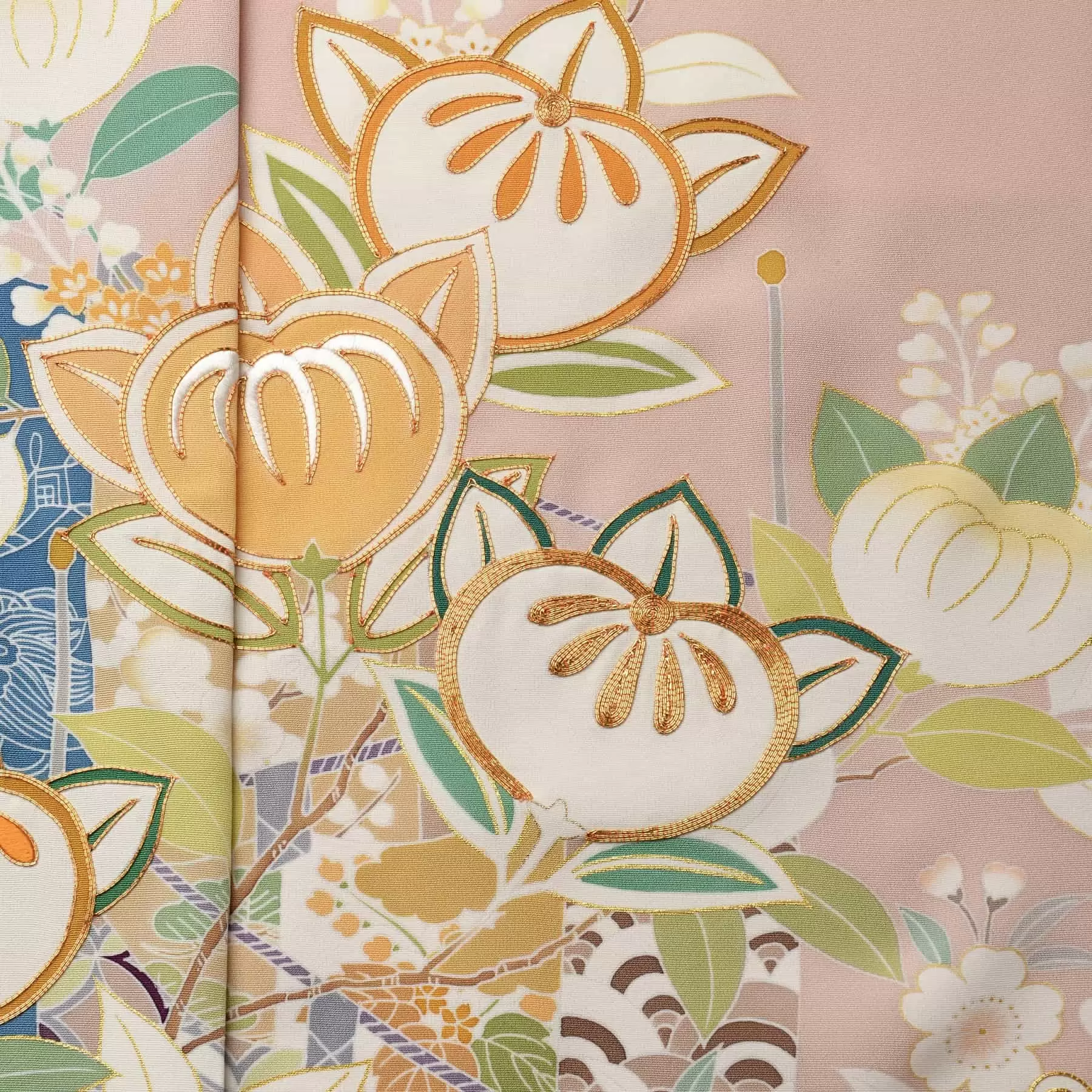 千總の紋であり、数少ない日本生まれの吉祥文様である橘と、晴れやかな場を彩る幔幕を組み合わせた千總らしい一枚です。