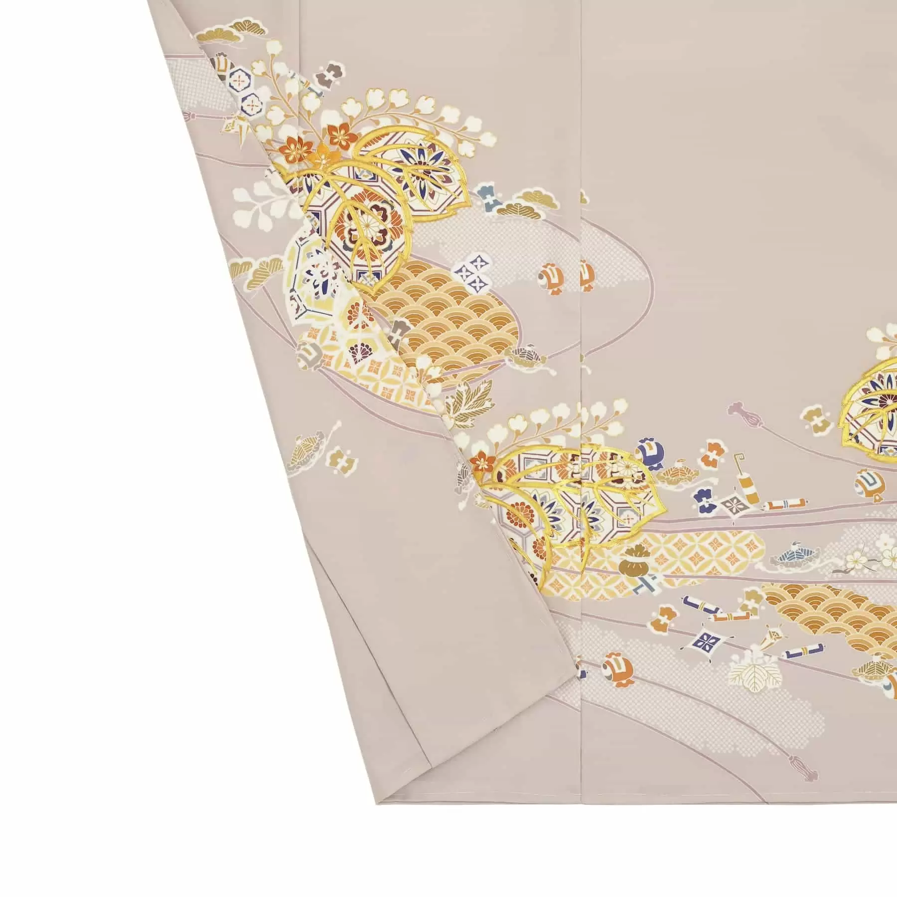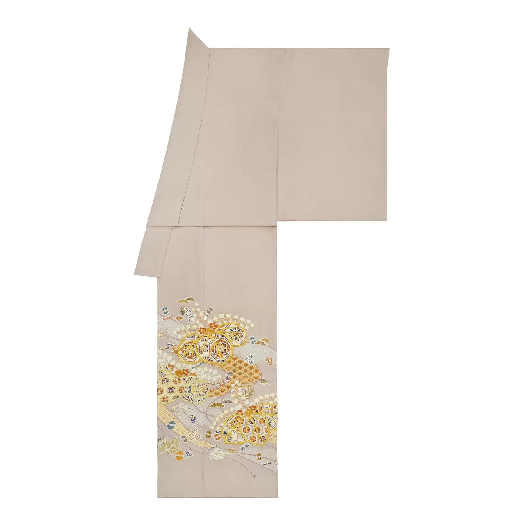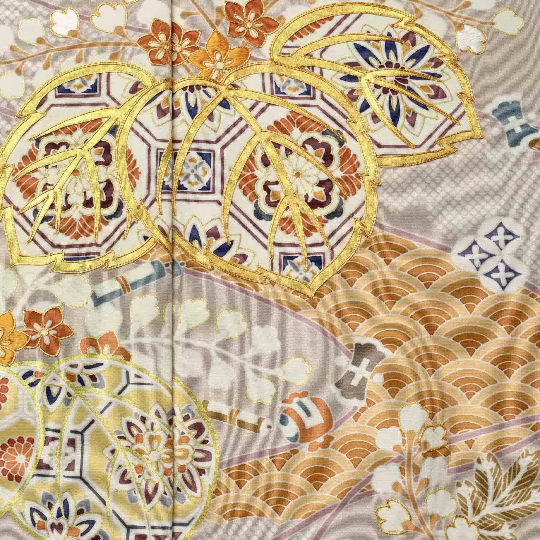 日本の文様の定番であり、皇室にゆかりの深い桐に合わせて、吉祥の文様を描きました。桐の中の美しい色合いが、おさえた地色の上に美しく浮かび上がる格調高い色留袖です。