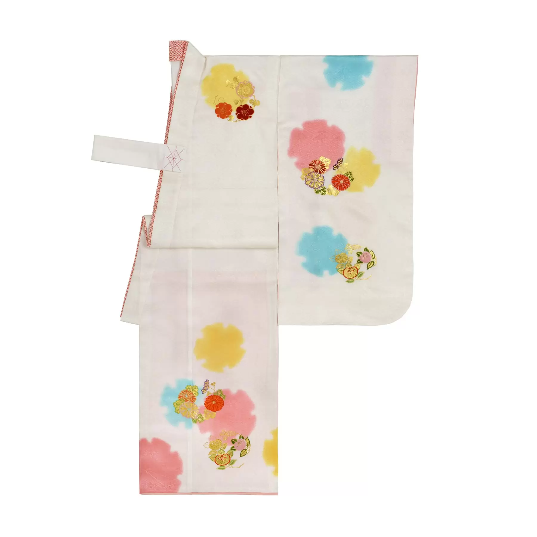 千總の三歳祝着は、正絹の八掛が付き、比翼仕立てになっています。比翼地は朱の疋田の柄で可愛らしさが増し、重ね着をすることで幸せが重なっていきますようにとの想いが込められています。