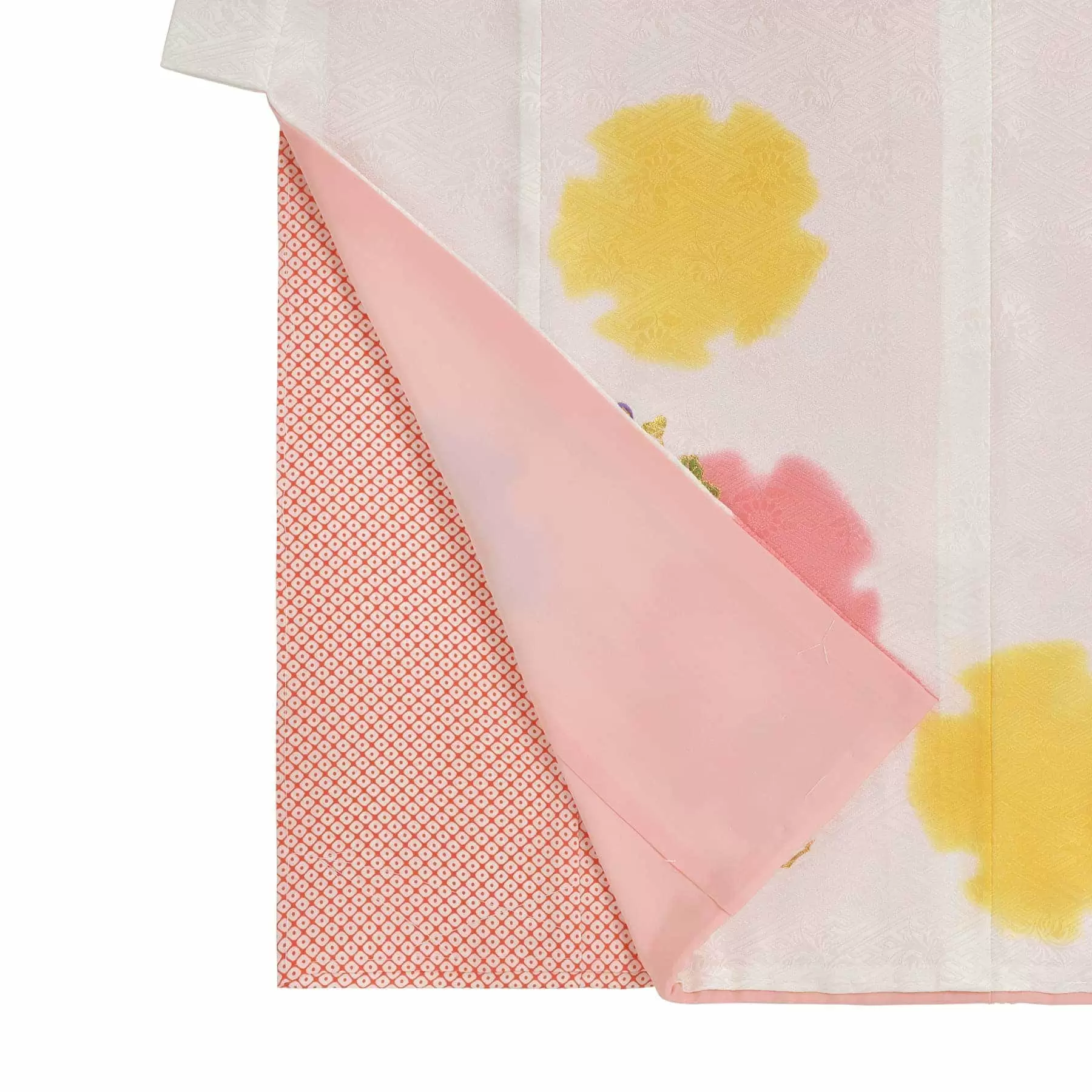 清楚で優しい白地に、やわらかな暈し染めを用いて豊かさをもたらしてくれるという雪輪文様を描きました。白の地色に、ピンク、水色、黄色と、大小様々の雪輪がリズミカルに舞い、刺繍や箔で描かれた草花が上品に華やかさを演出しています。