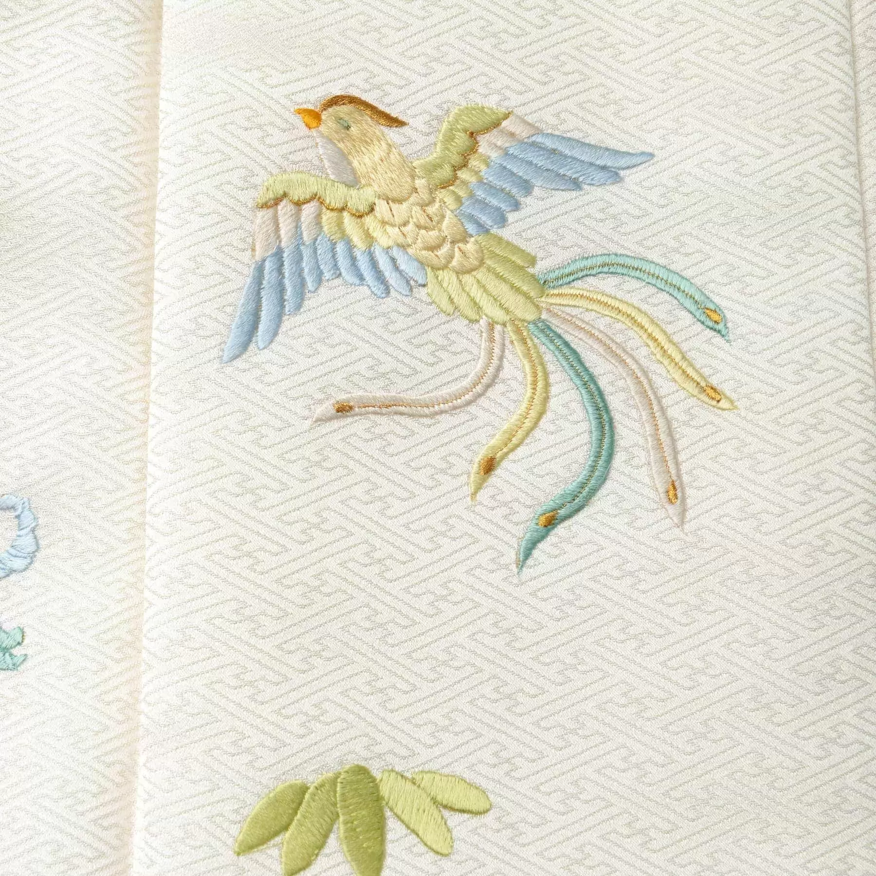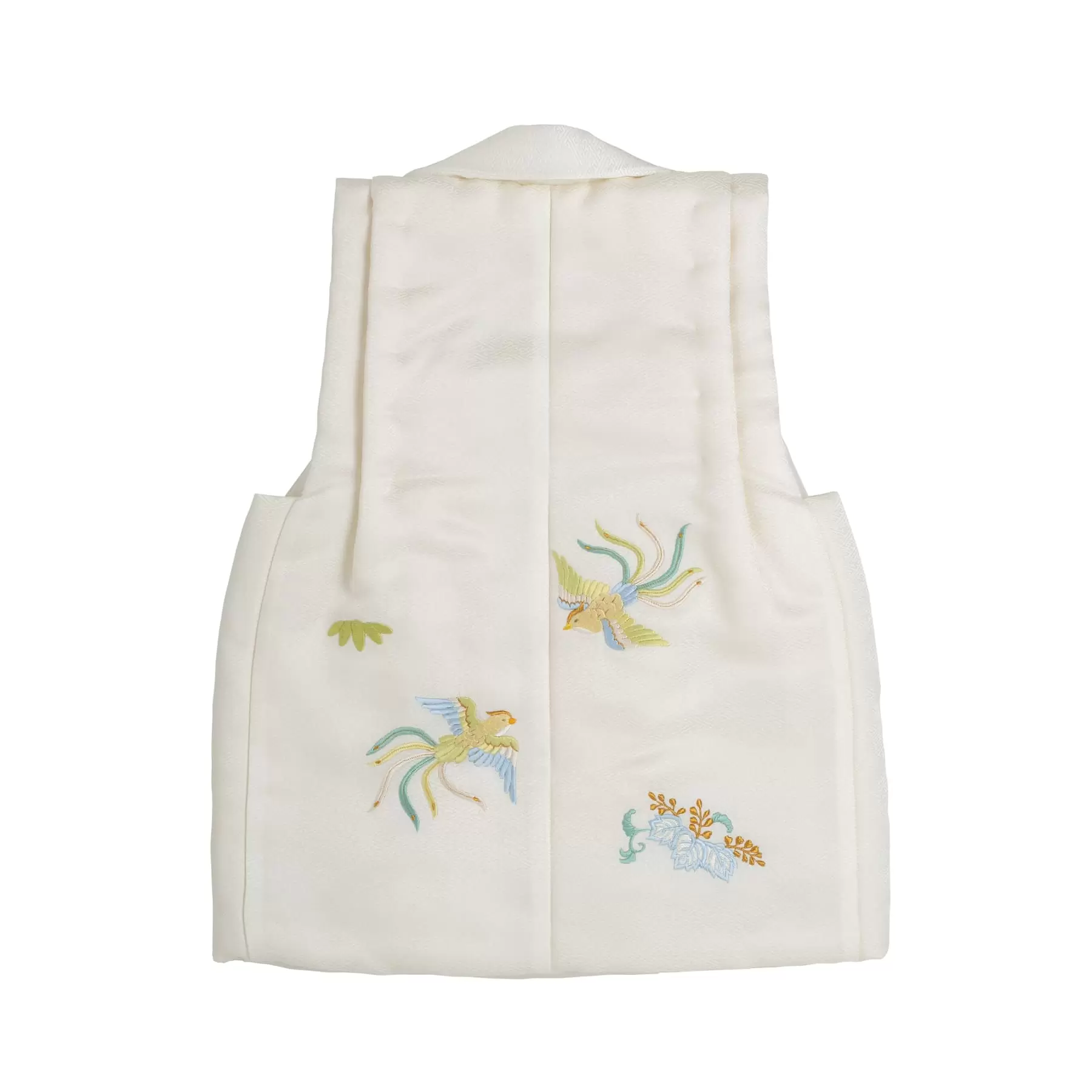 上質な正絹の艶やかさを感じる真っ白の生地に、優しい色合いで鳳凰や桐などの、吉祥文様を刺繍しました。自然のままの絹色は誠実さを表し、真っ直ぐで誠実な生き方の中にこそ、鳳凰が飛翔し幸福の前触れをもたらすといった願いを込めています。