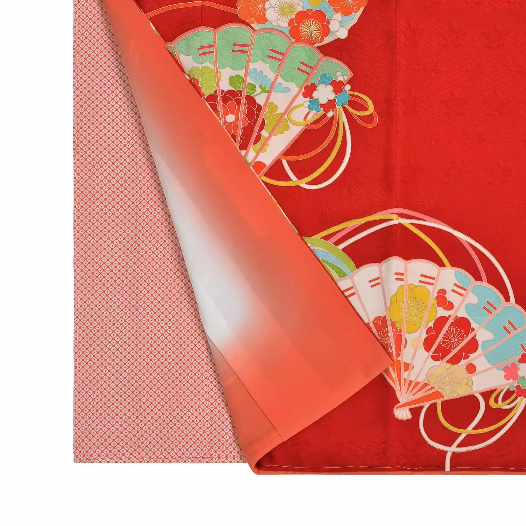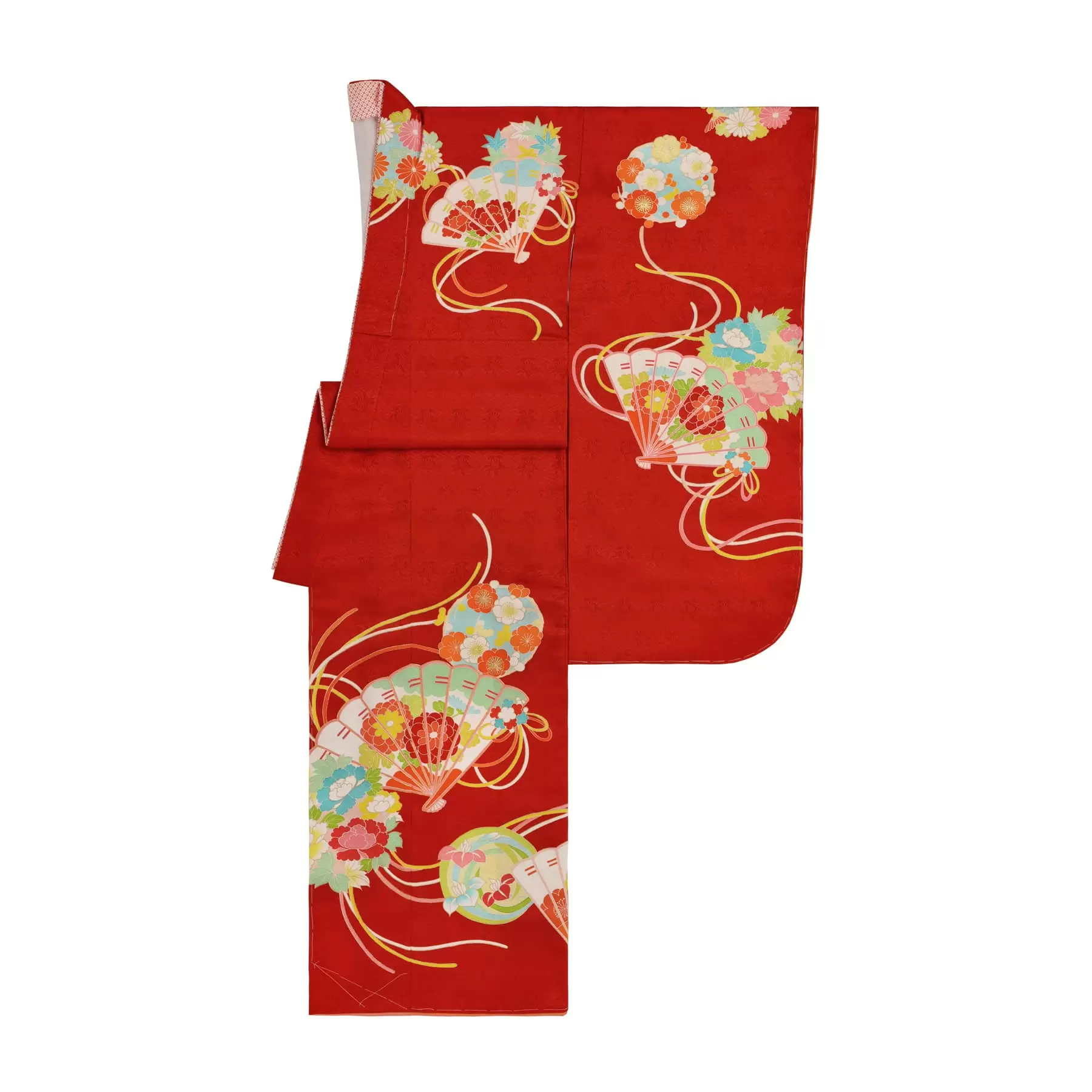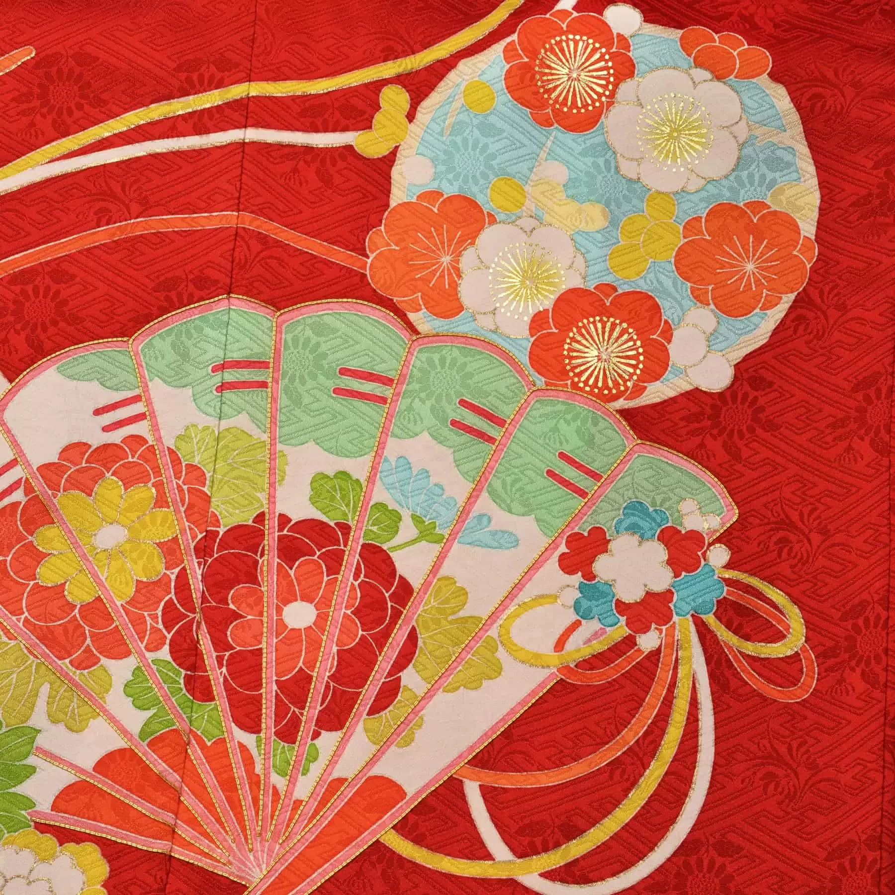 平安の雅やかな世界観を描いてきた千總らしい王道の一枚です。厄除けの色である赤の地色に、豊かな人生を象徴する檜扇と、縁を繋ぐ花の丸が描かれた、お子様の成長のお祝いに相応しい祝着です。