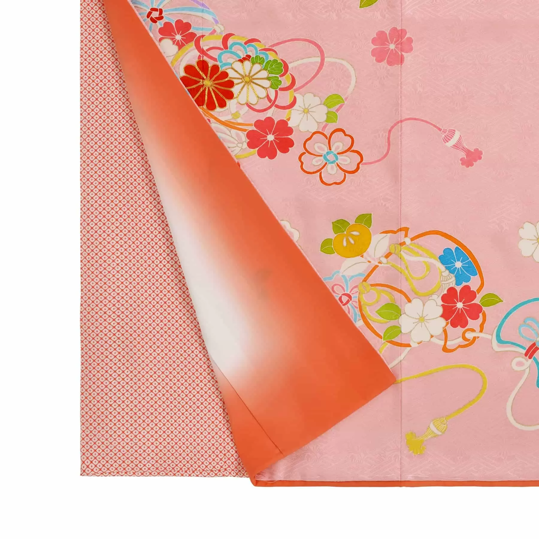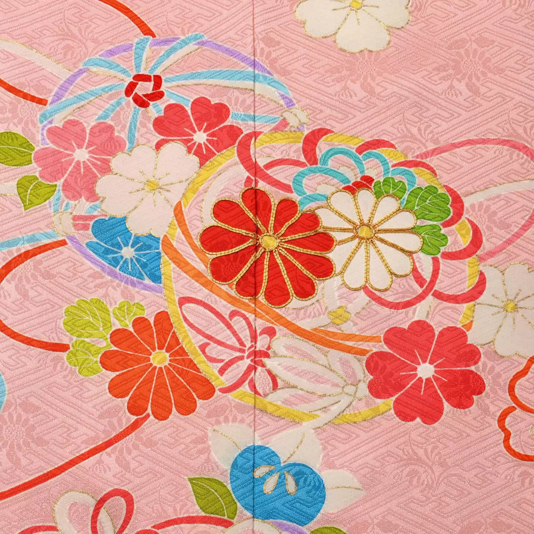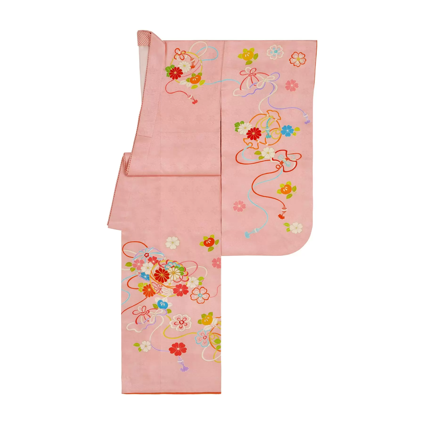 女の子の遊び道具である手毬と福をもたらす宝を、カラフルな紐で結んだ美しいデザインの祝着です。素敵な縁が繋がり、豊かで楽しい人生になって欲しいとの願いが込められています。優しいピンクの地色とた流れるような繊細な線の表現が、やわらかい印象を与えてくれる可愛らしい一枚です。