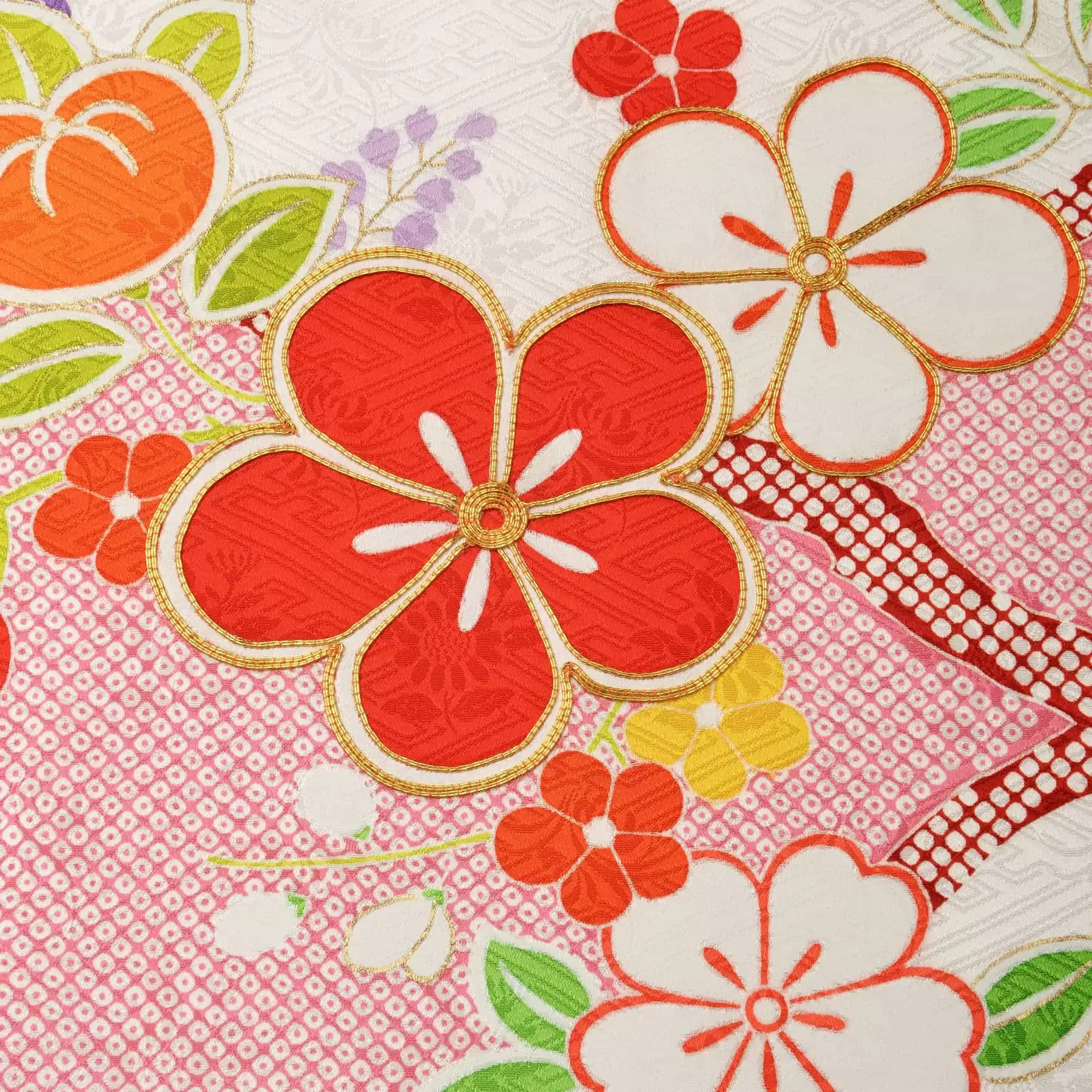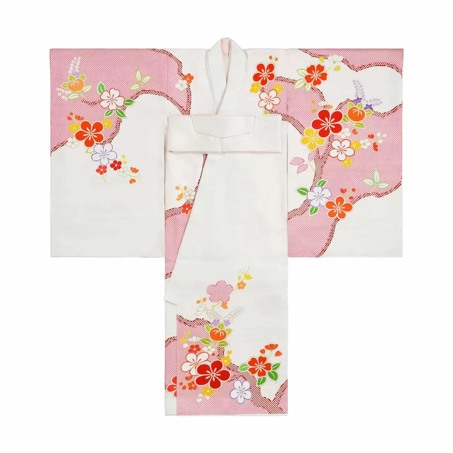 清らかな白の地色に鮮やかな赤色。紅白の色彩は、日本の古来より伝わる代表的な祝儀の色彩です。染疋田を用いて柔らかく表現された紅白の地色を、梅の伸びやかな枝ぶりを境界線にして染め分けた美しいデザインです。
