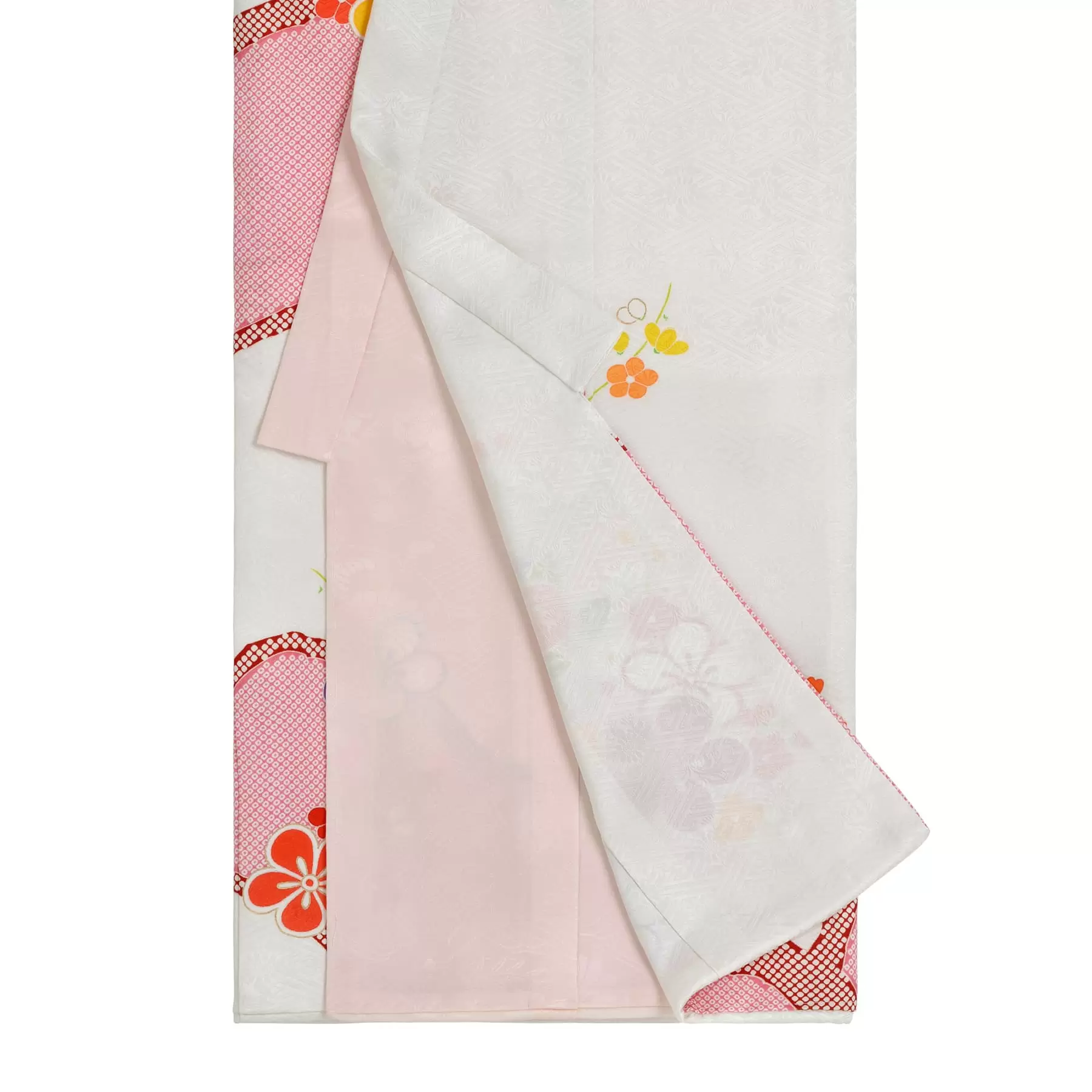 千總の初着は上着、下着とも全て正絹で作られています。下着はピンクで、お袖には赤の地色の付袖が付きとても華やかです。付け紐には紐飾りがされています。