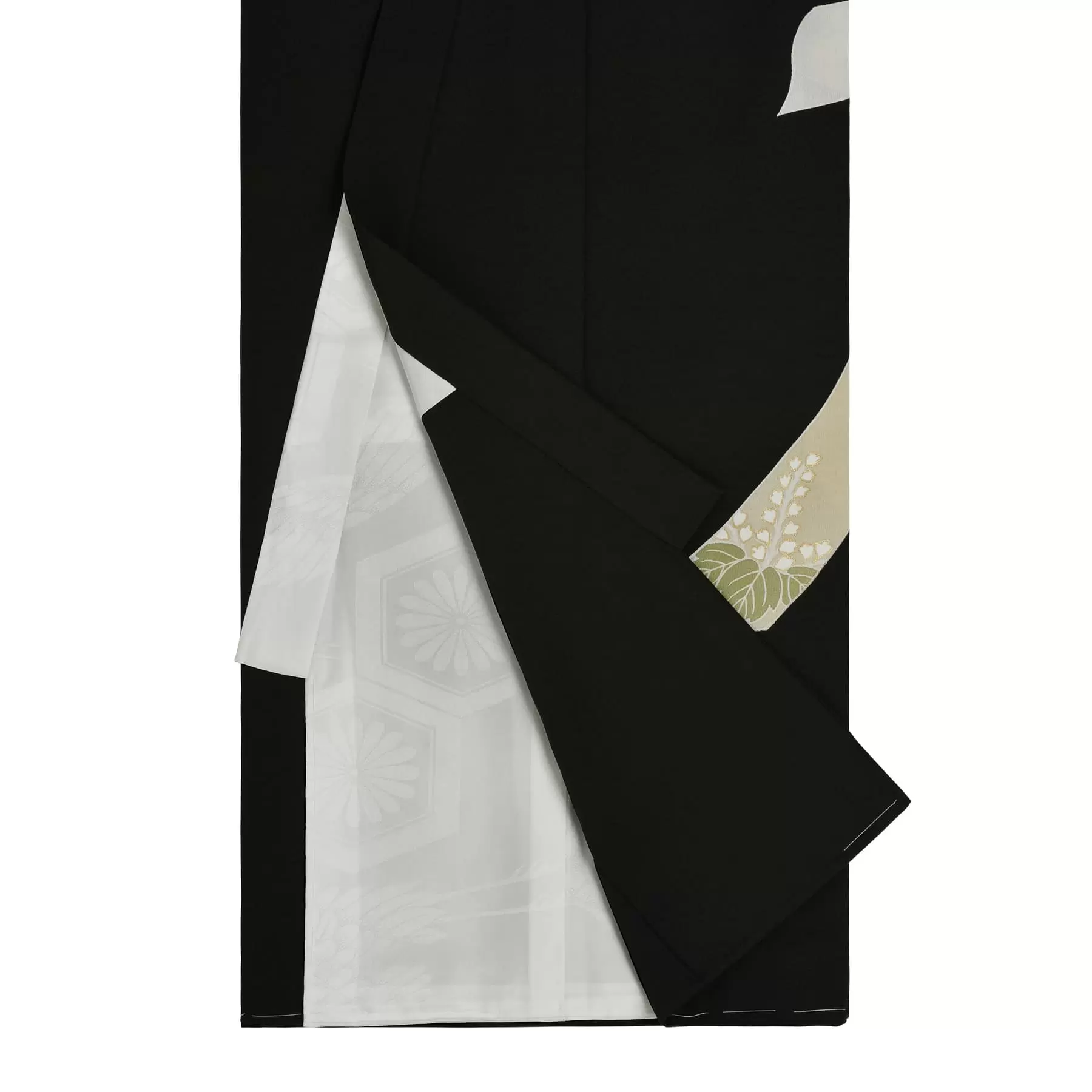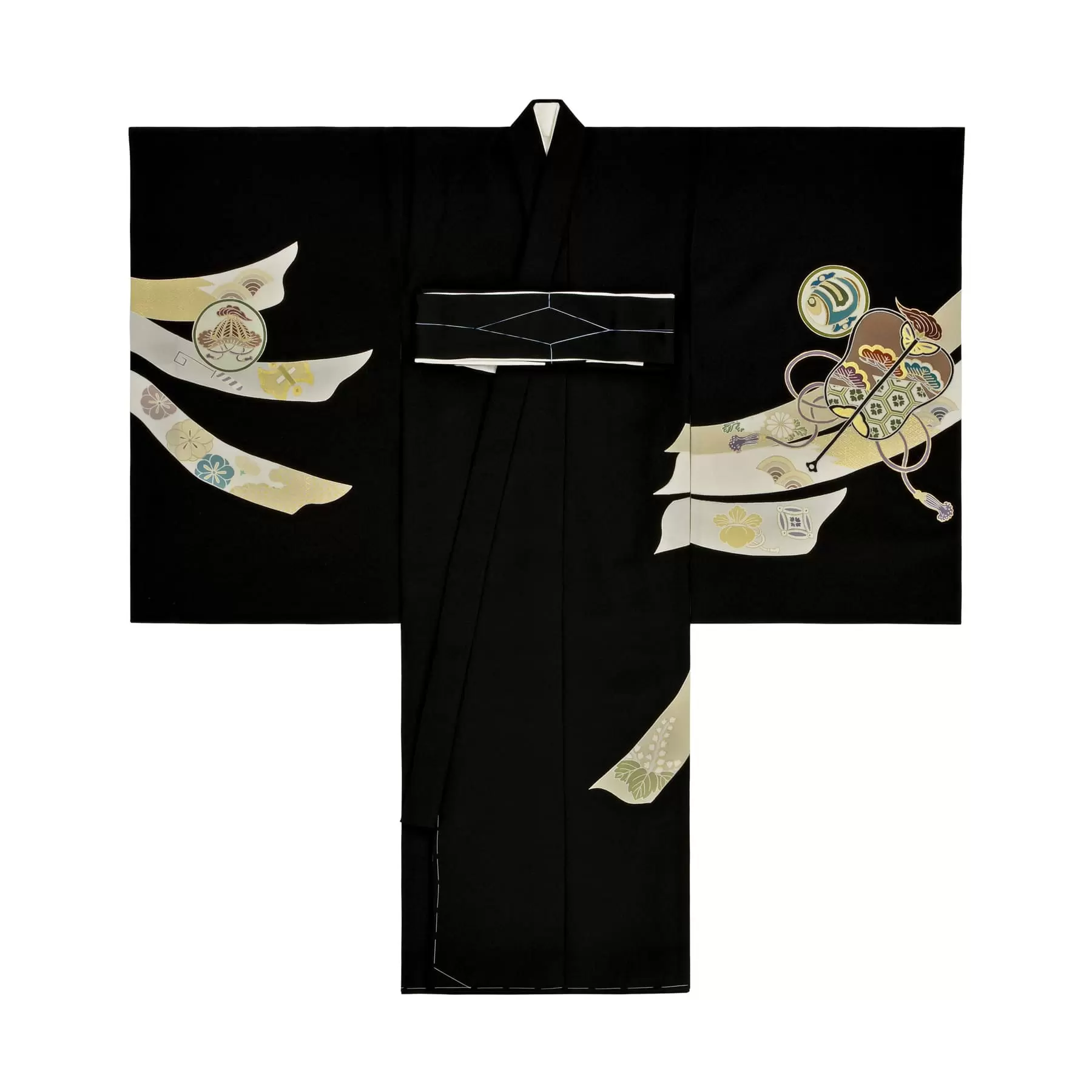 千總の初着は上着、下着ともに全て正絹で作られています。下着は白で、お袖にはブルーの地色の付袖が付いており、広袖にてお仕立てをしております。付け紐には紐飾りがされています。紋を入れてお届けいたします。