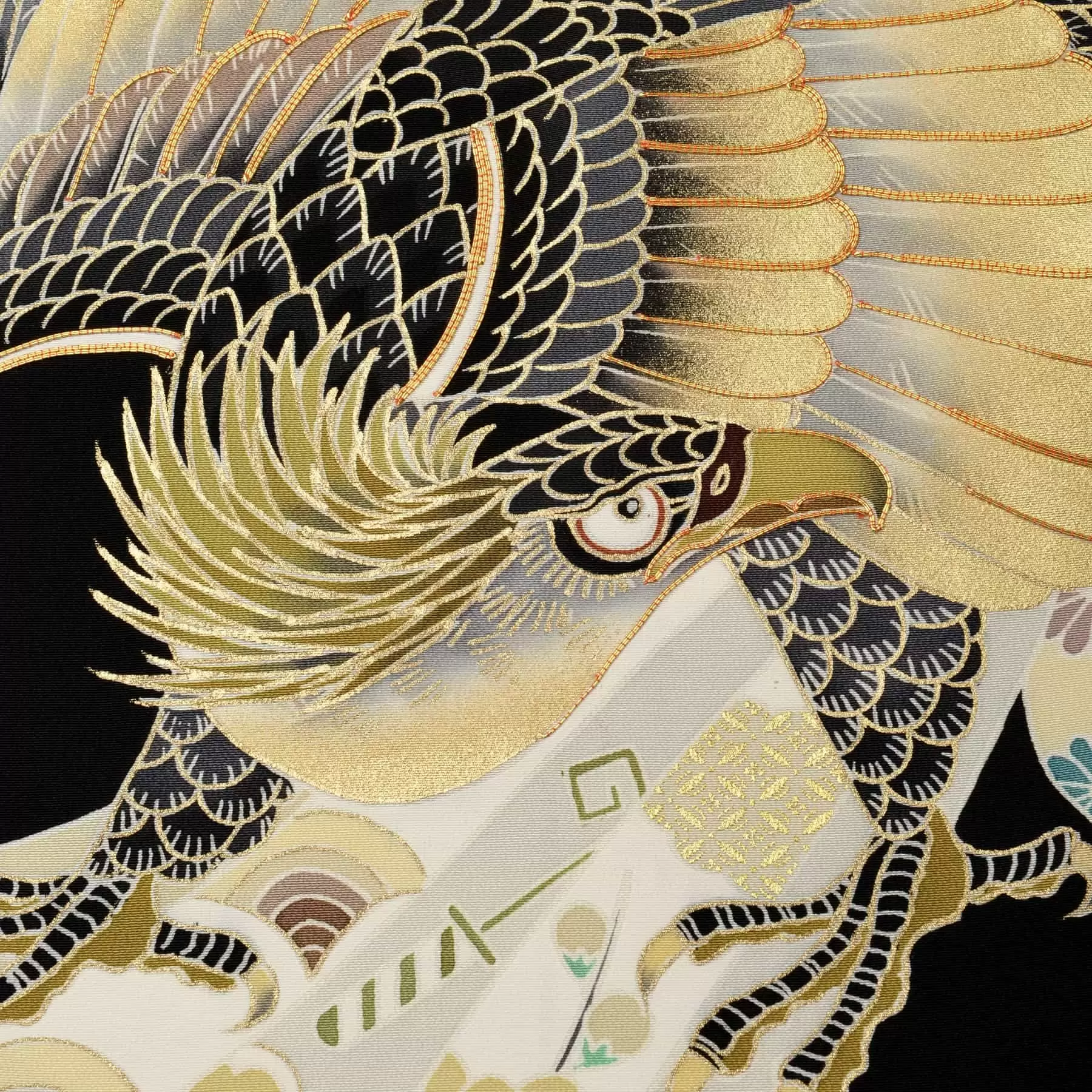 大胆にデザインされた束ね熨斗に勇壮な鷹を組み合わせました。鷹は空高く飛び千里眼の眼光で狙いを定め鋭い爪で決して逃さないといわれるように、聡明さや幸運を掴むという願いが込められた吉祥文様。幸せが集まってきますようにという意味をもつ束ね熨斗紋様と組み合わせることで、鷹のもつ聡明さが大きく広がりますようにとの願いが込められています。
