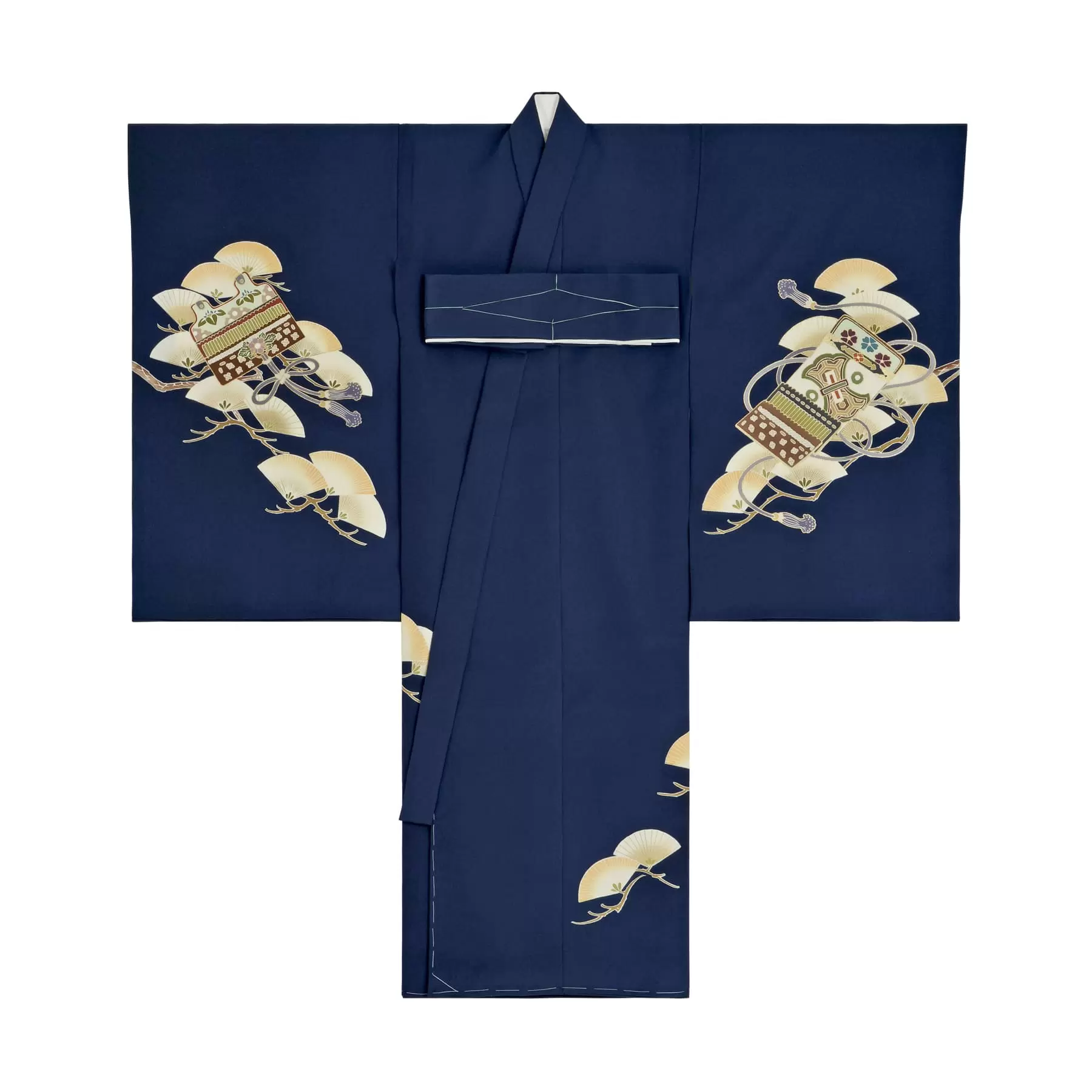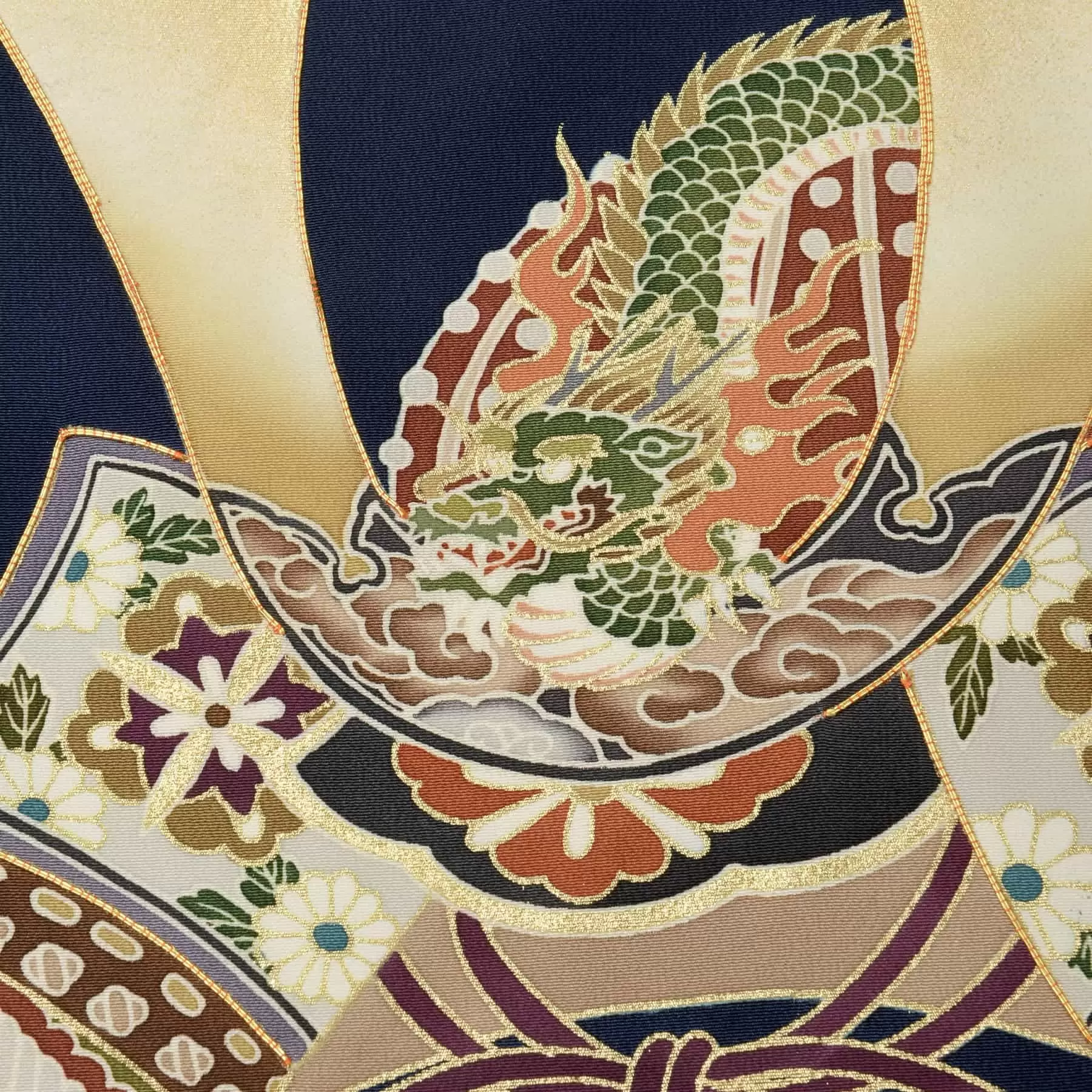 深みのある美しい青の地色に、兜を大きく描き出しました。武家の家宝である兜は、男の子に求められる勇ましさを表し、身を守る要になるものとして、厄除けと繁栄の願いが込められています。