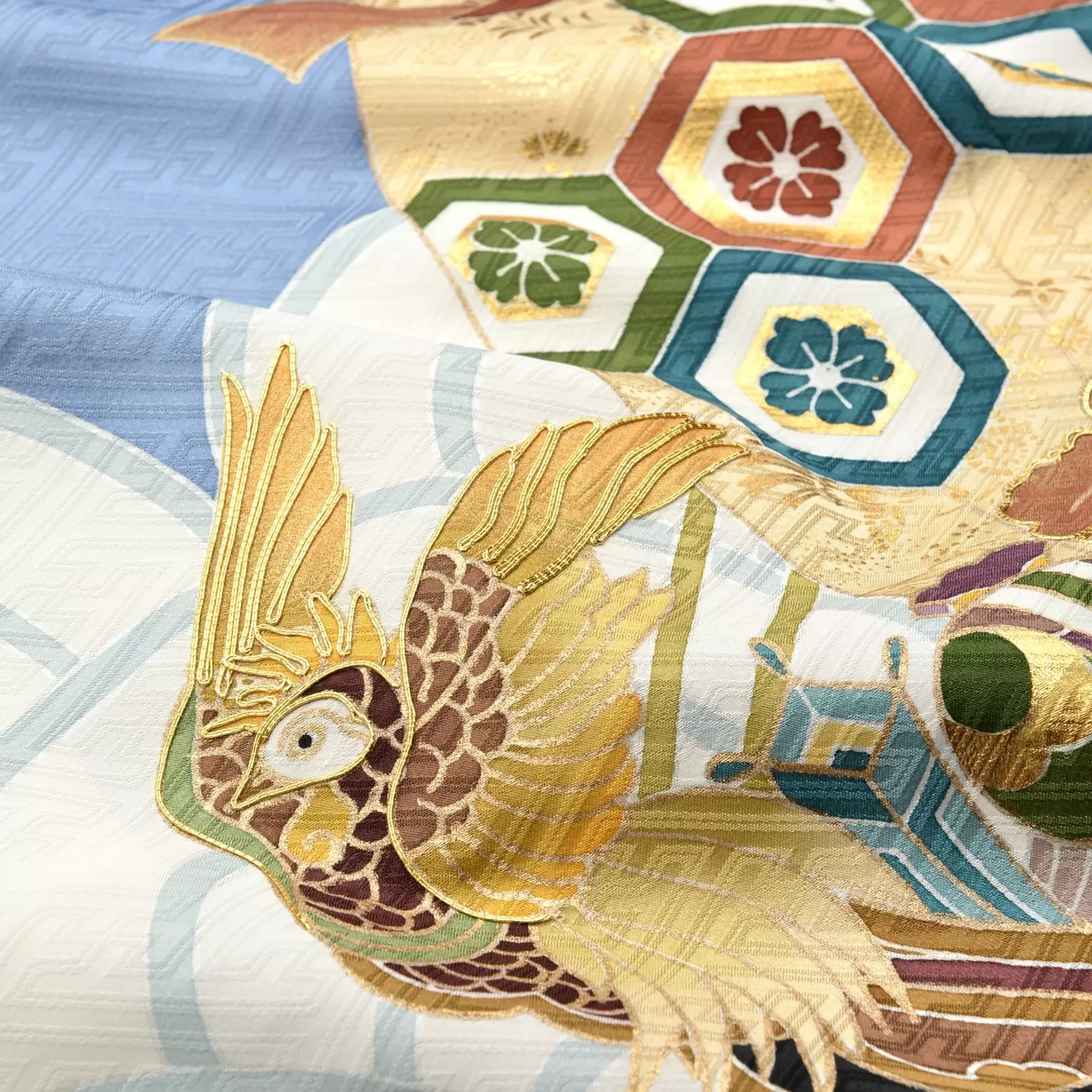 淡いグレーが入った落ち着いた水色がとても綺麗な祝着です。連続する青海波を横段に描き、風を受けて力強く進む宝船を描きました。青海波は幸せをもたらす大海原を、米俵や宝物を積んだ宝船は財を表す吉祥文様。これからの人生が順風満帆でありますようにとの願いを込めた一枚です。