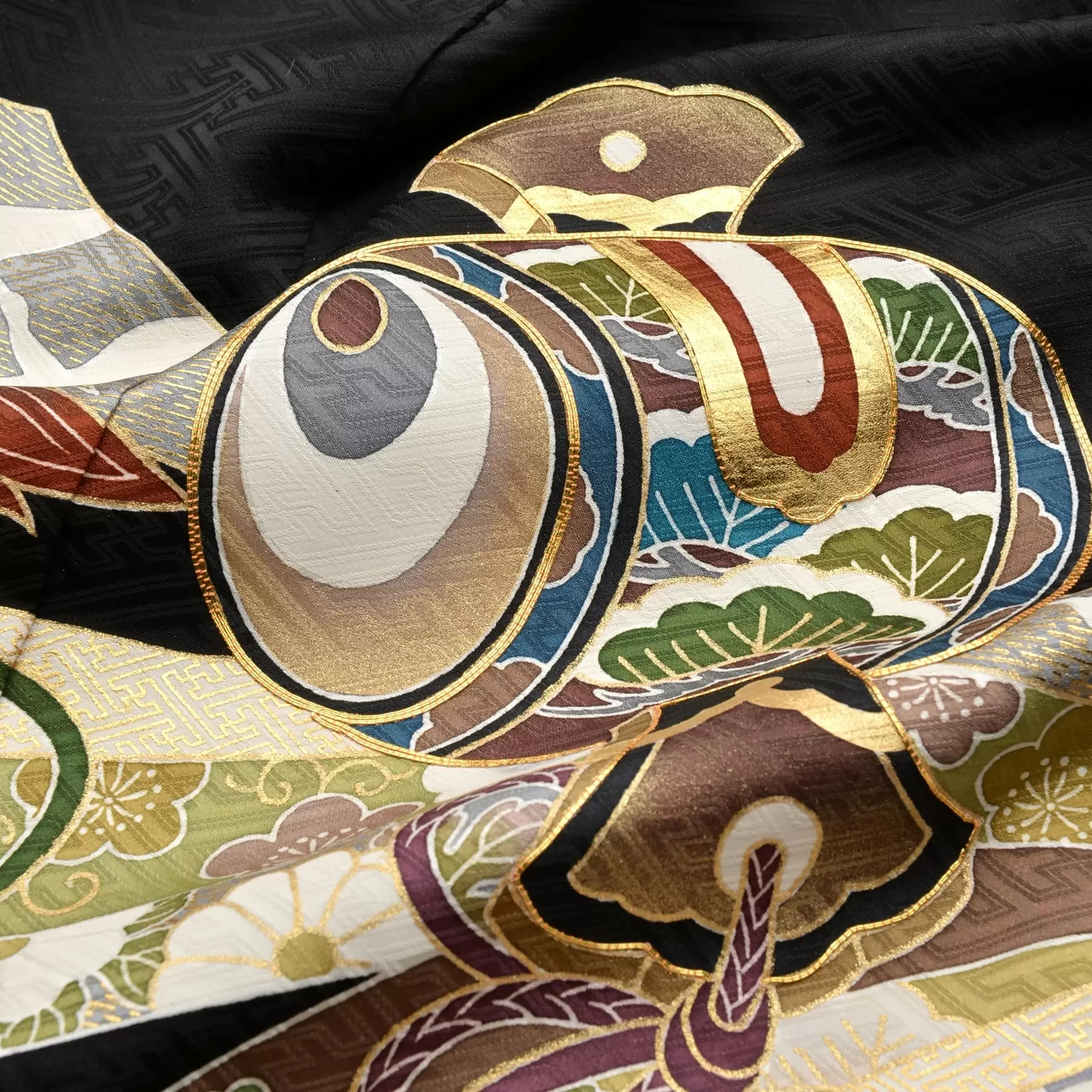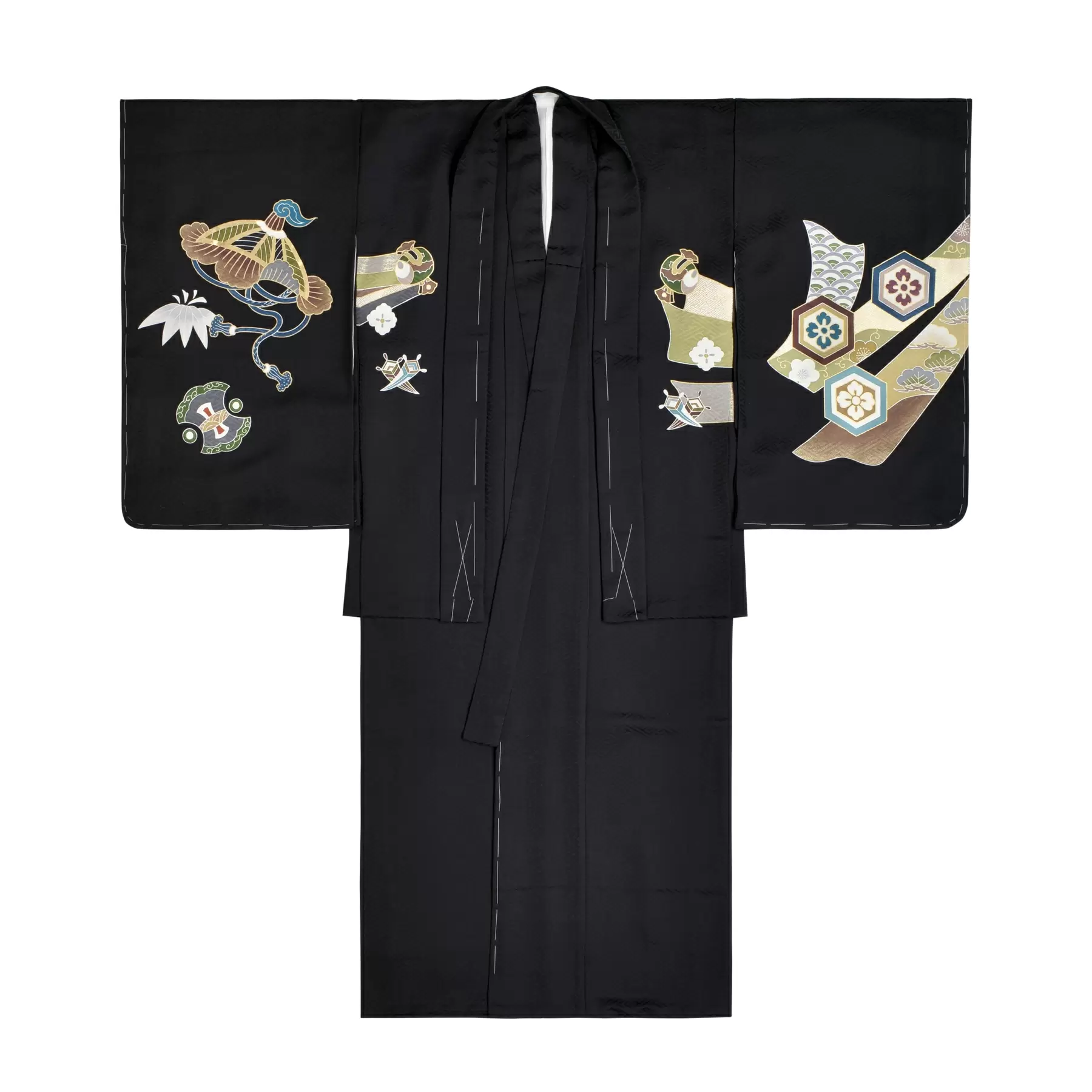 羽織全体に描かれた、力強く大胆に広がる熨斗がポイントでです。多くの幸せを集めてくるといわれるおめでたい熨斗の柄に、縁起の良いものを集めて福徳を呼ぶ宝尽くしを組み合わせました。これからの人生が万事順調になるようにとの願いが込められています。