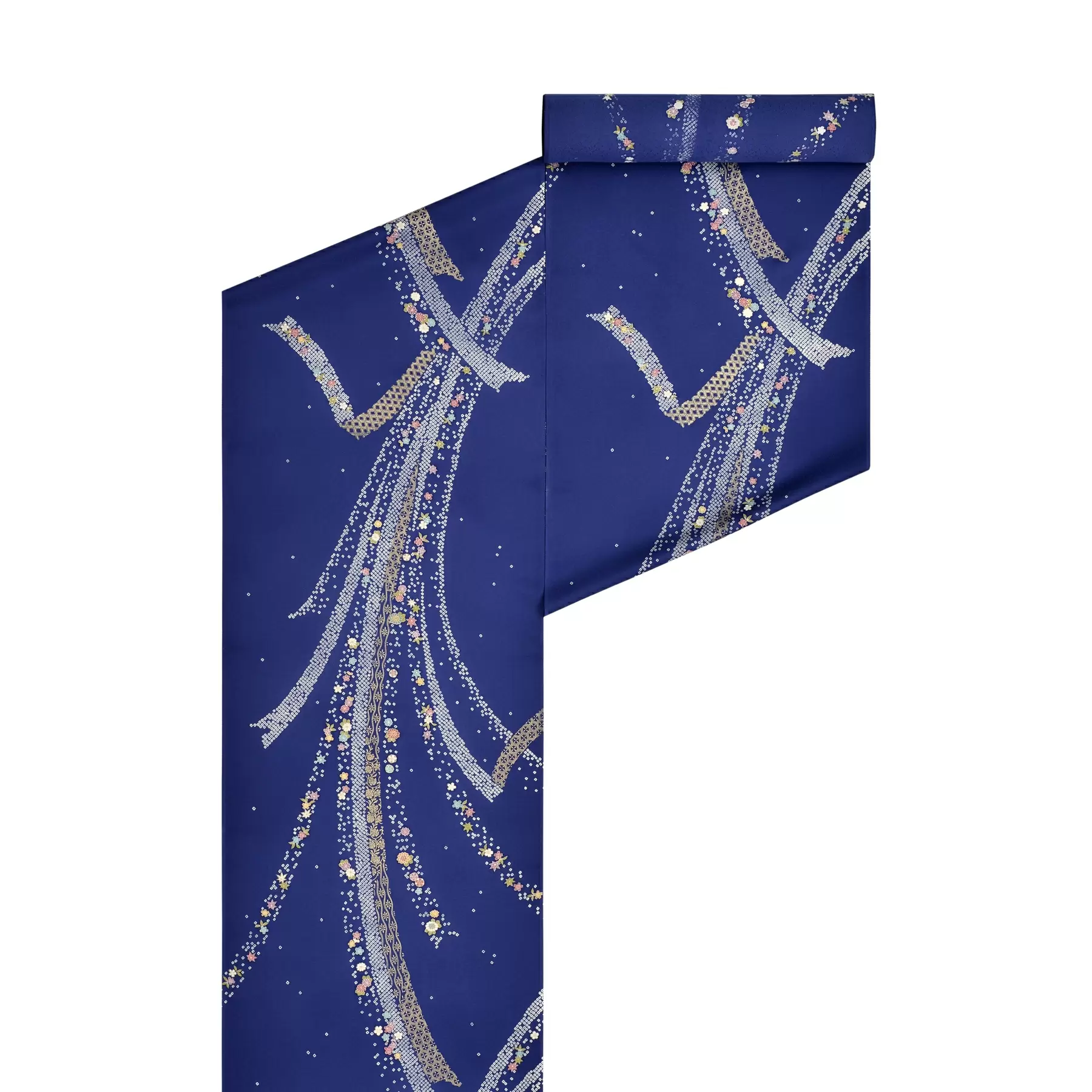 くすみのない綺麗なブルーの地に、ダイナミックに描かれた熨斗柄が、華やかさと躍動感を演出しています。熨斗の一つ一つには、細やかな疋田と草花で可愛らしさを加えました。お召しの場を華やかに盛り上げてくれる一枚です。