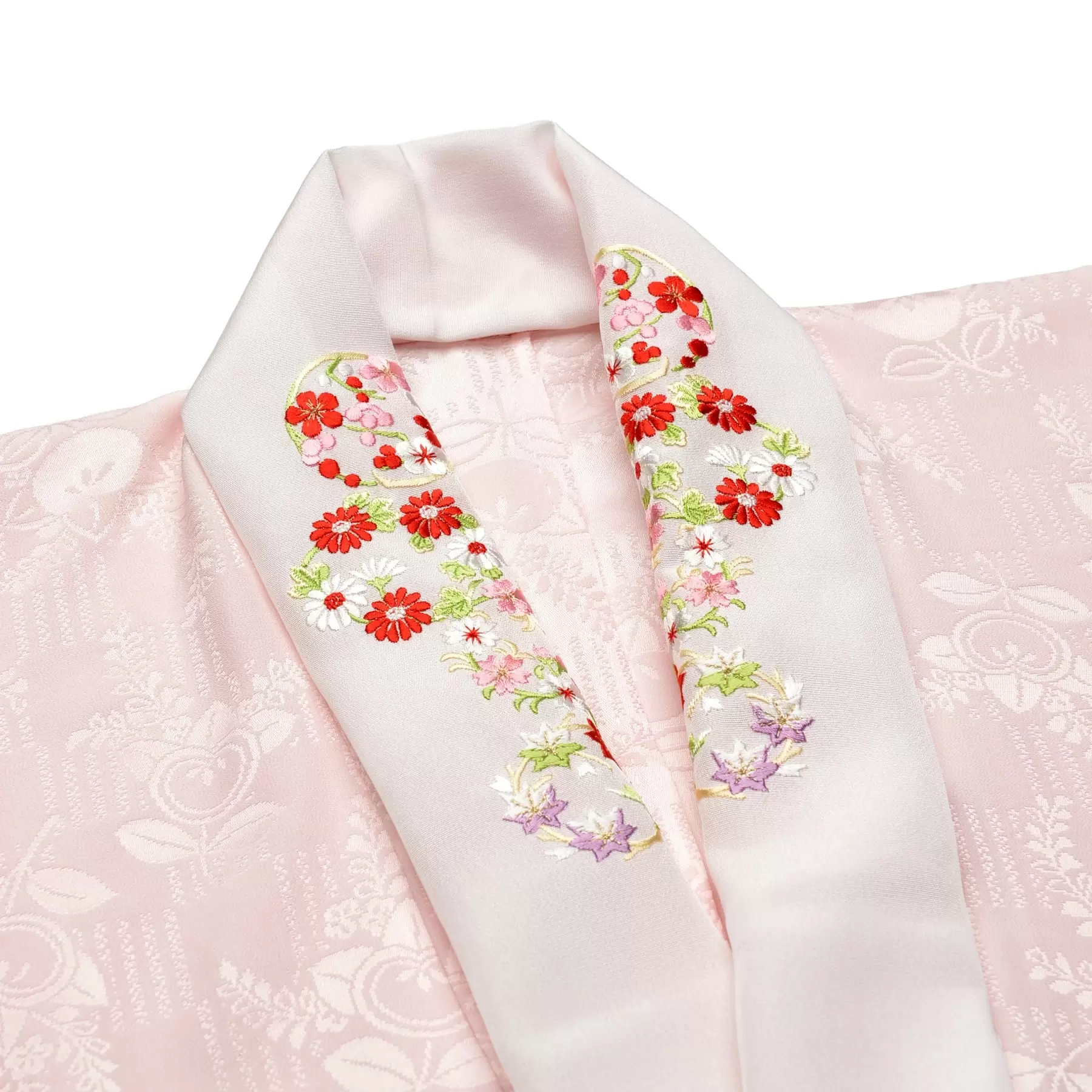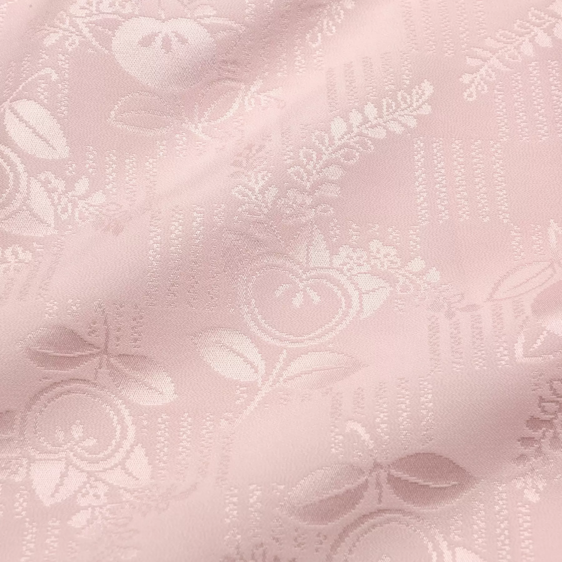 柔らかくしなやかな風合いで光沢がある紋綸子の生地を、透明感のある桃色に染めました。愛らしい橘の地紋がリズミカルに織り上げられています。橘は不老長寿の意味合いを持ち、幸せが実るとされる吉祥文様。実り多きご成長をと願いが込められています。